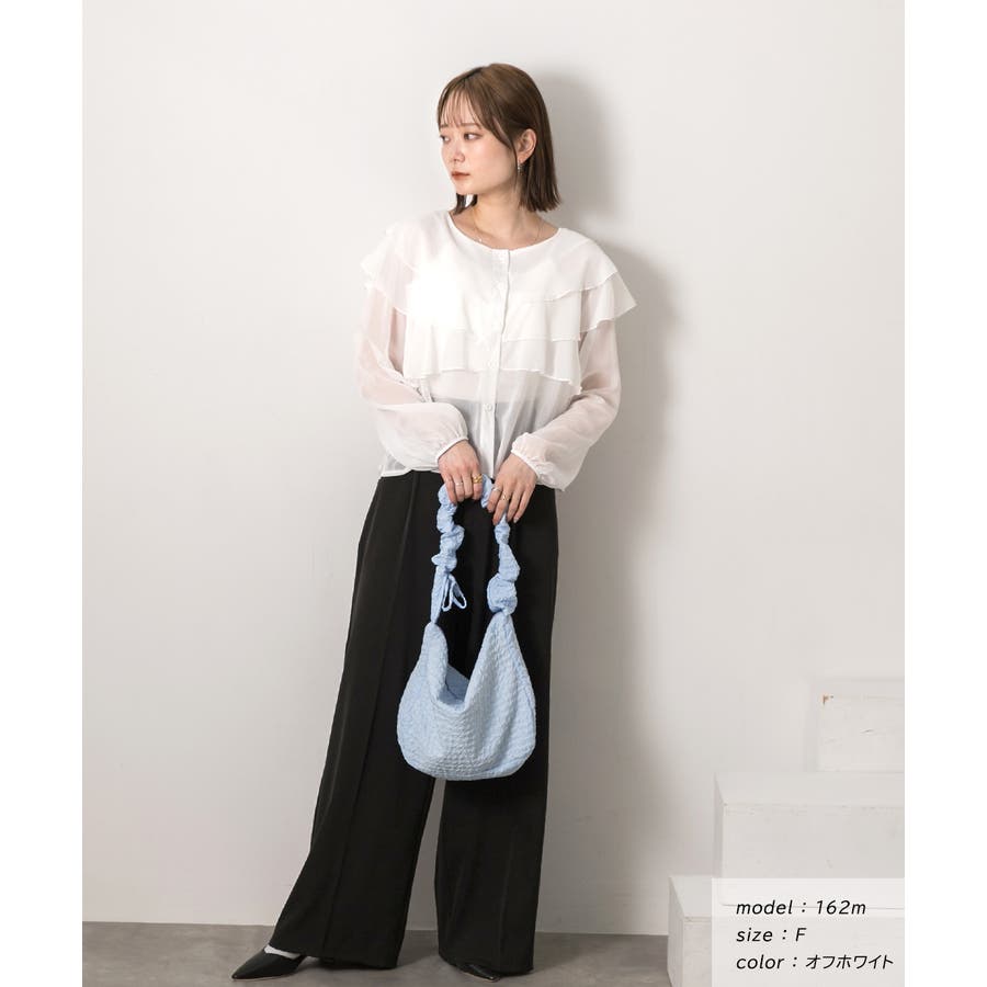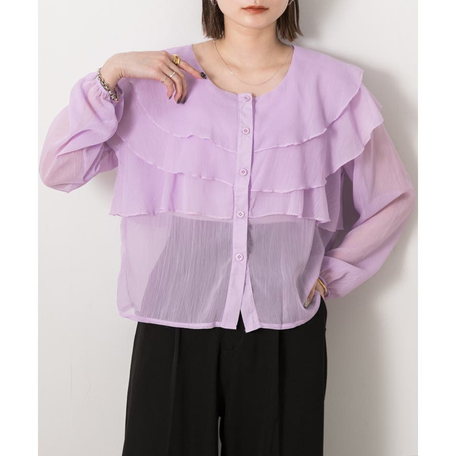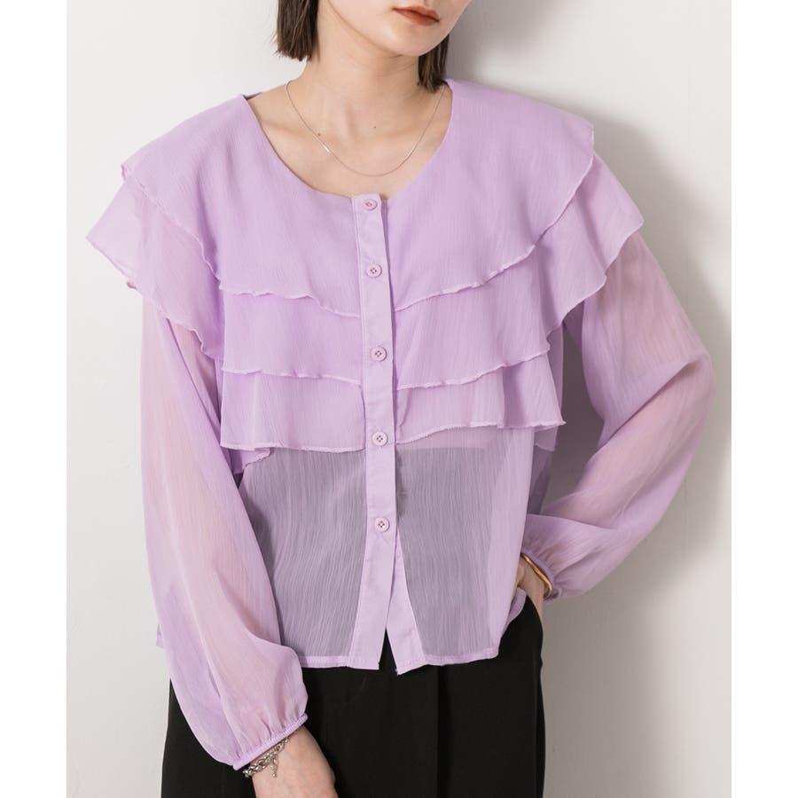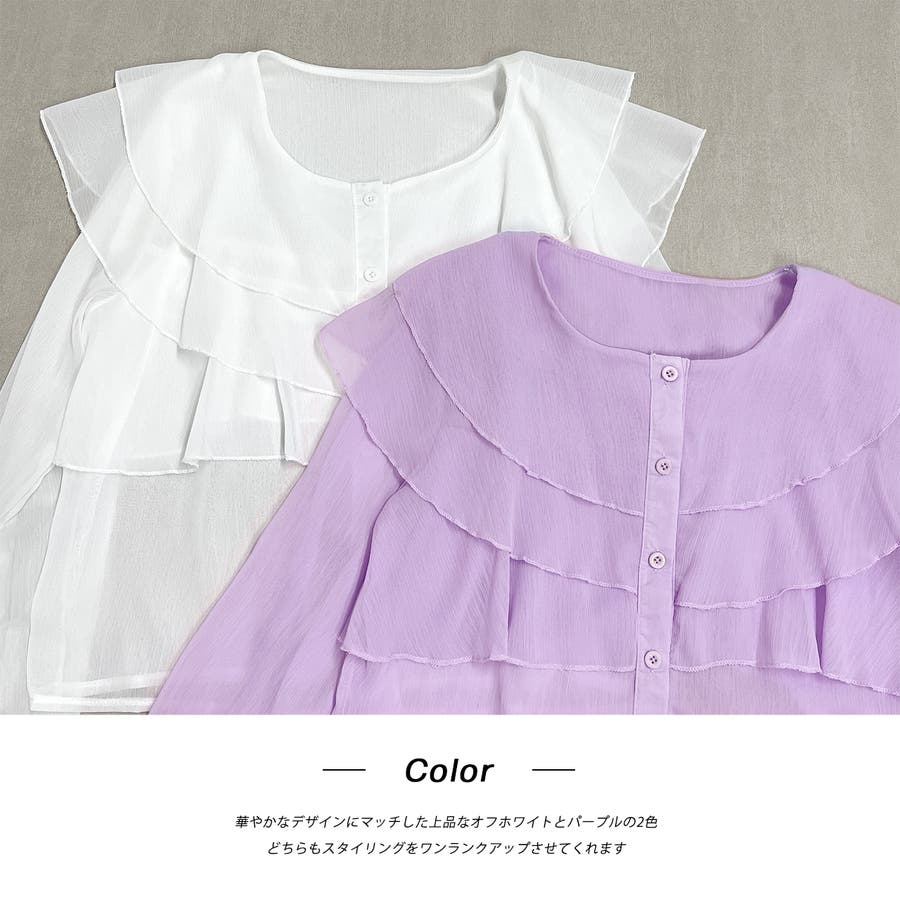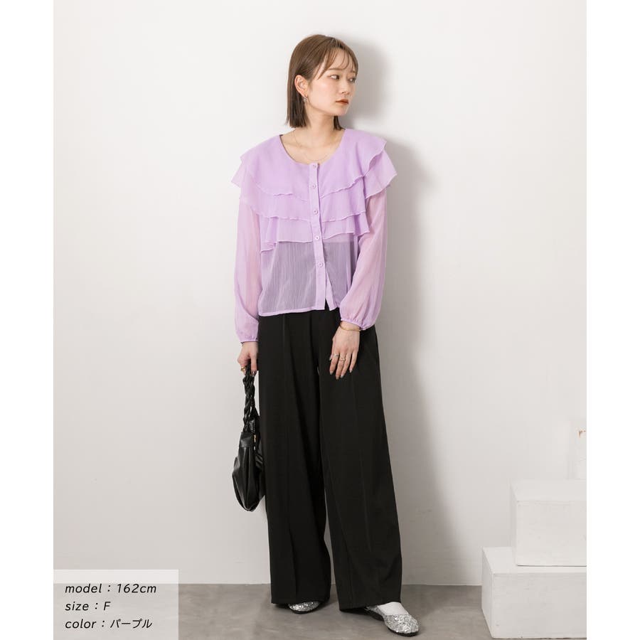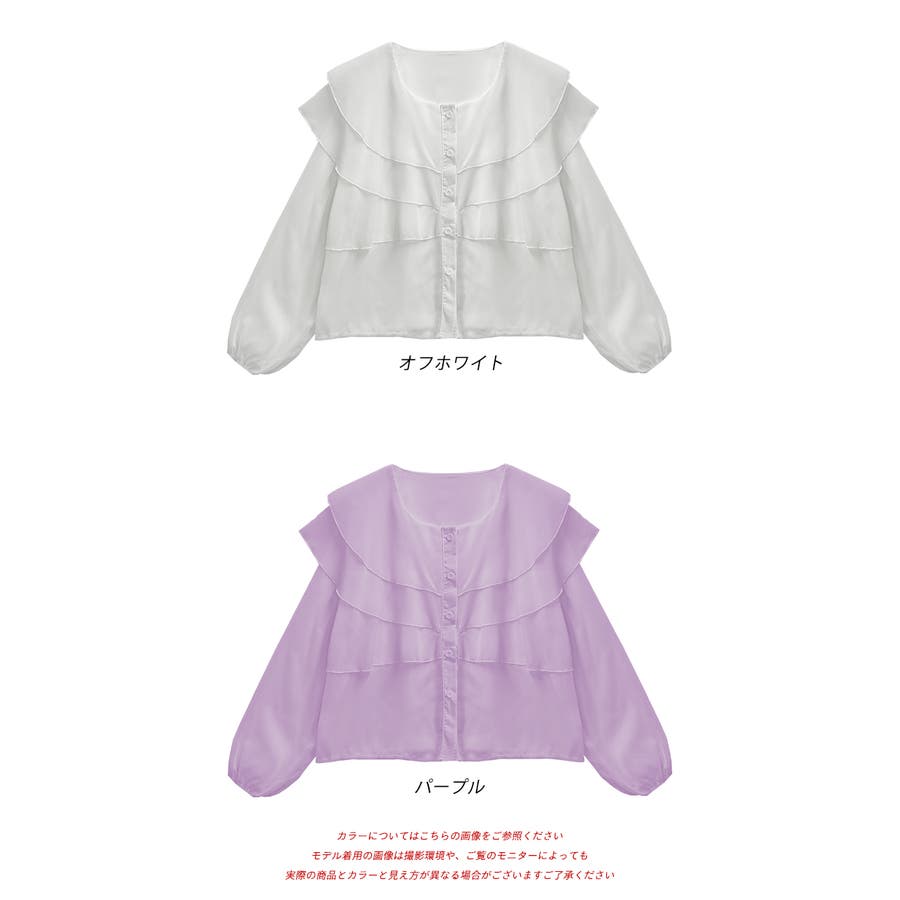春 春コーデ 春ファッション 春服 夏 夏コーデ 夏ファッション 夏服 カジュアル カジュアルコーデ 大人 大人カジュアル オフィスカジュアル オフィス オフィスファッション オフィススタイル 韓国 韓国ファッション 韓国コーデ プチプラ プチプラファッション レディース Y2K 量産型 キレイめ 綺麗め きれい きちんと レイヤード シアー シアーシャツ ブラウス フリル フリルブラウス ティアード 無地 透け感 透け 袖ギャザー フロントボタン オフホワイト 白 パープル