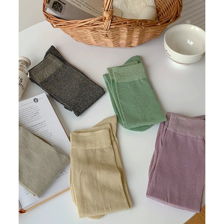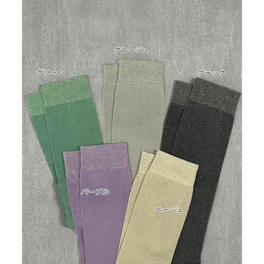 春 春コーデ 春ファッション 春服 夏 夏コーデ 夏ファッション 夏服 カジュアル カジュアルコーデ 大人 大人カジュアル オフィスカジュアル オフィス オフィスファッション オフィススタイル 韓国 韓国ファッション 韓国コーデ プチプラ プチプラファッション レディース Y2K 量産型 キレイめ 綺麗め きれい きちんと 靴下 くつした くつ下 ラメ ラメソックス ラメくつした ラメ靴下 バレエコア 総ラメ きらきら キラキラ ニュアンスカラー グリッター ゴールドラメ 金 金色 ラメハイソックス ハイソックス 冷房対策 冷え対策 グレージュ 黒 ブラック ベージュ グリーン パープル