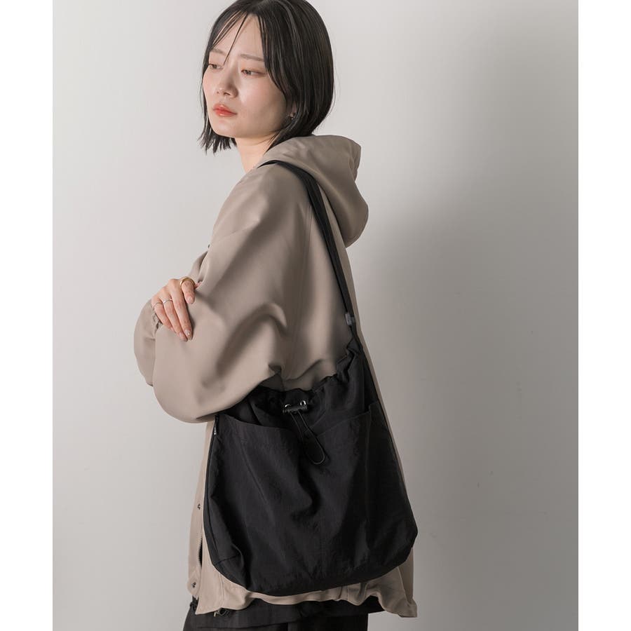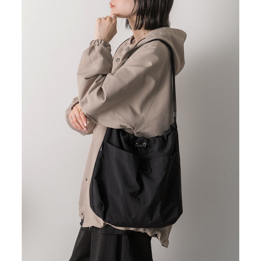 シンプルデザインに、トレンドのドロストコードがポイントになる軽量ショルダーバッグ