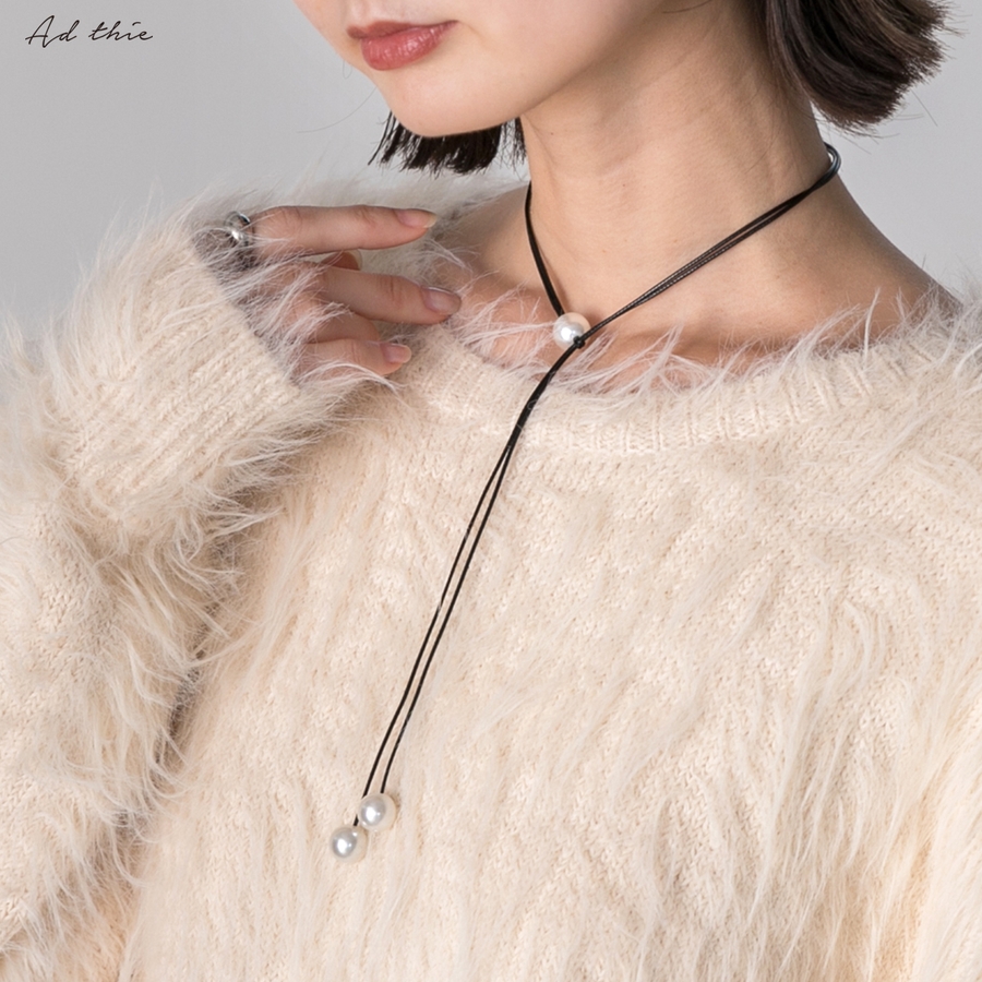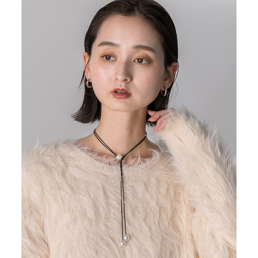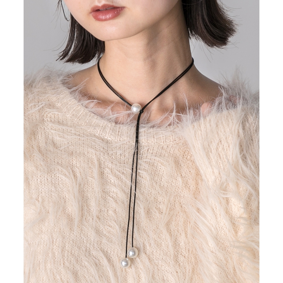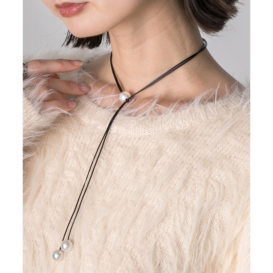 程よい大きさの上品なフェイクパールとレザータッチのコードがコーディネートのアクセントに