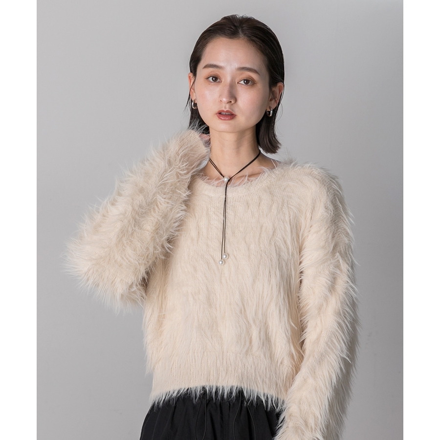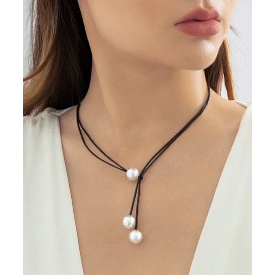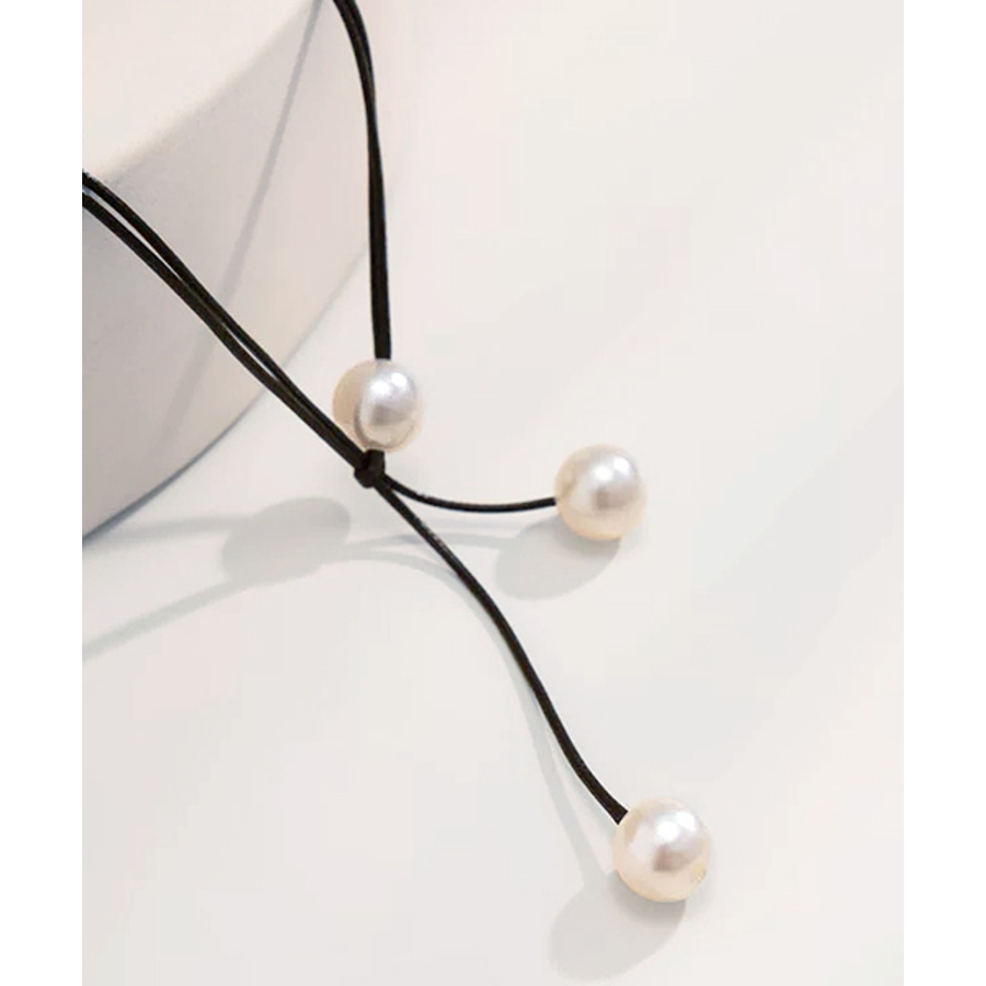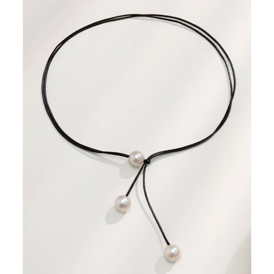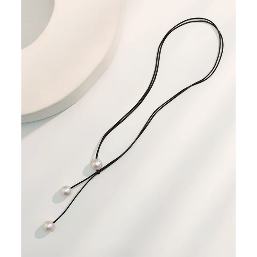 程よい大きさの上品なフェイクパールとレザータッチのコードがコーディネートのアクセントに