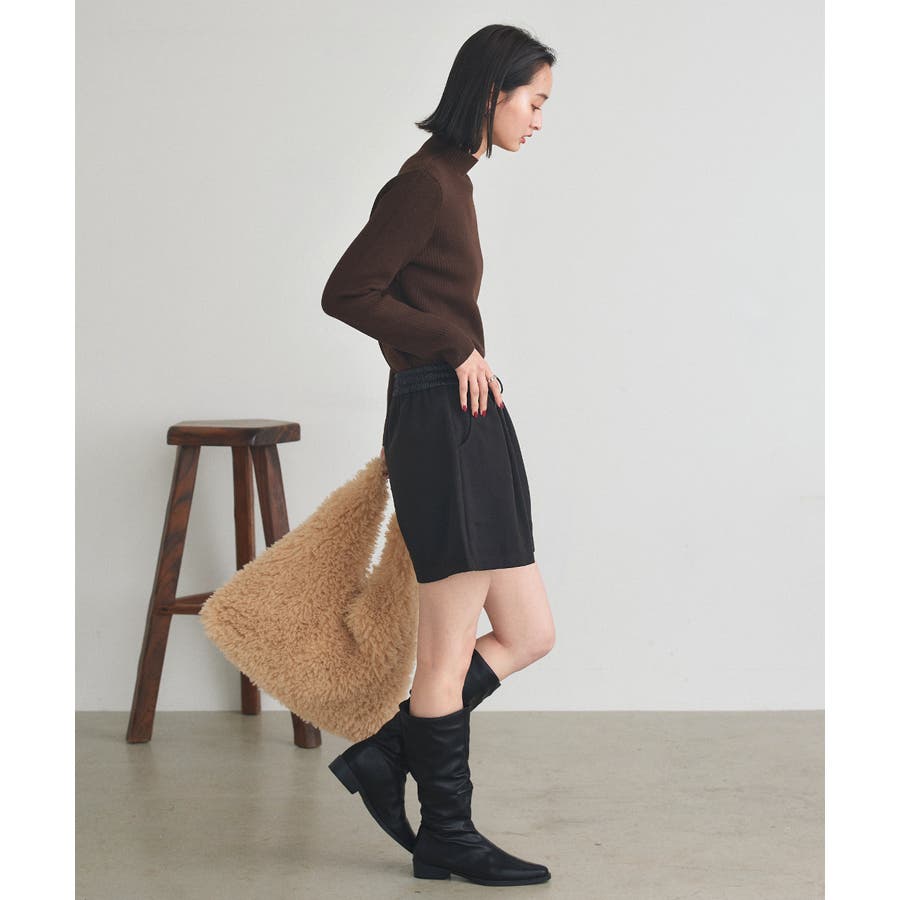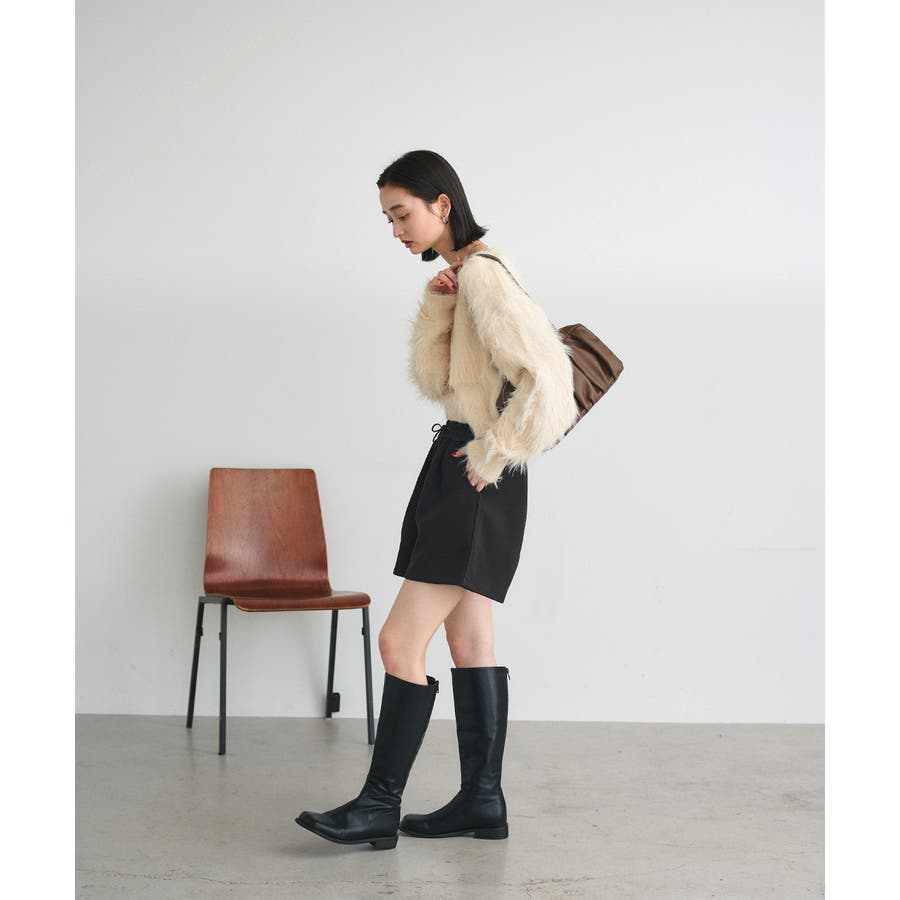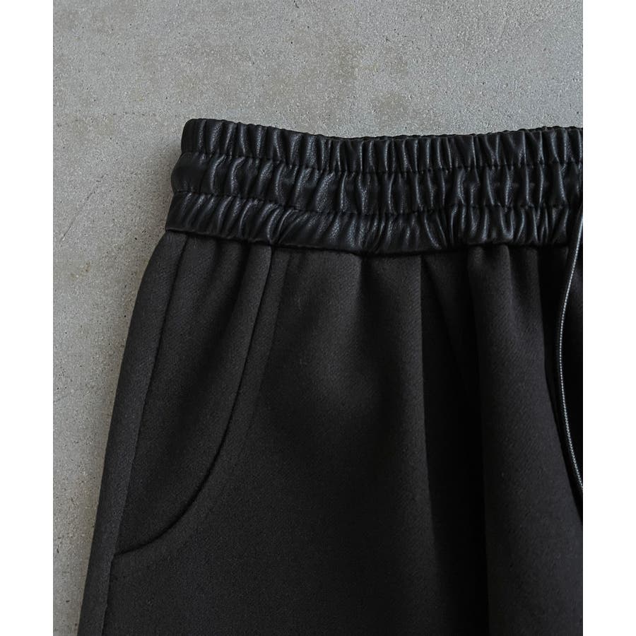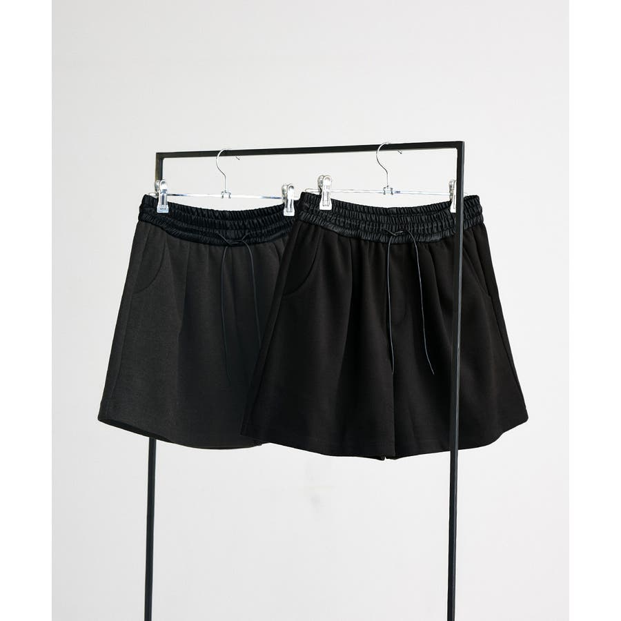 やわらかで上品な光沢のある合成皮革のウエスト切替とドロストコードがポイントになるデザイン。