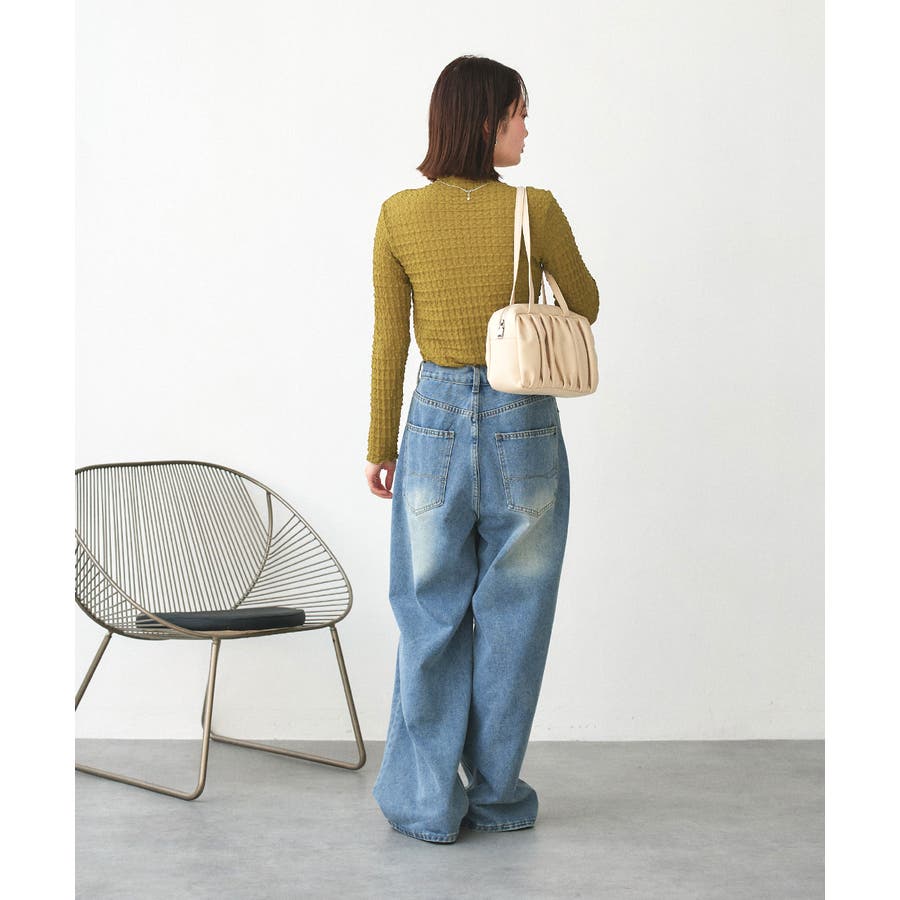 細身シルエットなのでボトムスはゆったりとしたワイドデザインのものを選んで