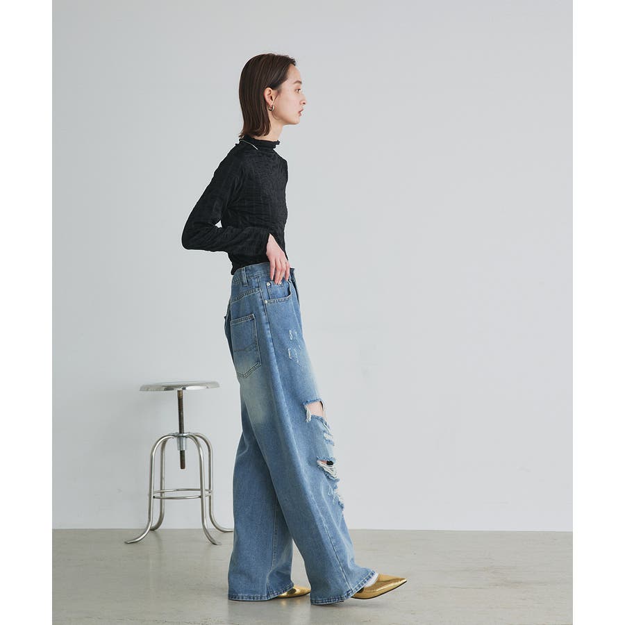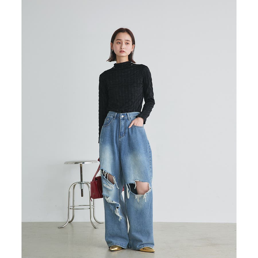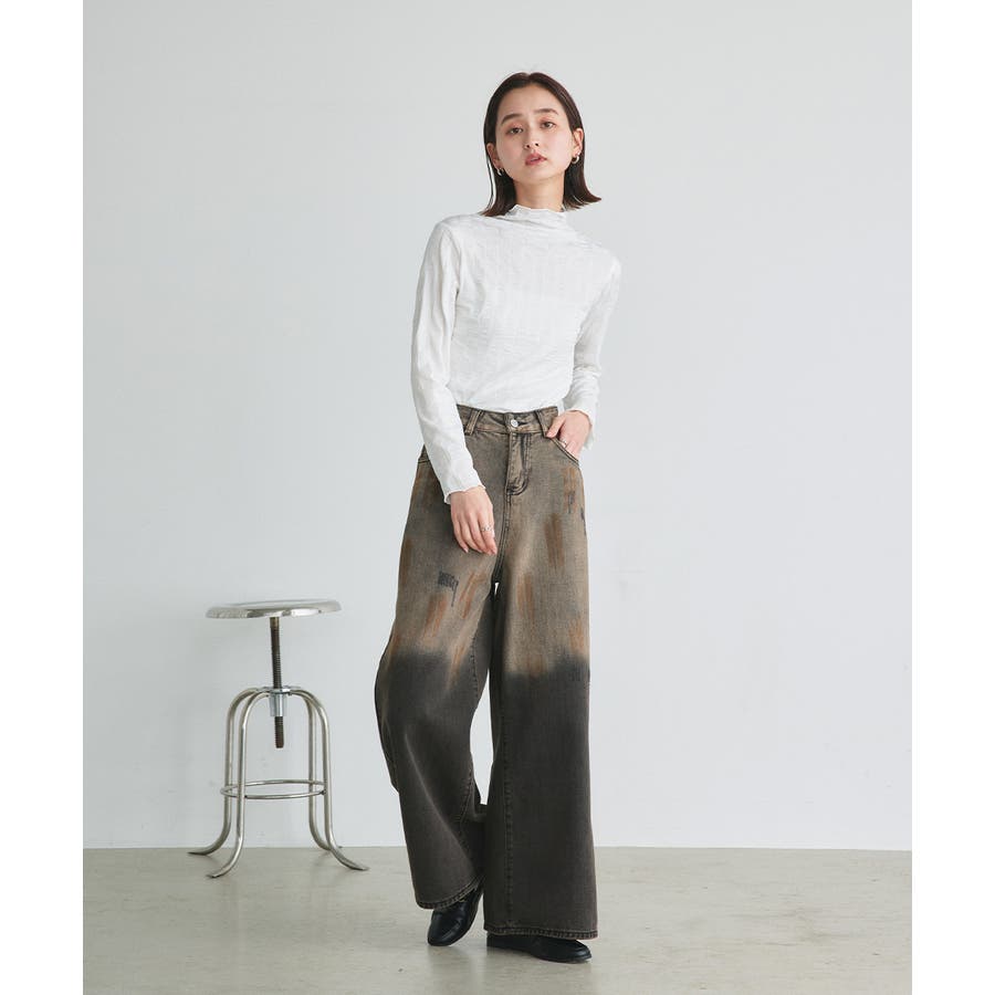 細身シルエットなのでボトムスはゆったりとしたワイドデザインのものを選んで
