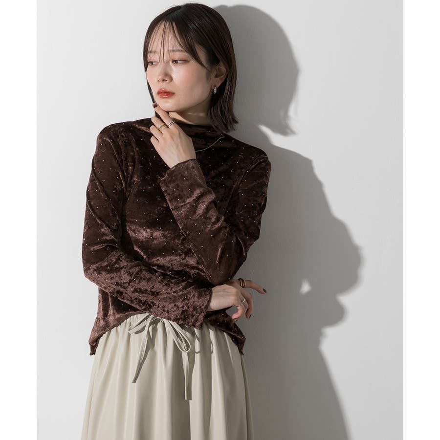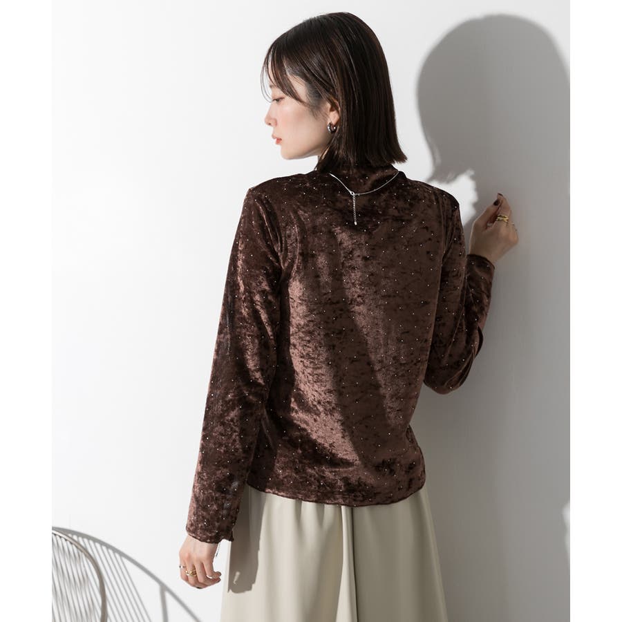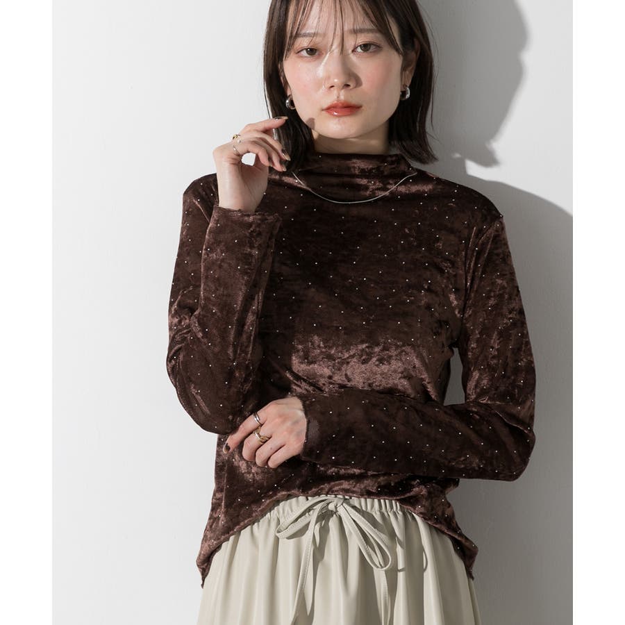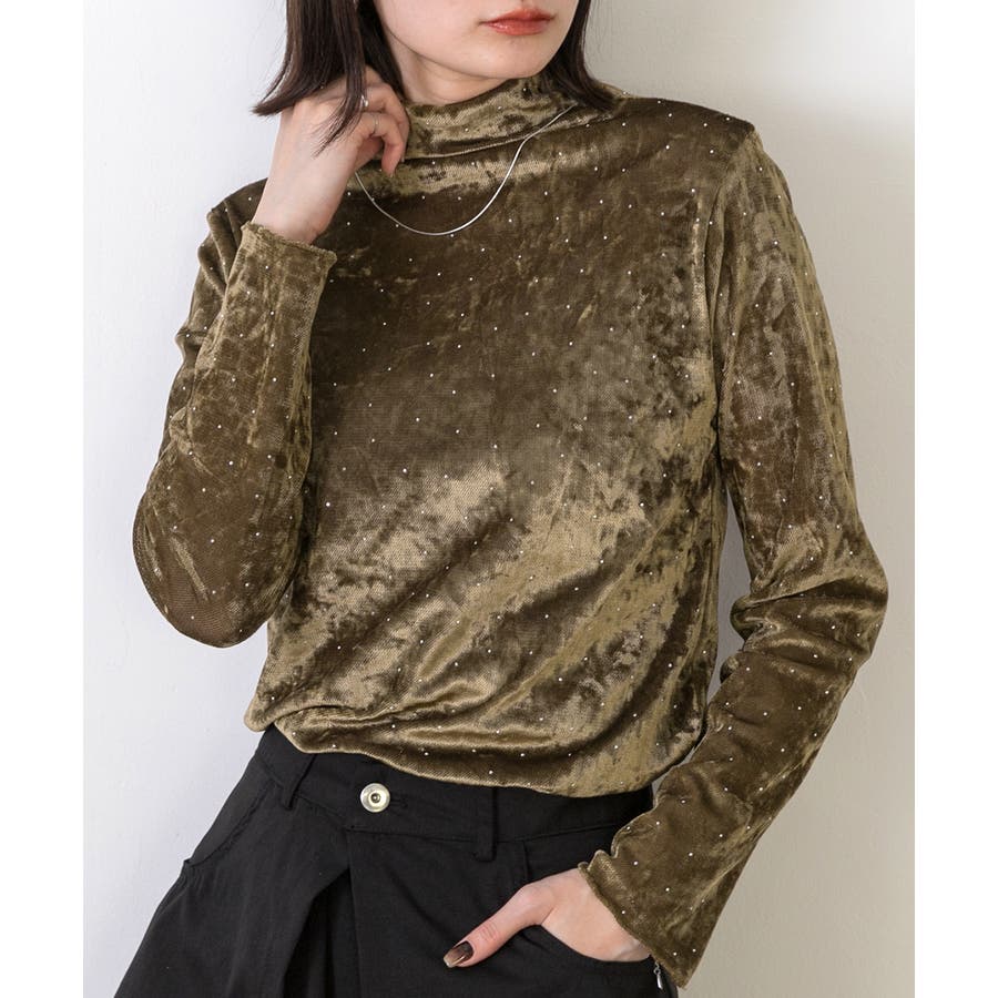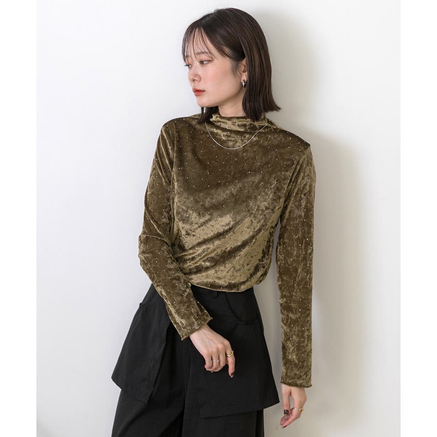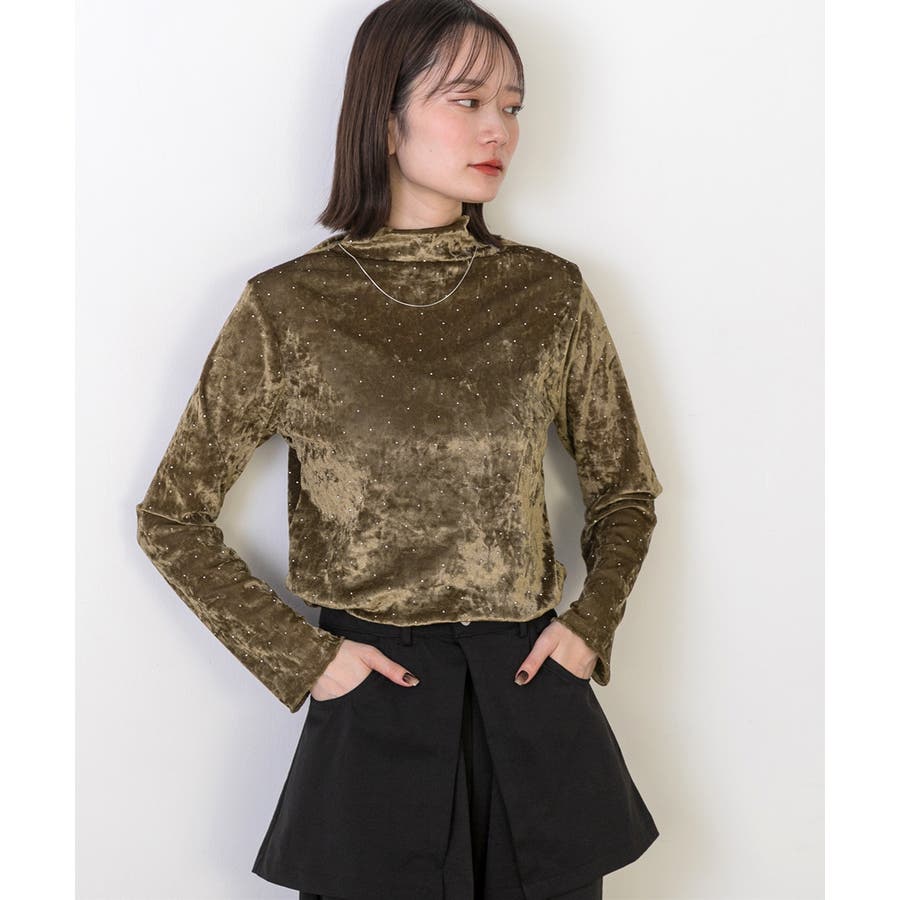 季節感のあるベロア生地と派手すぎない控えめラインストーンがコーディネートを華やかにしてくれるハイネックトップス。