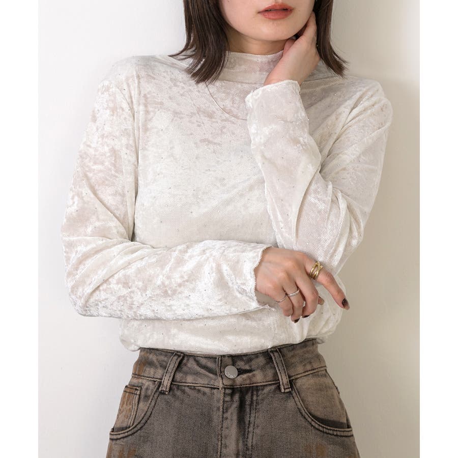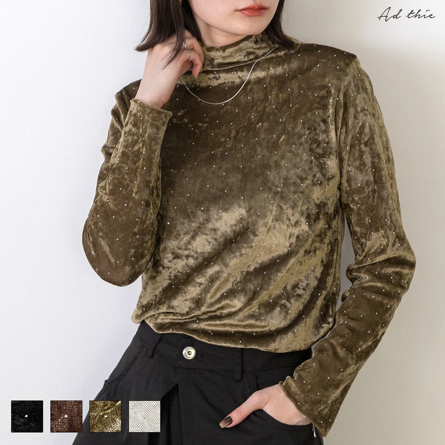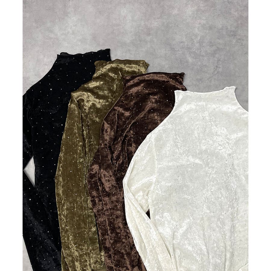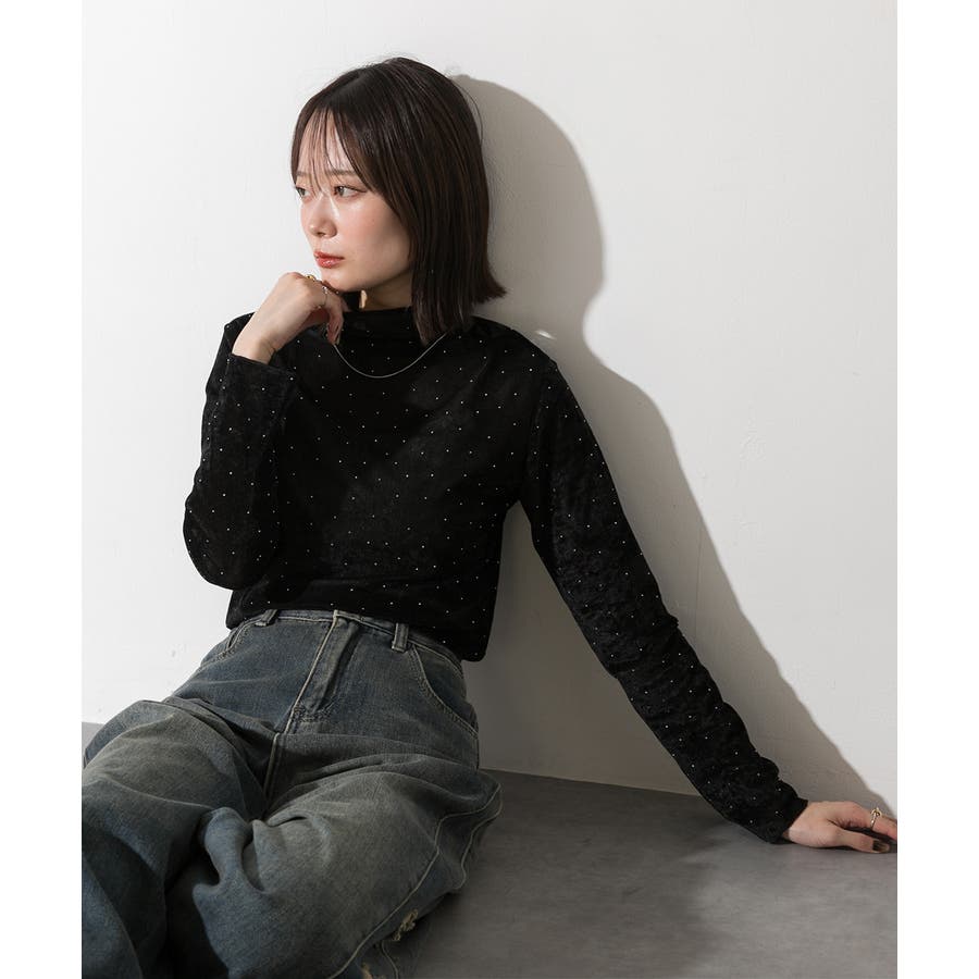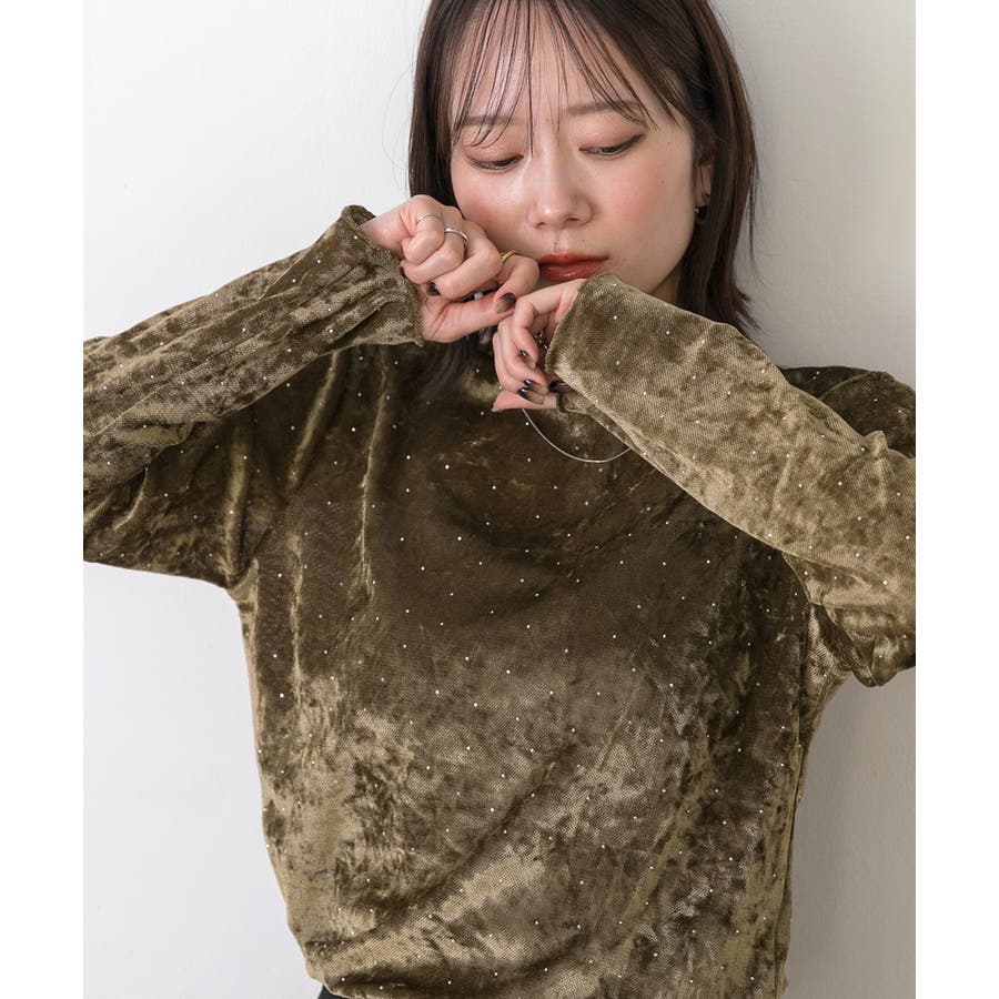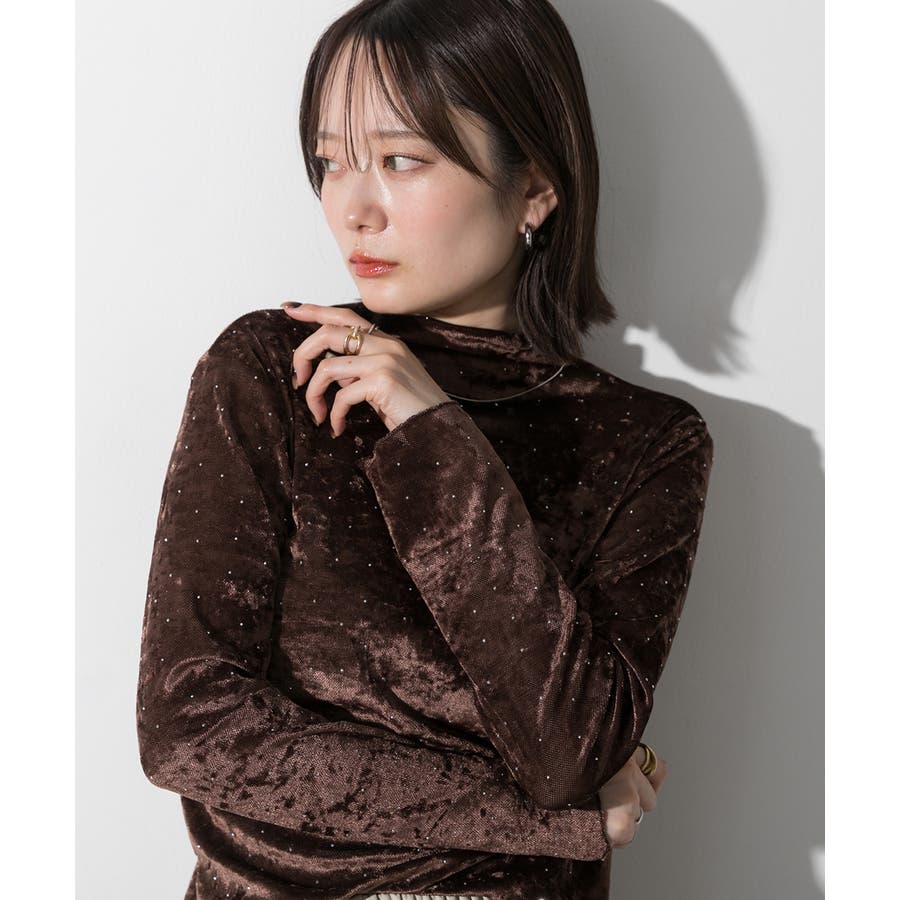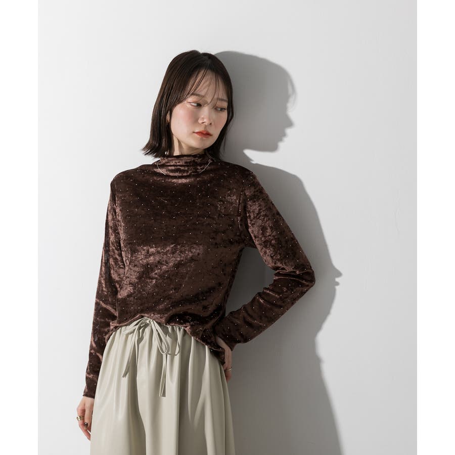 季節感のあるベロア生地と派手すぎない控えめラインストーンがコーディネートを華やかにしてくれるハイネックトップス。