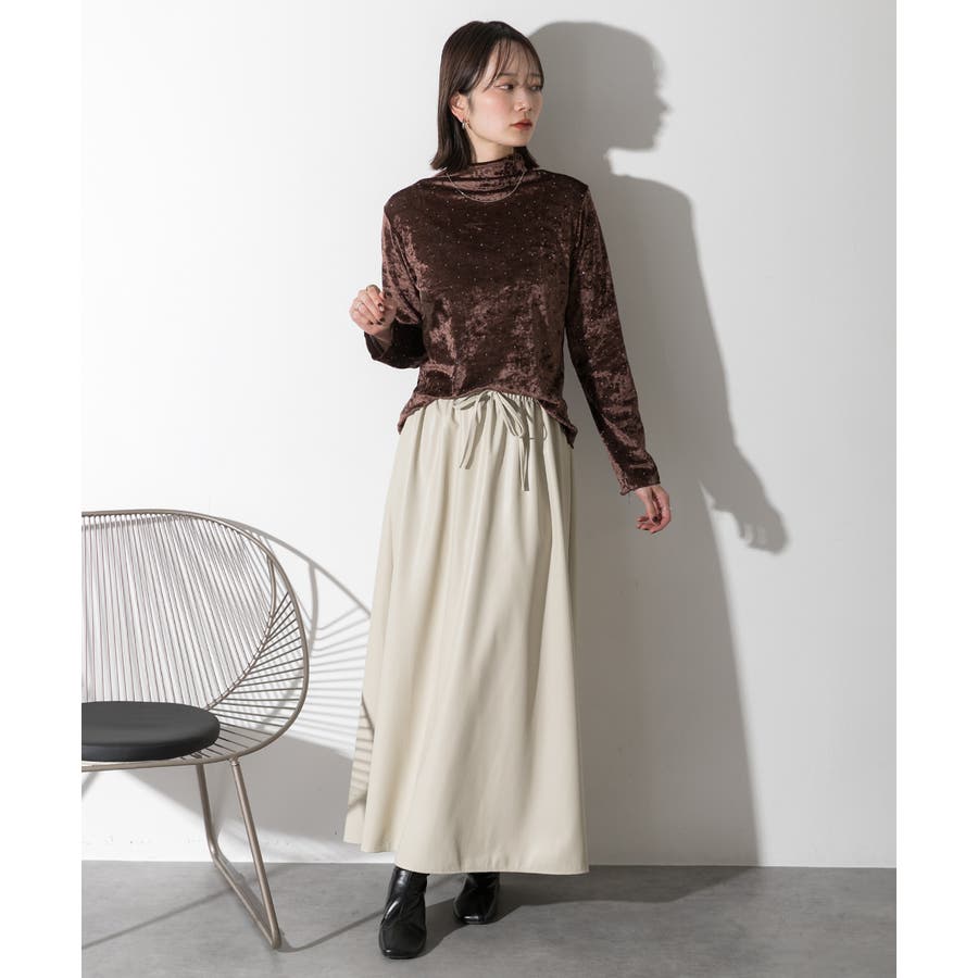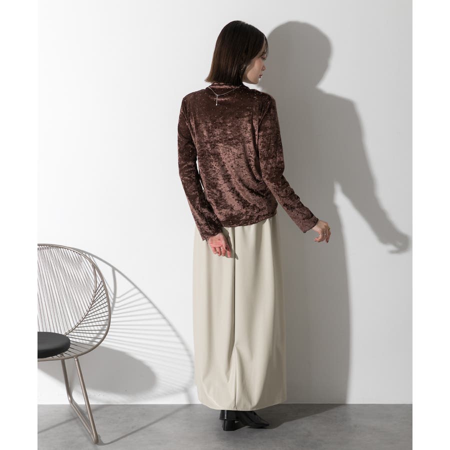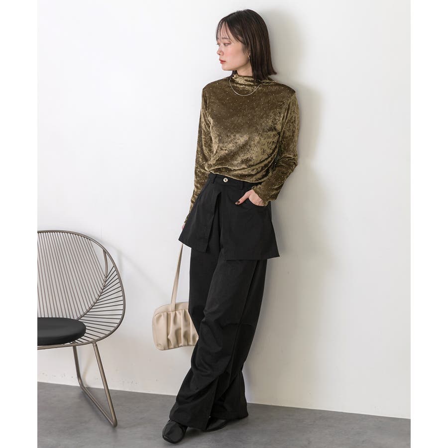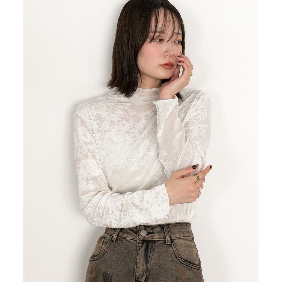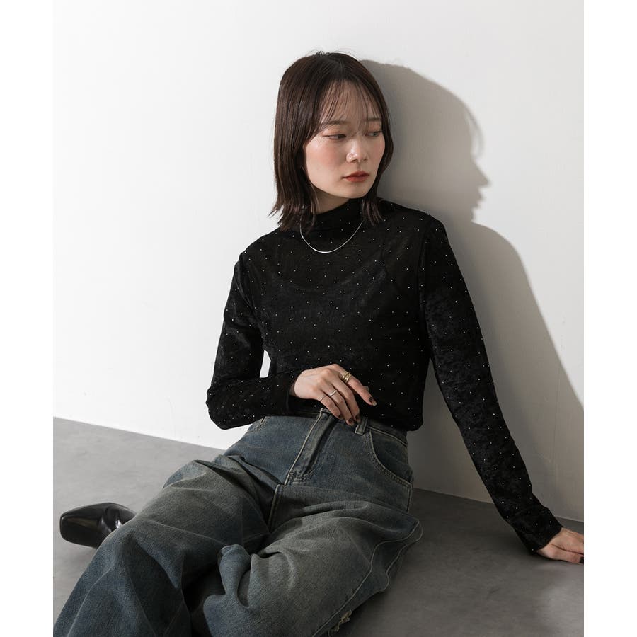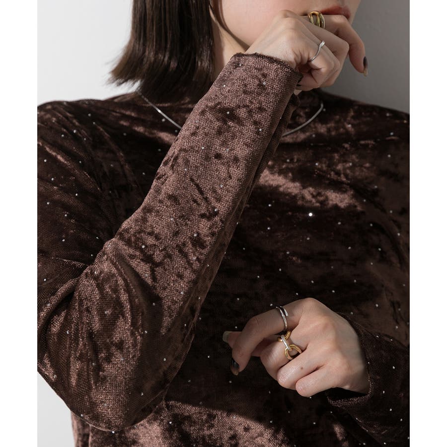 季節感のあるベロア生地と派手すぎない控えめラインストーンがコーディネートを華やかにしてくれるハイネックトップス。