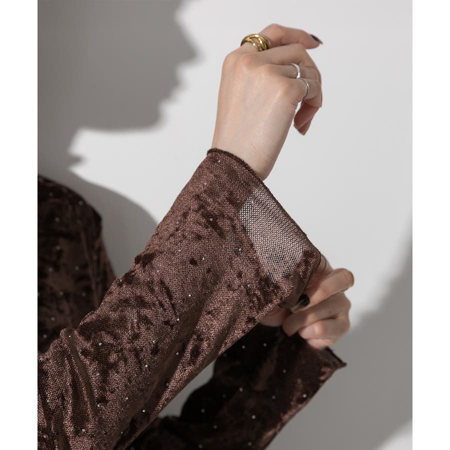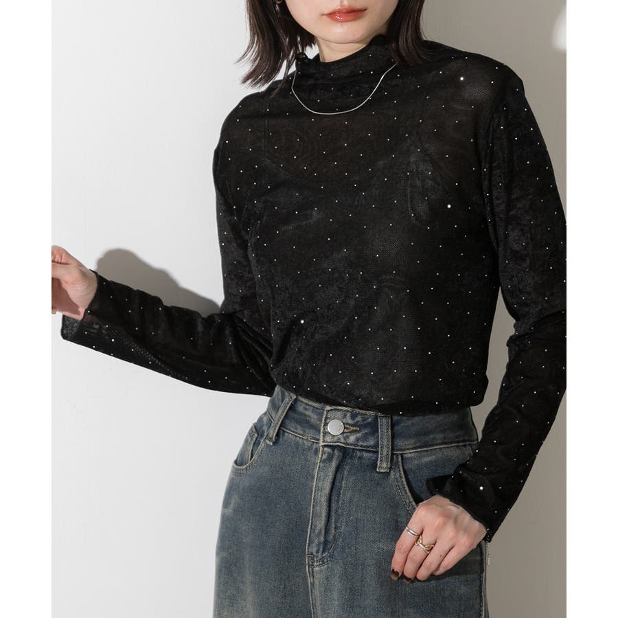 ベロア生地にちりばめられたストーンが上品な印象のシアーハイネック