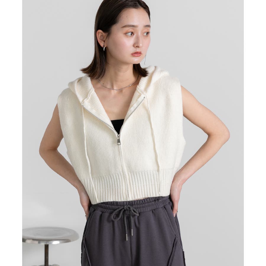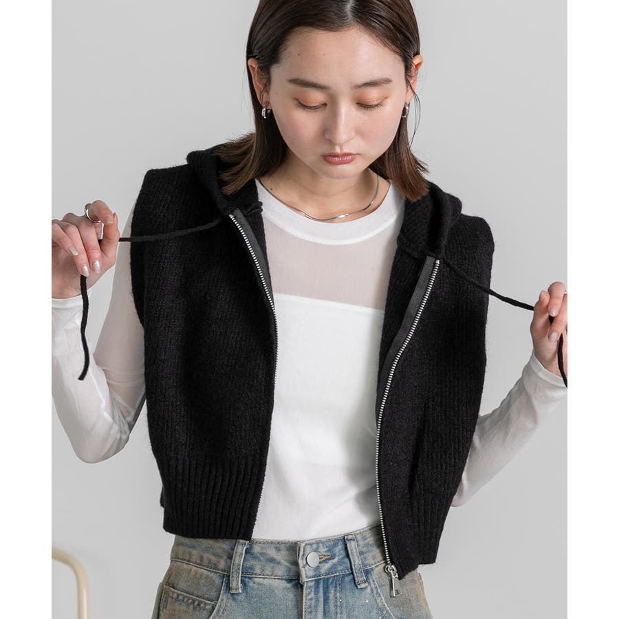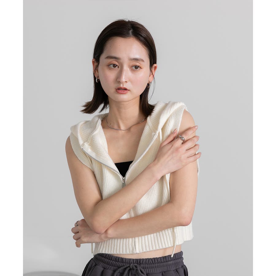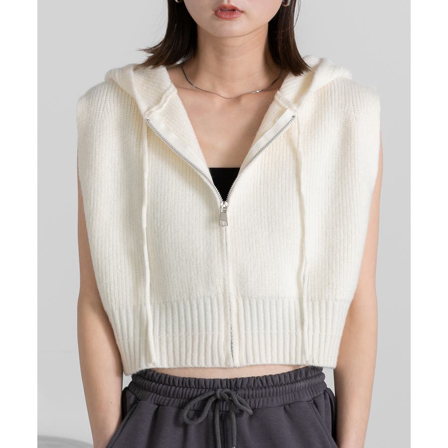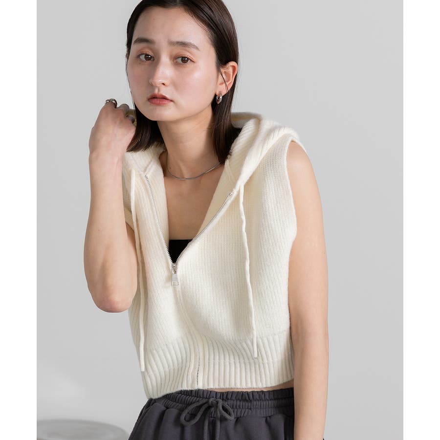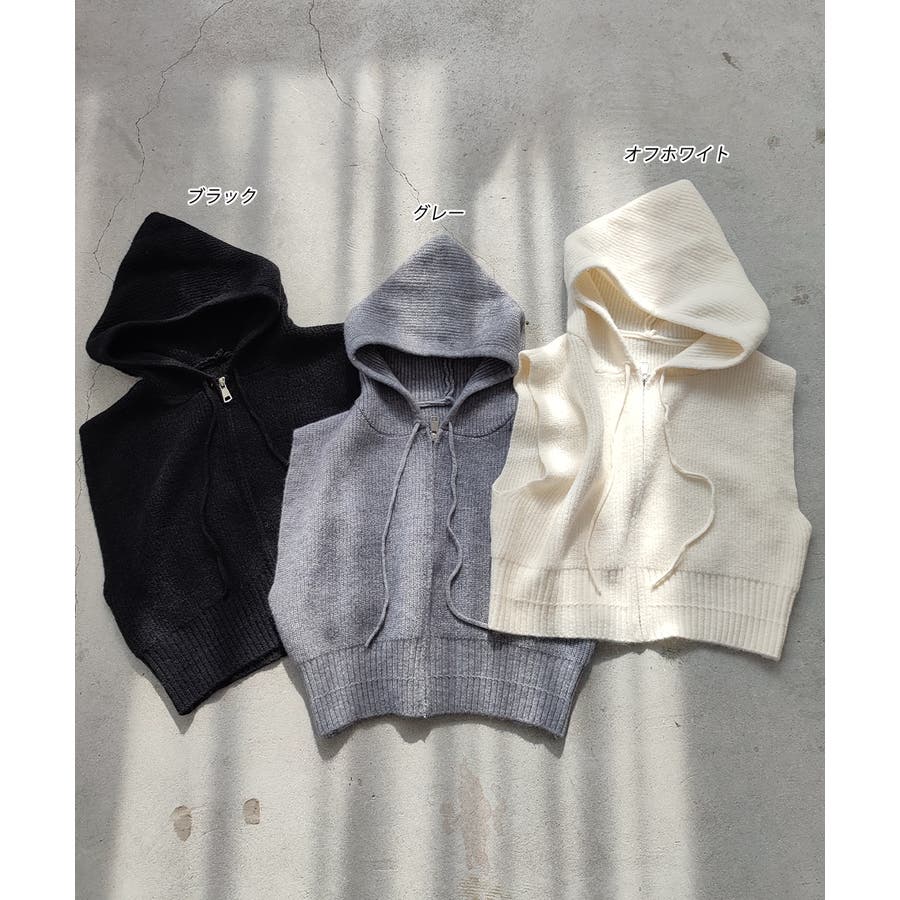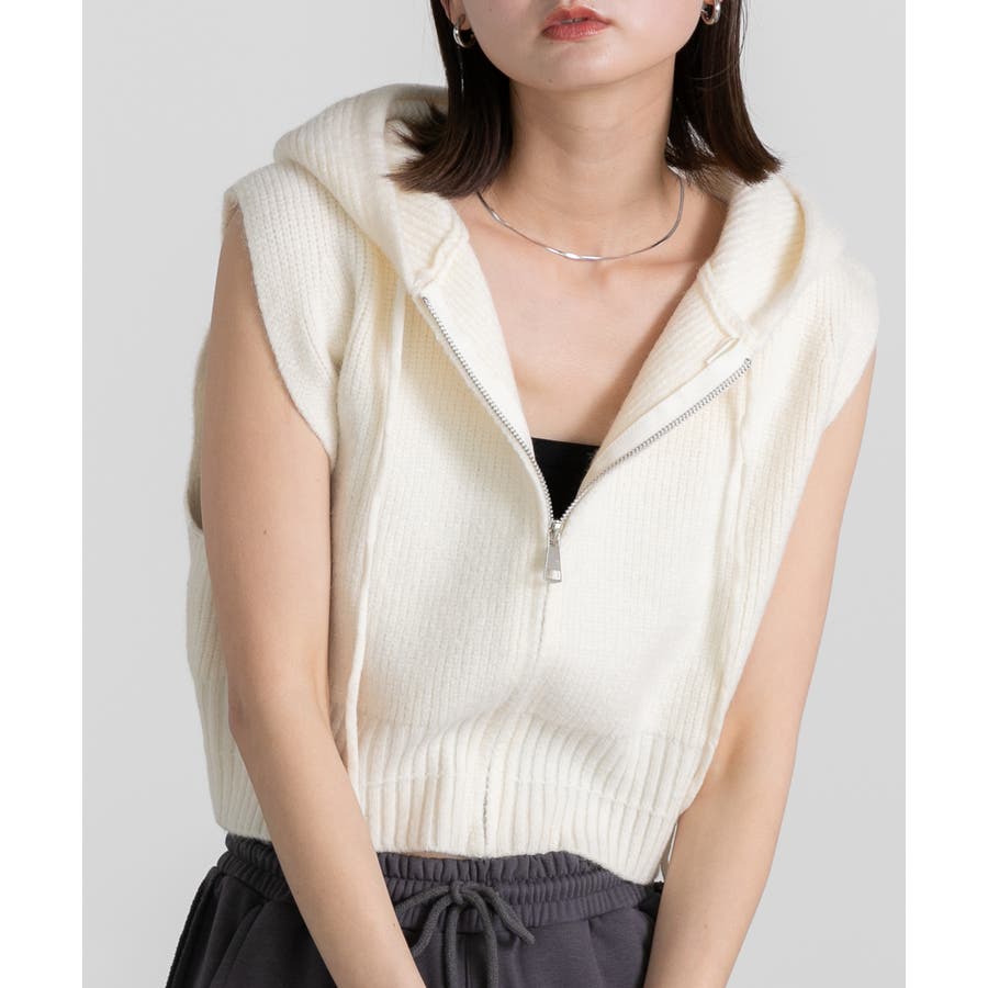春 春コーデ 春ファッション 春服 夏 夏ファッション 夏服 カジュアル カジュアルコーデ 大人 大人カジュアル オフィスカジュアル オフィス オフィスファッション オフィススタイル 韓国 韓国ファッション 韓国コーデ プチプラ プチプラファッション レディース Y2K 量産型 キレイめ 綺麗め きれい きちんと ニット ベスト ニットベスト ジレ チョッキ ノースリーブ ジップベスト フード付き フーディ 無地 シンプル ショート丈 クロップド丈 重ね着 レイヤードコーデ 短め オフホワイト 白 グレー ブラック 黒