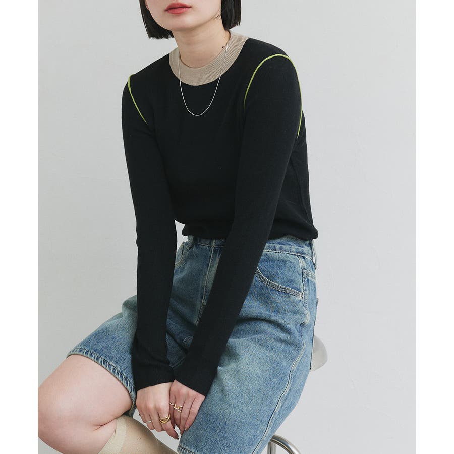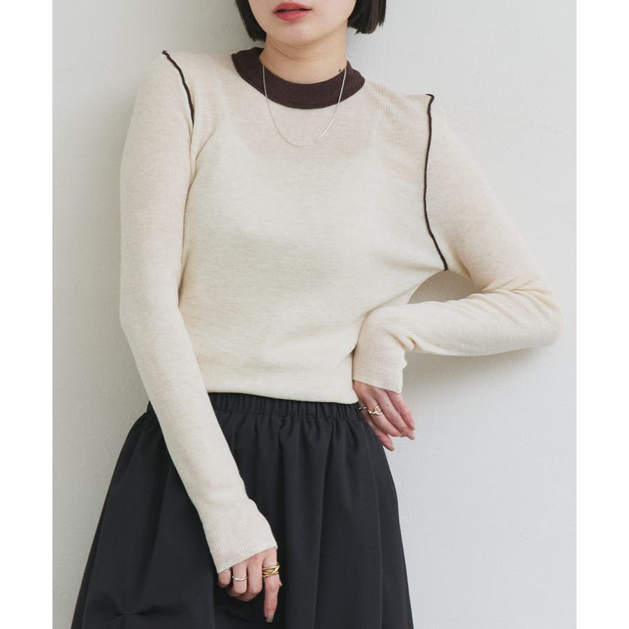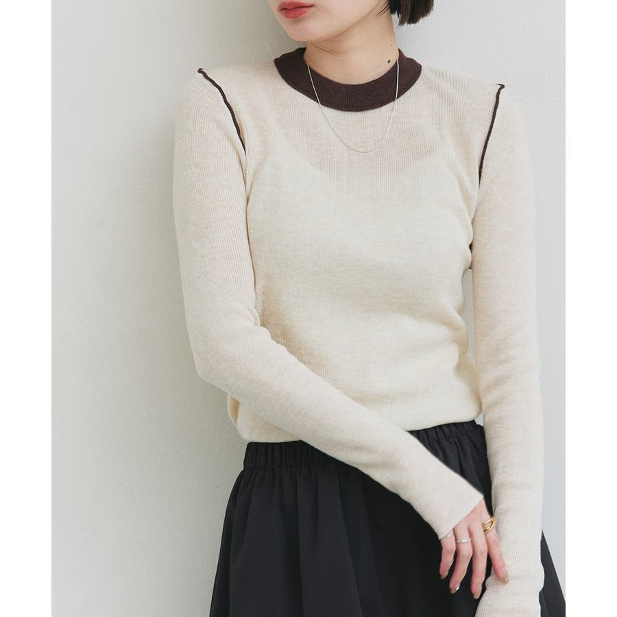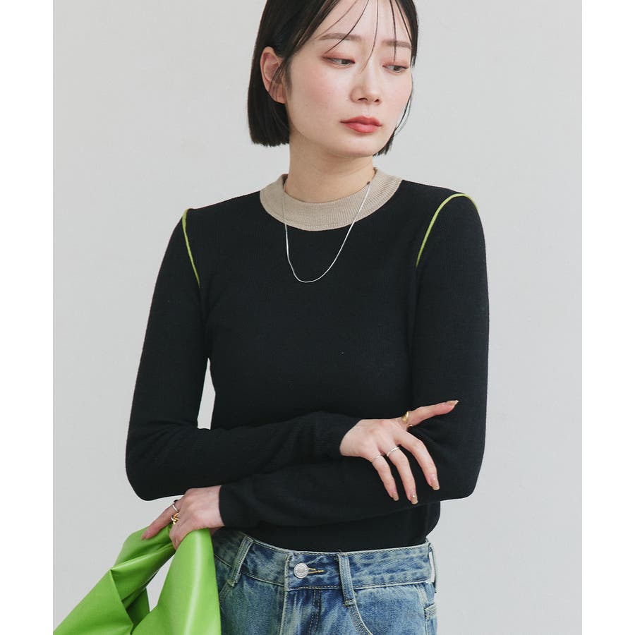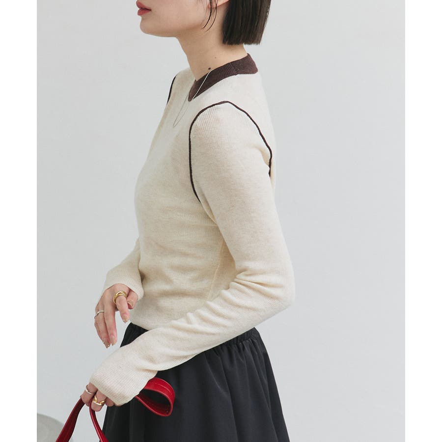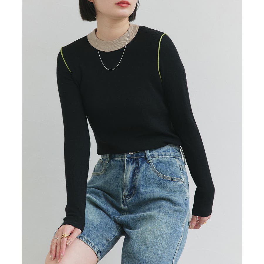伸縮性のある着心地の良いニットで、太めの配色切り替えがトレンド感ある1着。