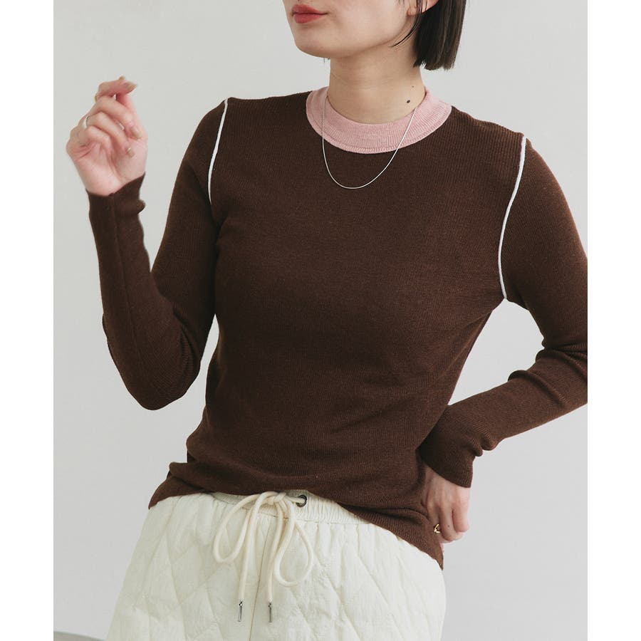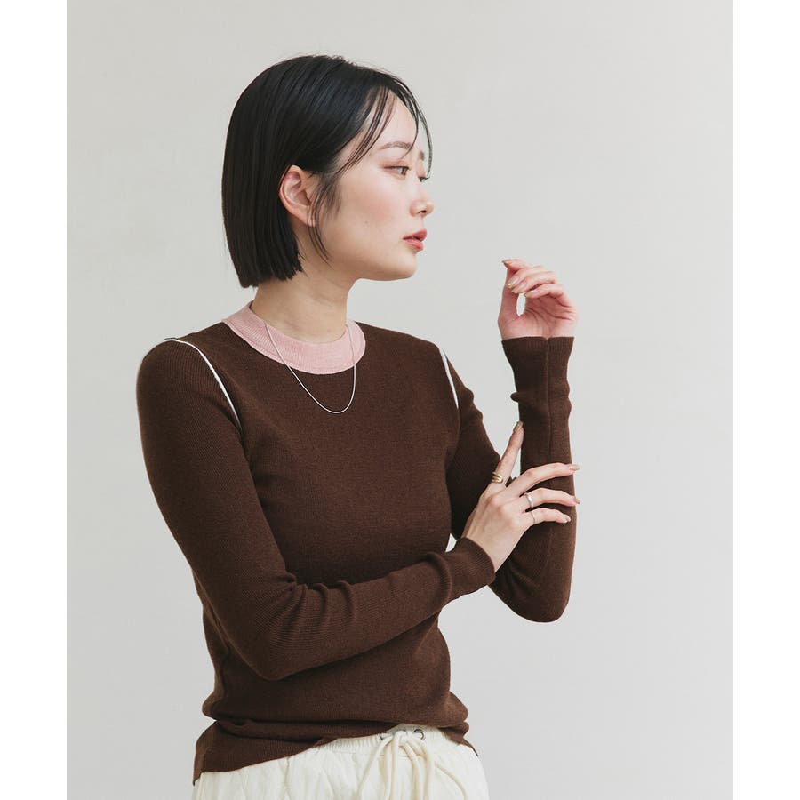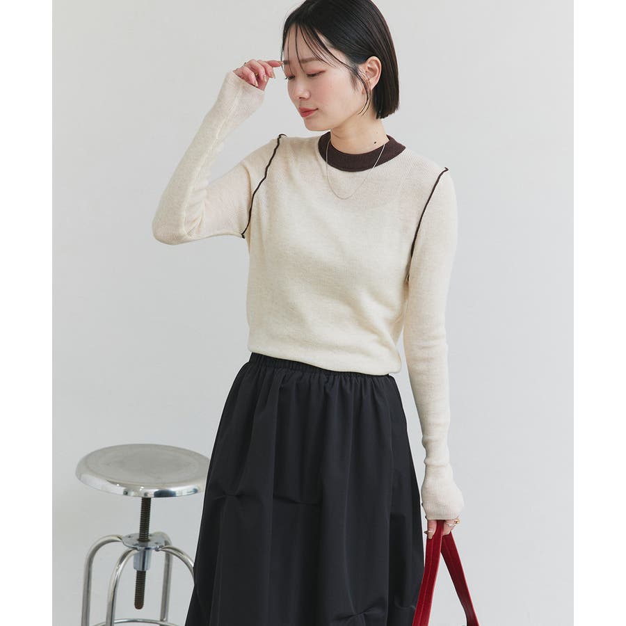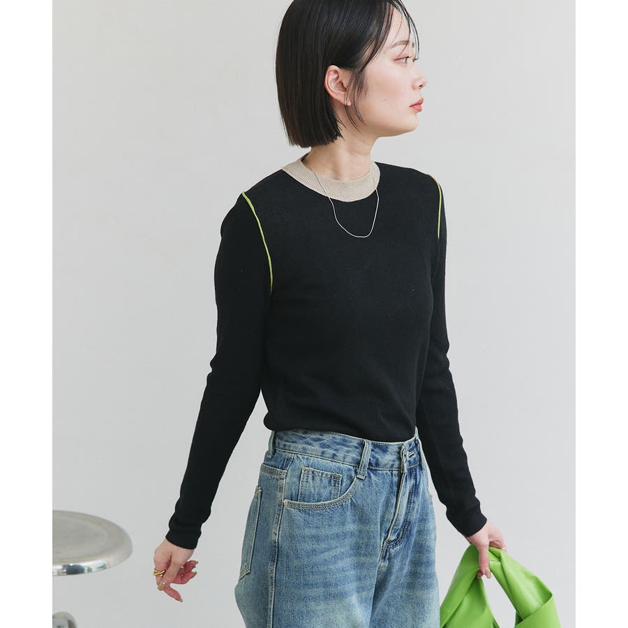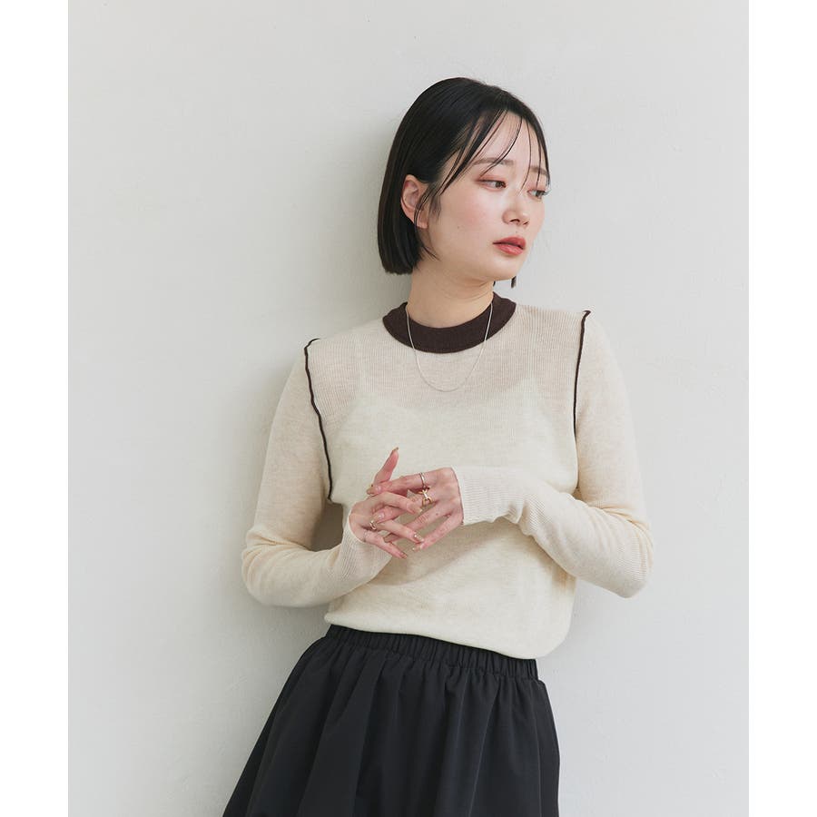 伸縮性のある着心地の良いニットで、太めの配色切り替えがトレンド感ある1着。