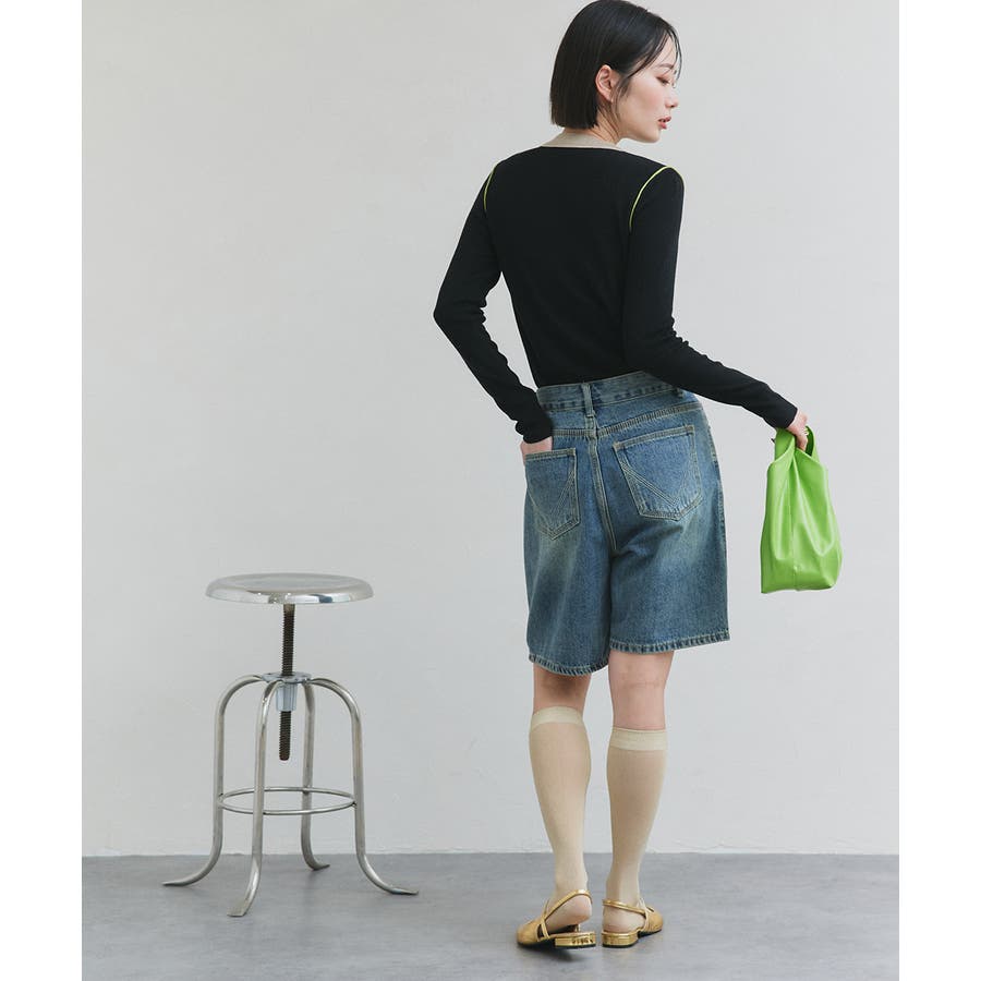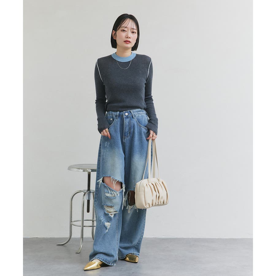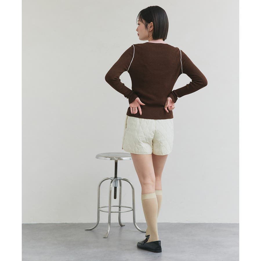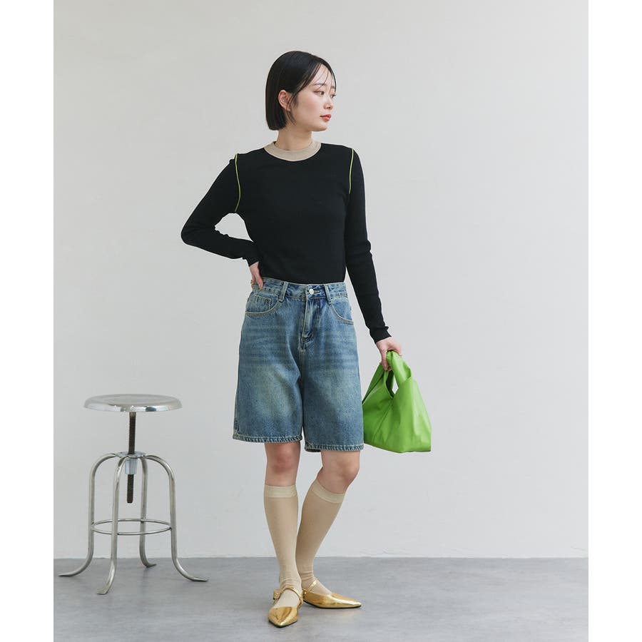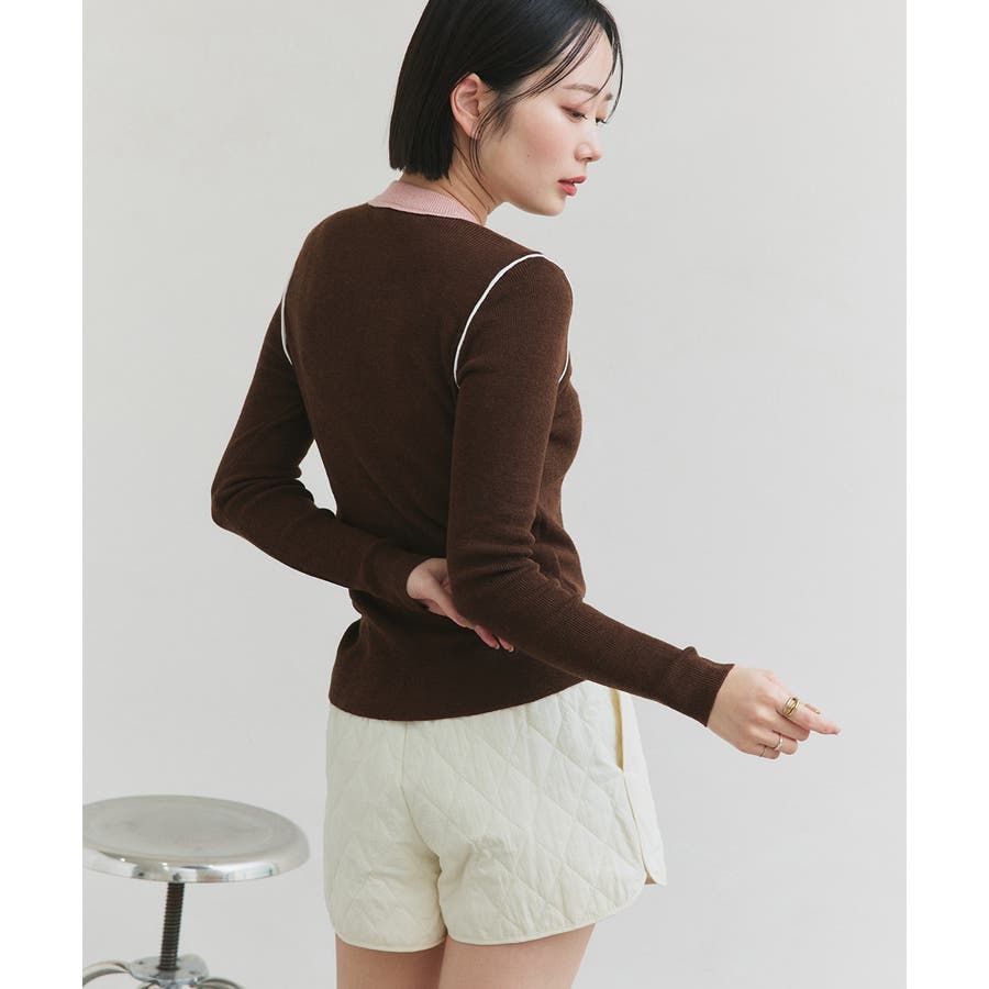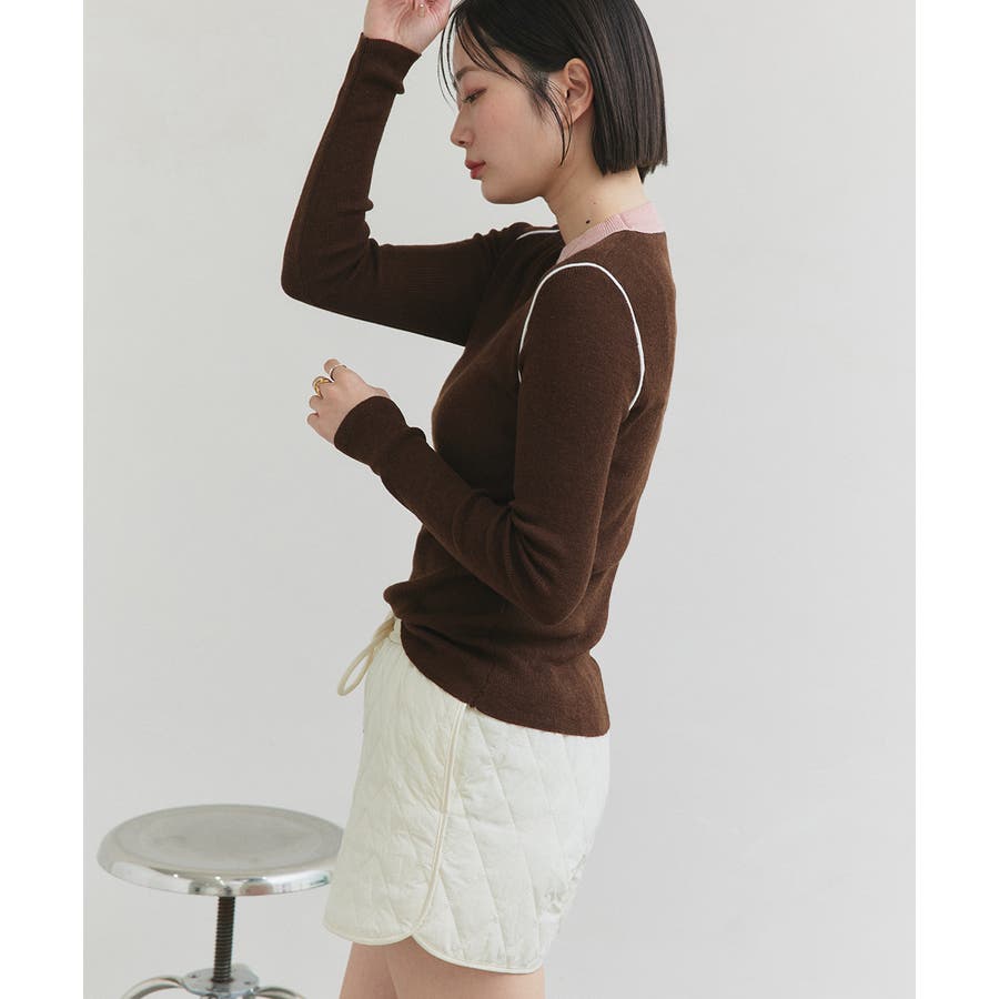 伸縮性のある着心地の良いニットで、太めの配色切り替えがトレンド感ある1着。