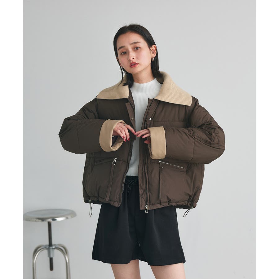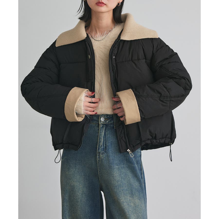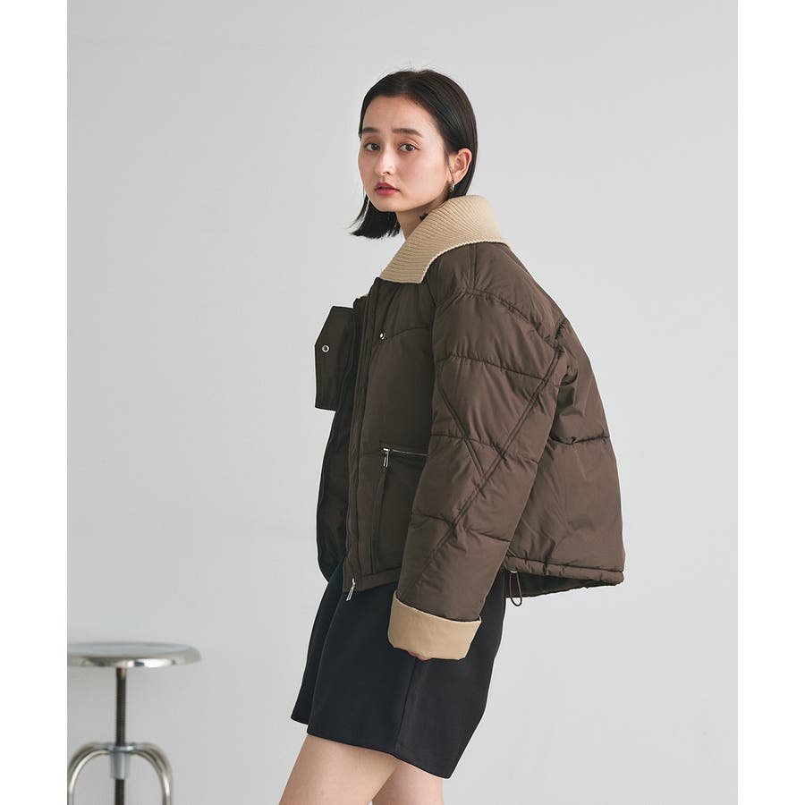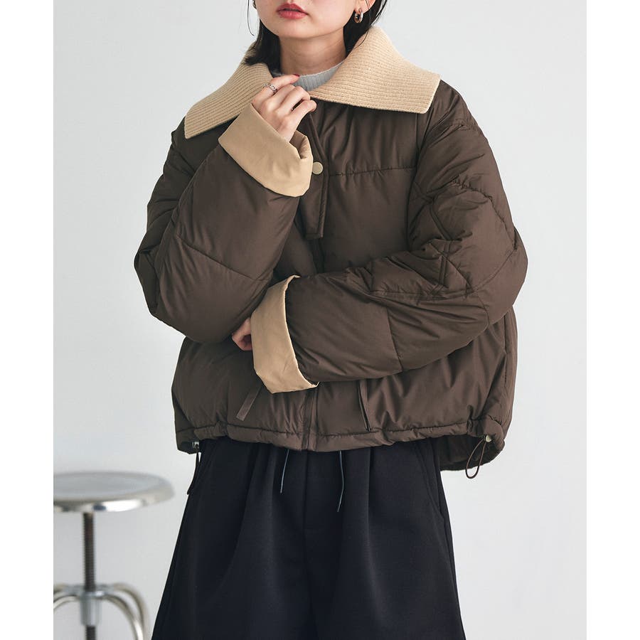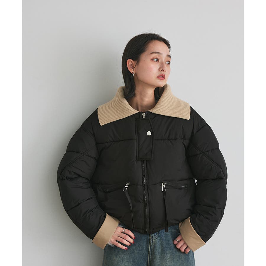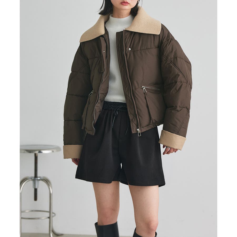 大きな襟とバイカラーデザインがポイントになる、あたたか中綿ブルゾン