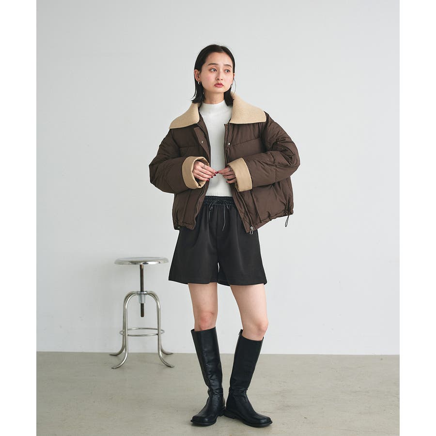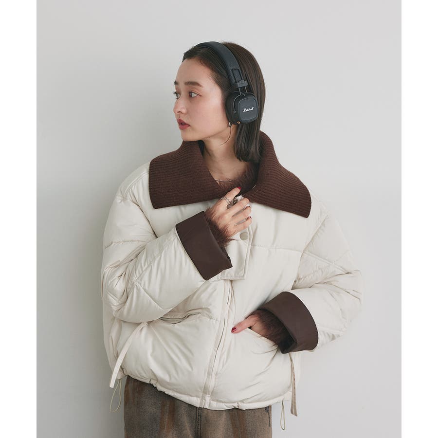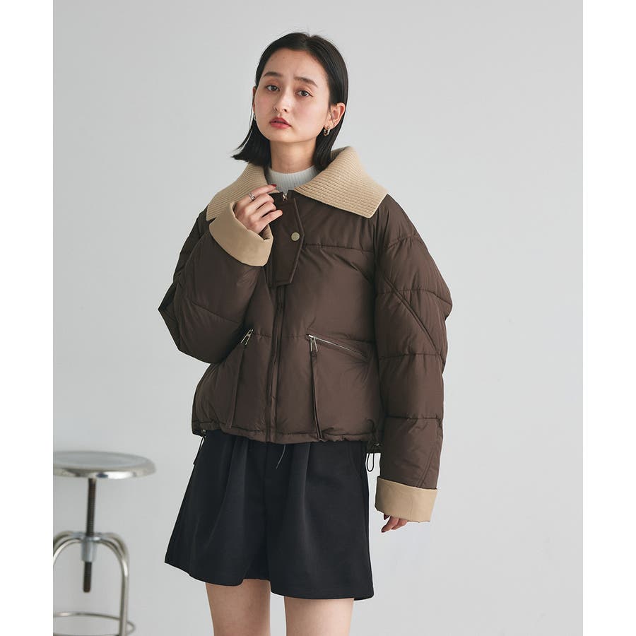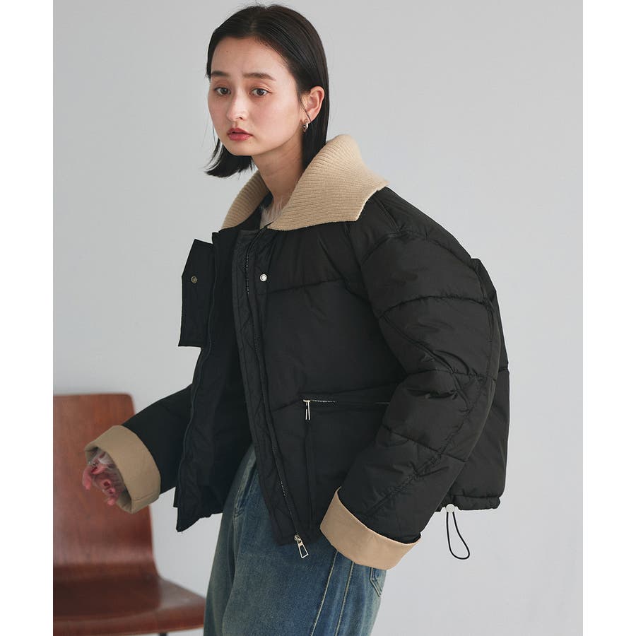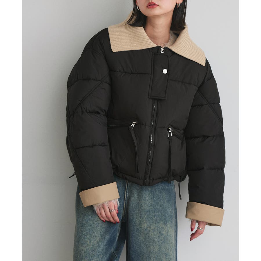 大きな襟とバイカラーデザインがポイントになる、あたたか中綿ブルゾン