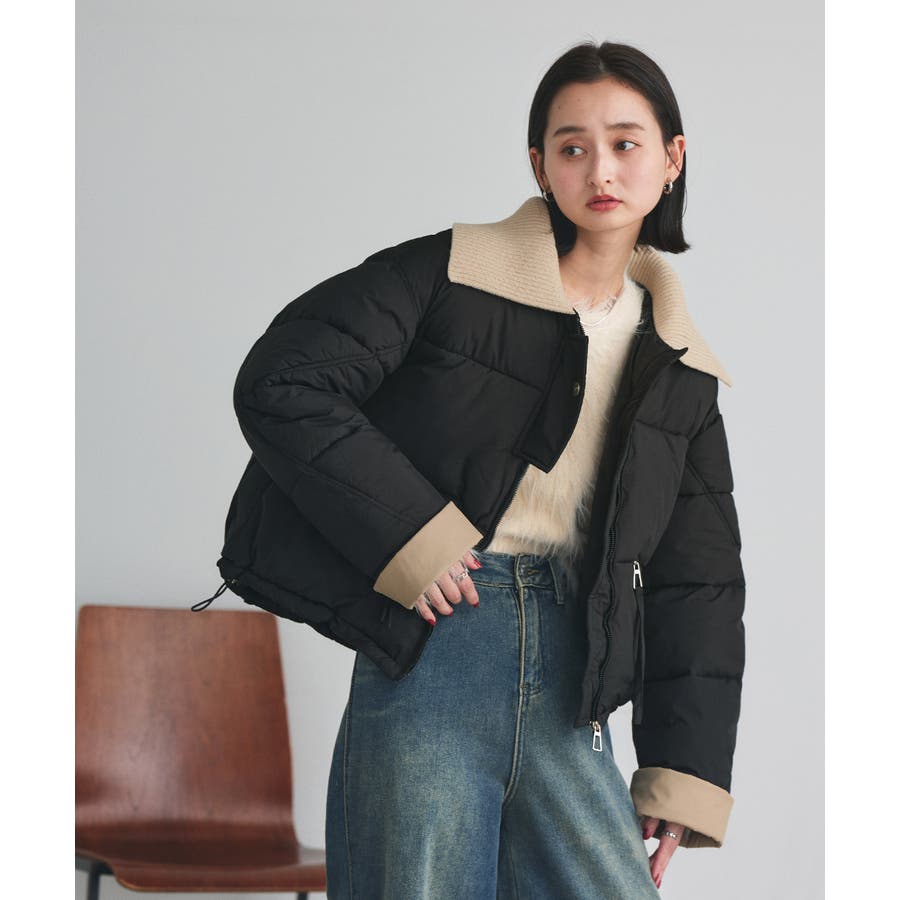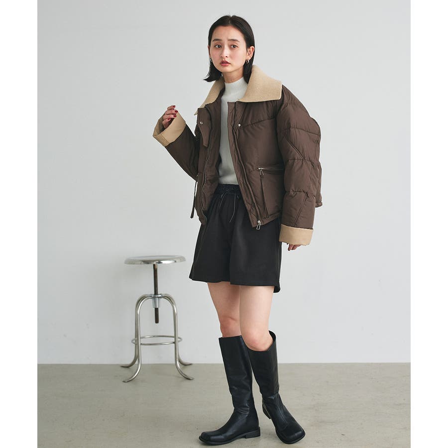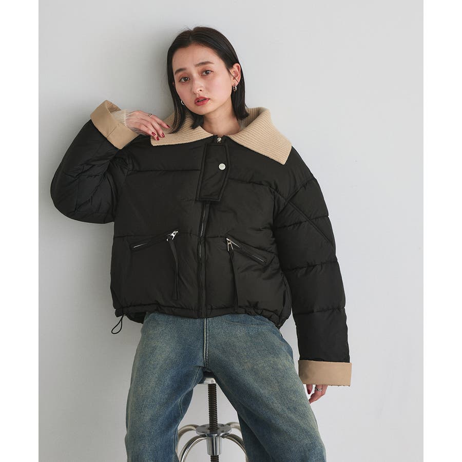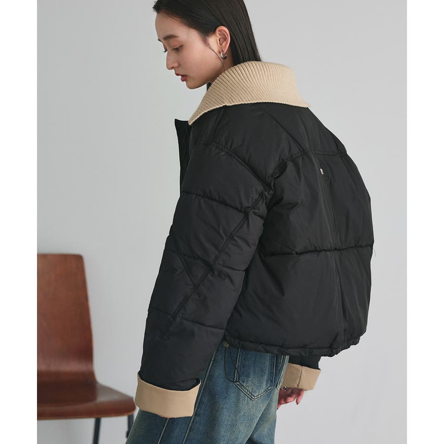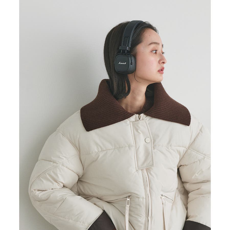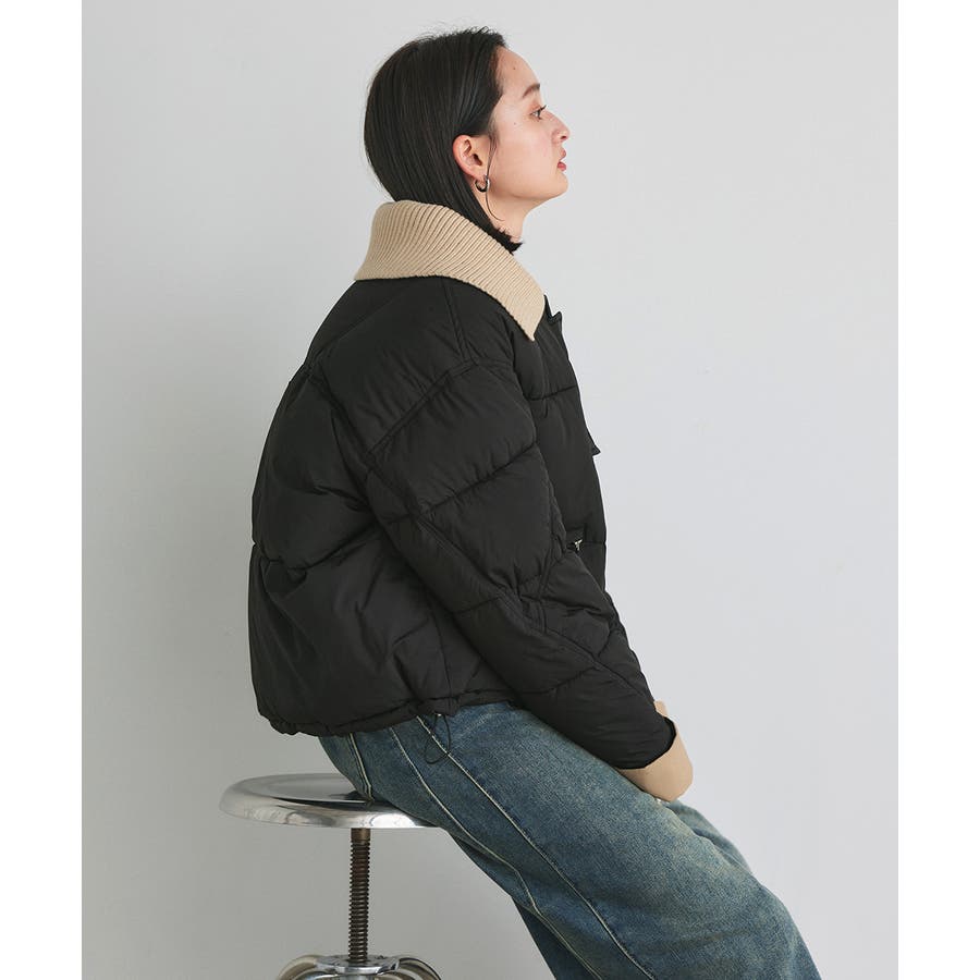 大きな襟とバイカラーデザインがポイントになる、あたたか中綿ブルゾン