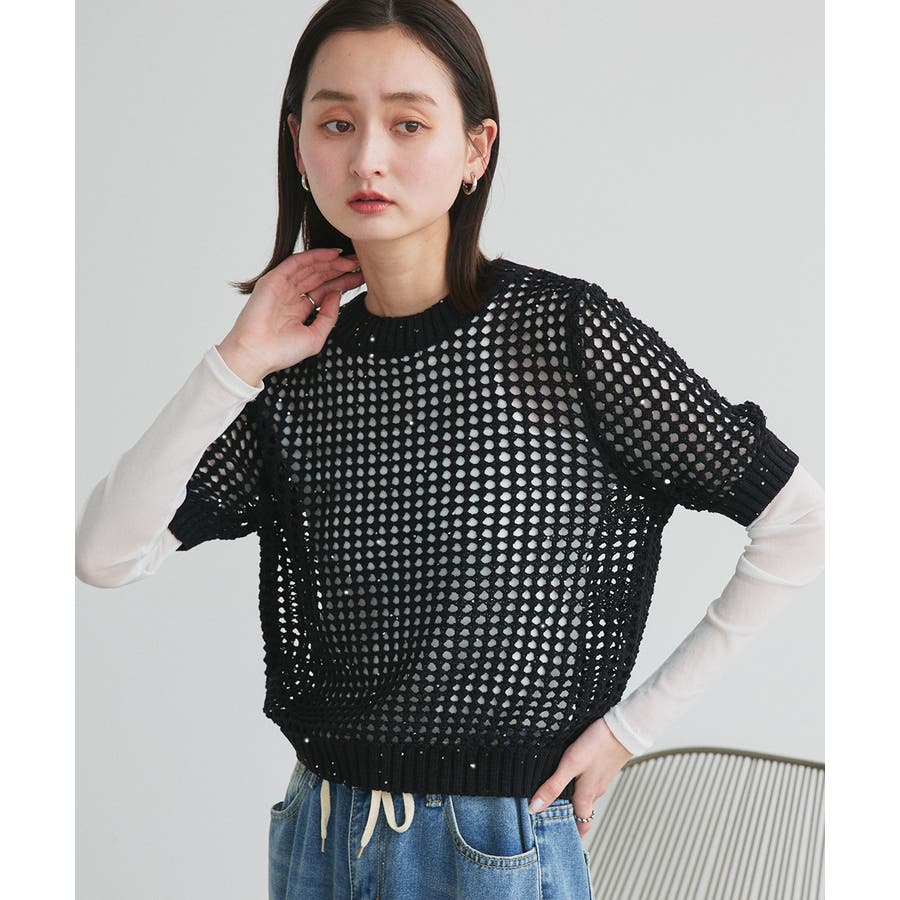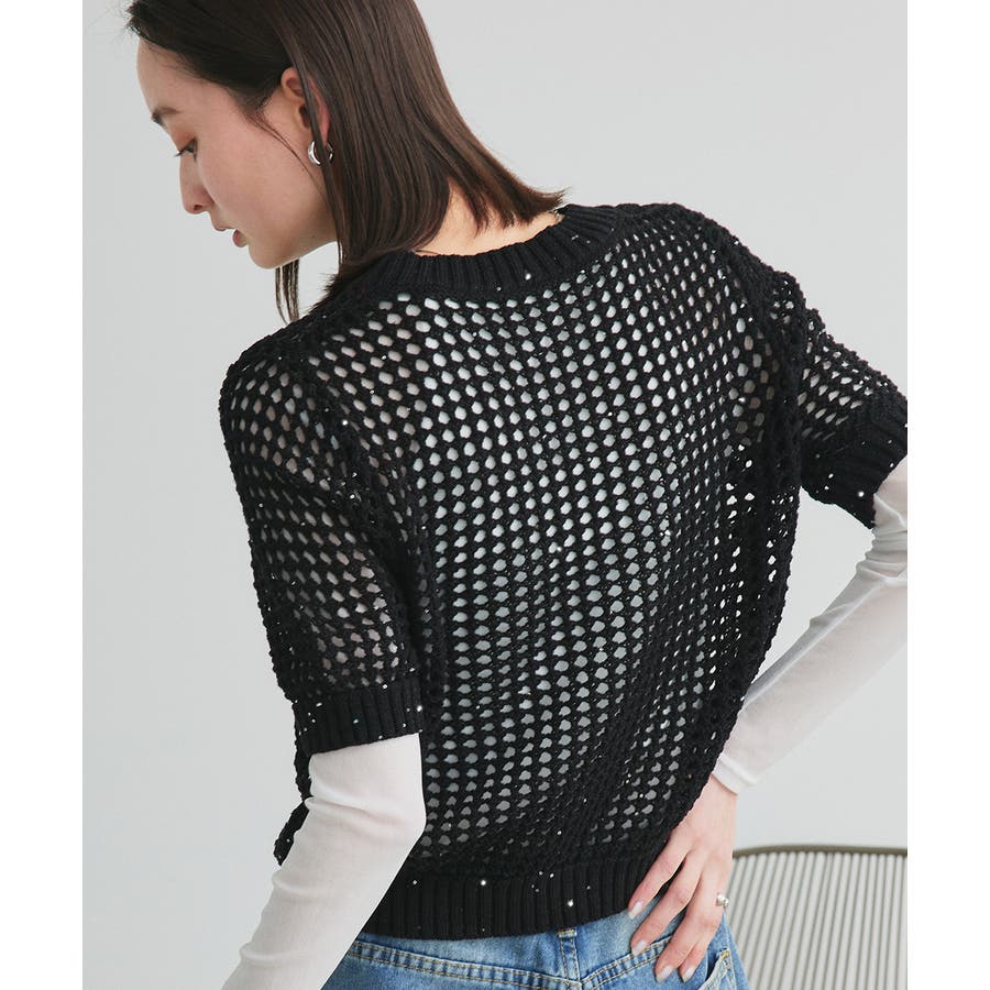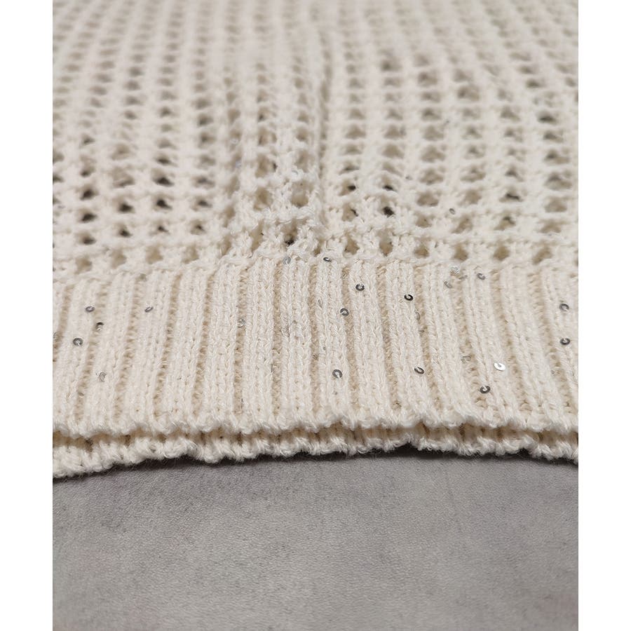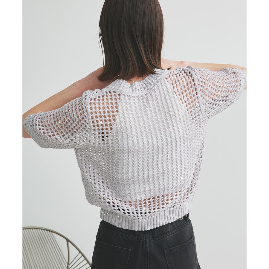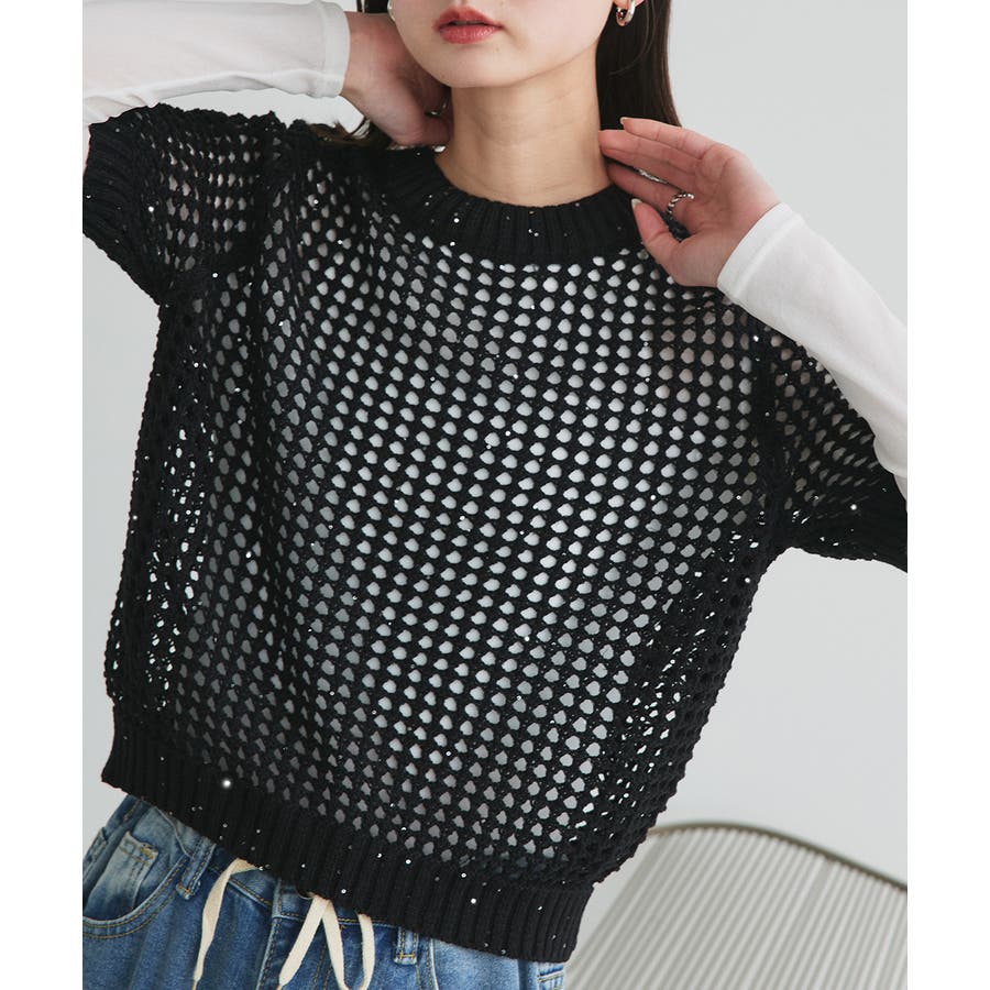 キラキラと光るスパンコール糸でざっくりと編まれたメッシュニットプルオーバー。