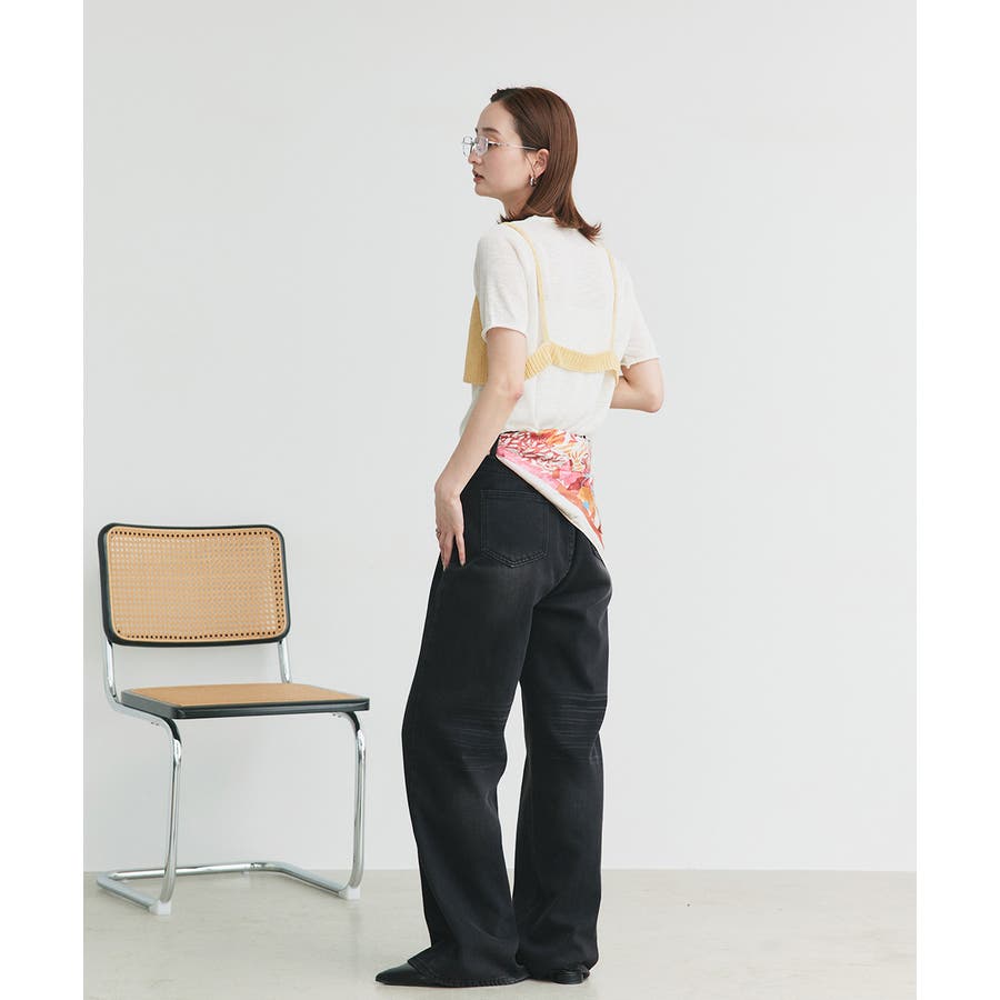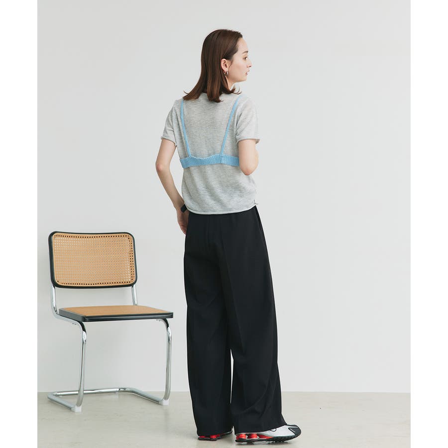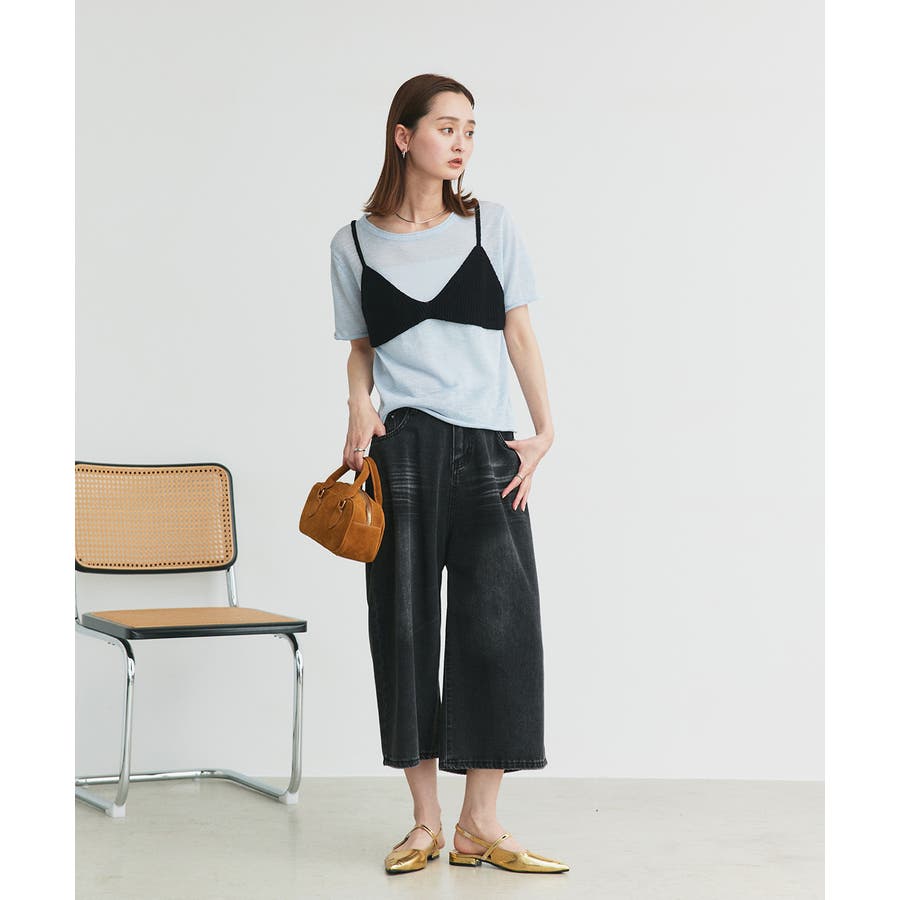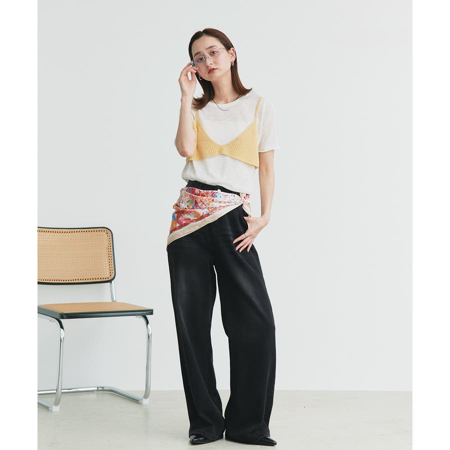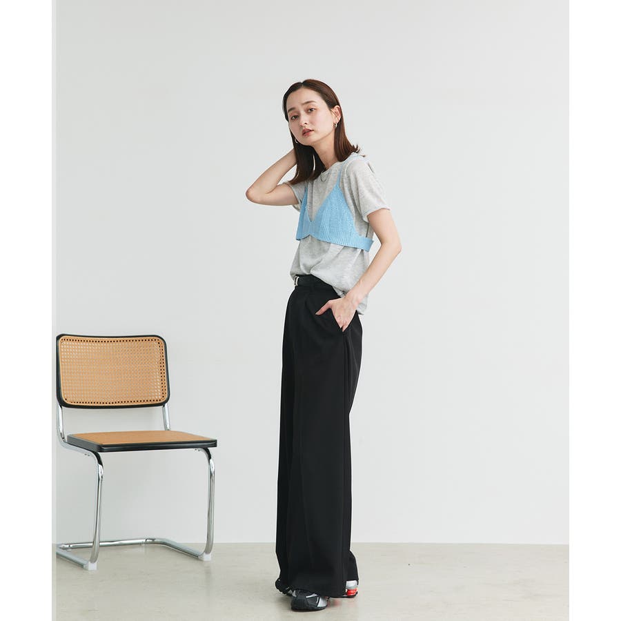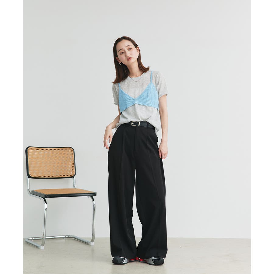 ニットトップスは裾がカットオフデザインになっているので、タックインもアウトもお洒落に仕上がります。