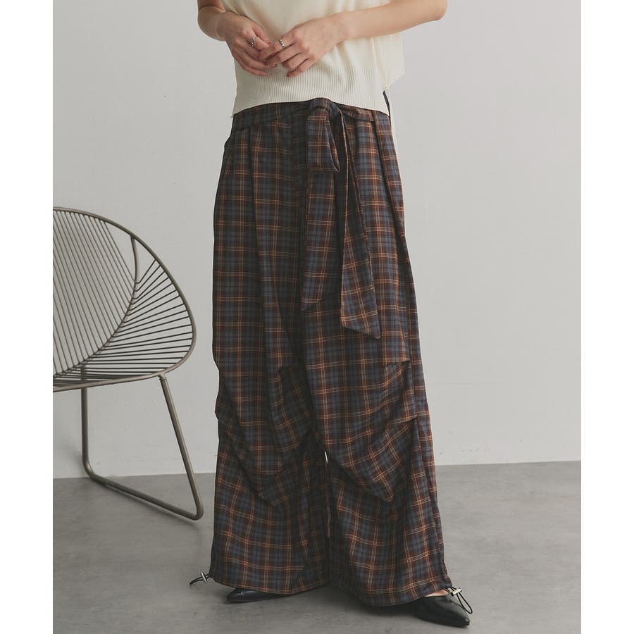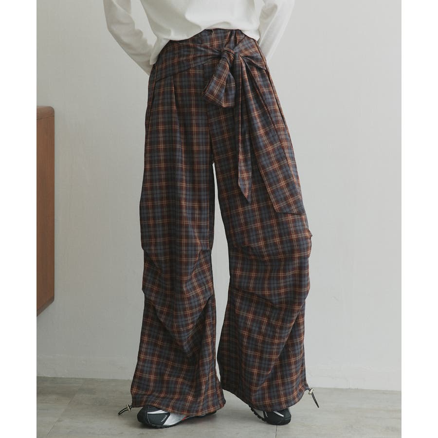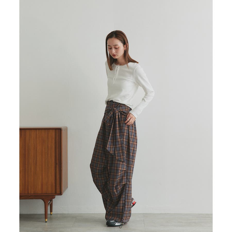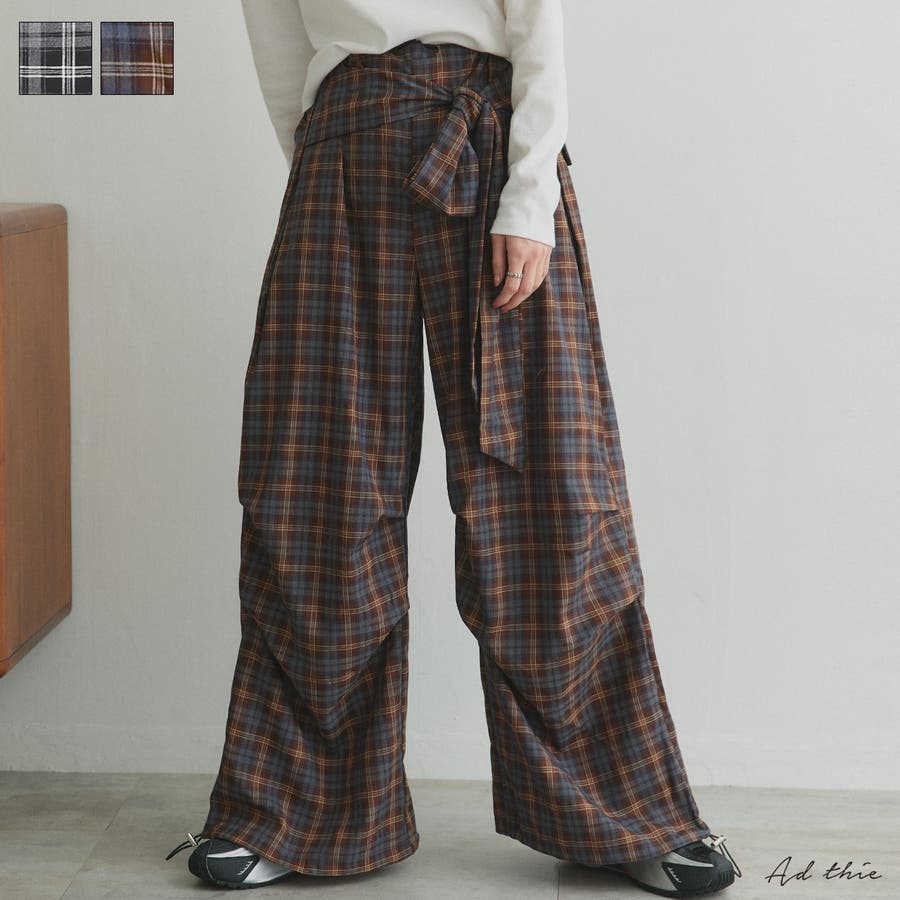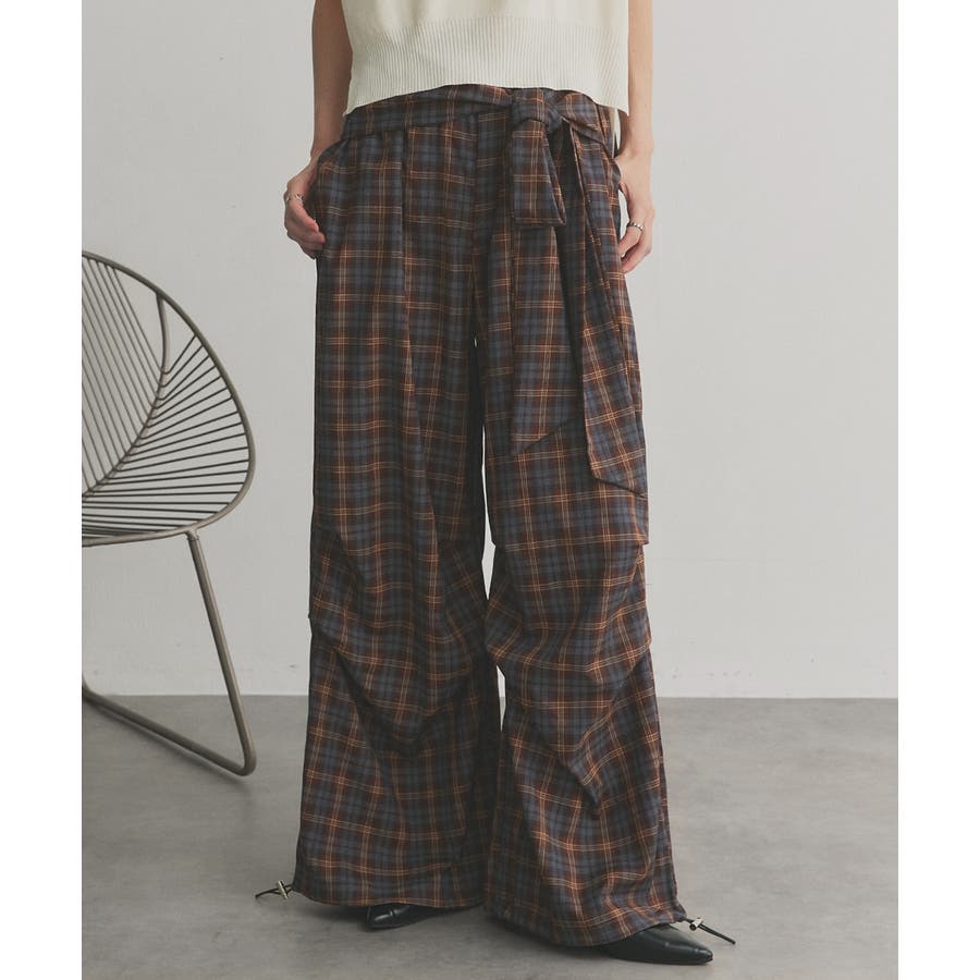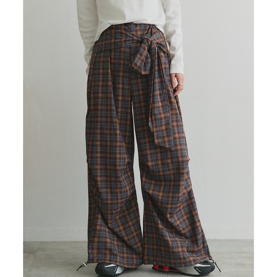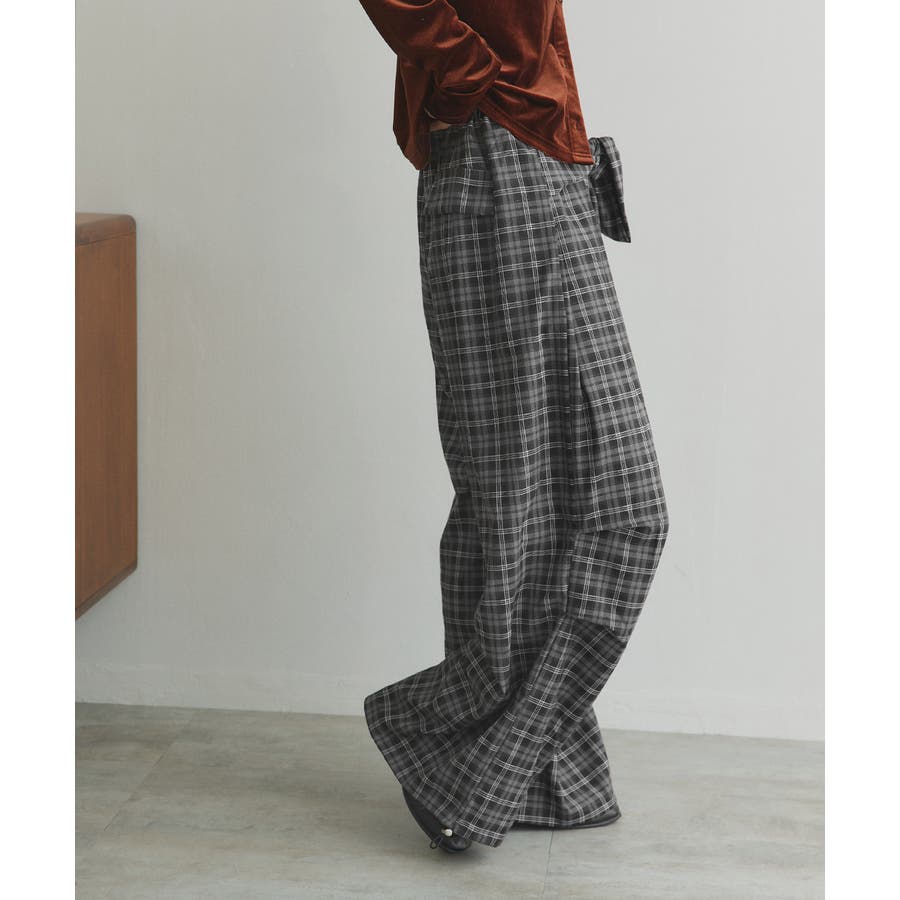 【2025AW新作】ウエストリボンデザインチェックワイドパンツ