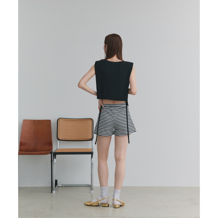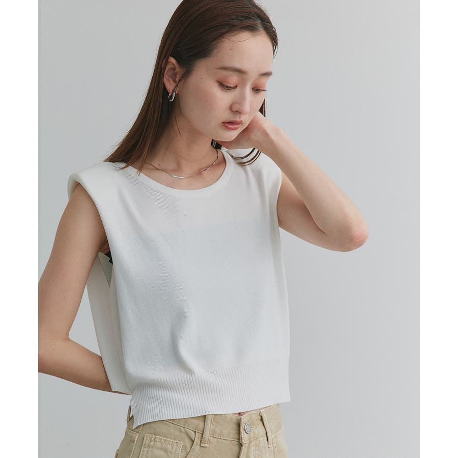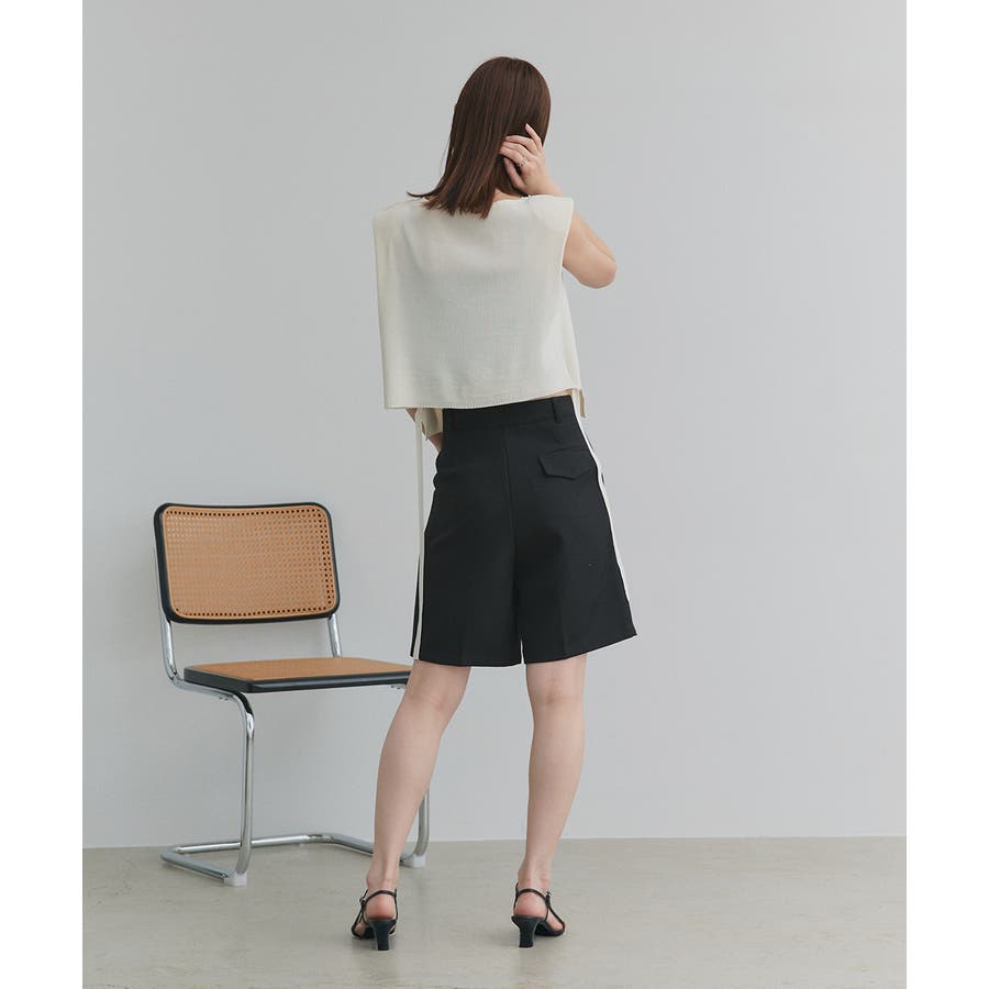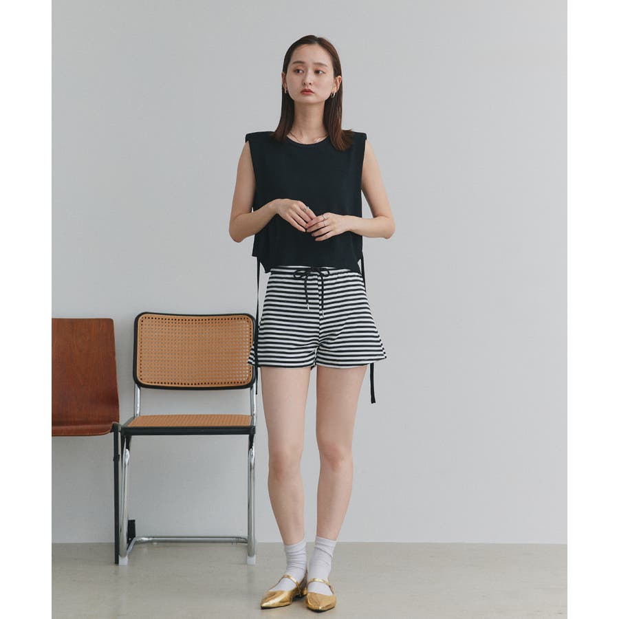 ショート丈×ノースリーブのスッキリとしたシルエットは、ハイウエストのボトムと好相性。