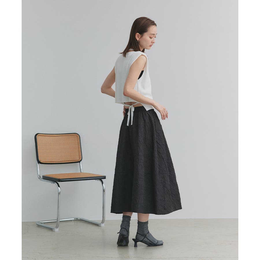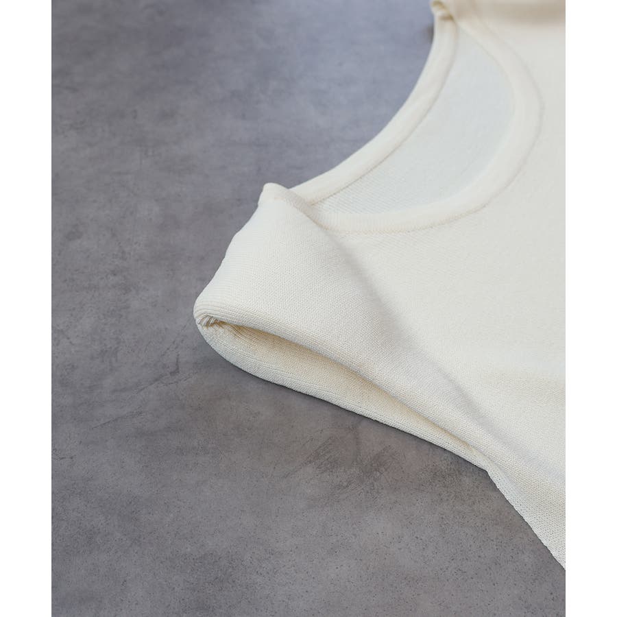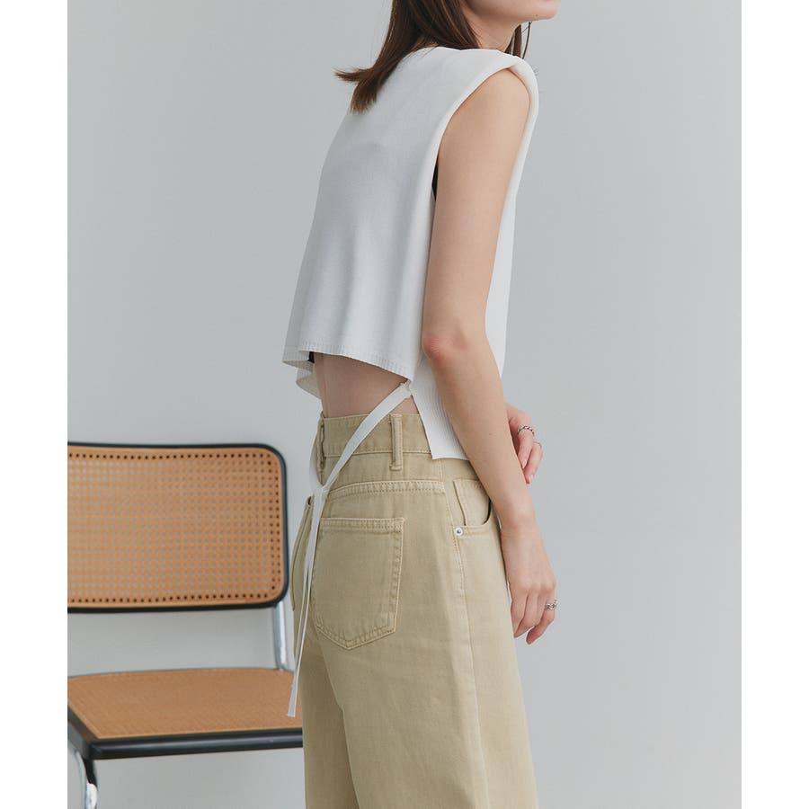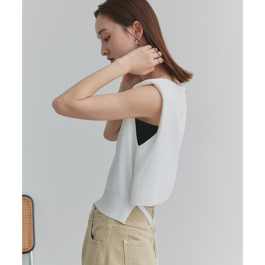 シンプルなフロントデザインに、後ろ姿にアクセントを効かせたノースリーブショート丈ニット。