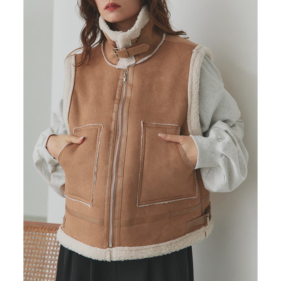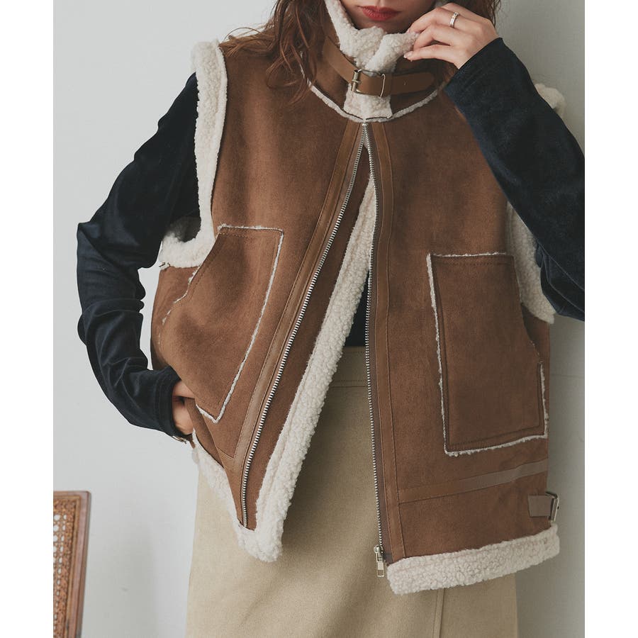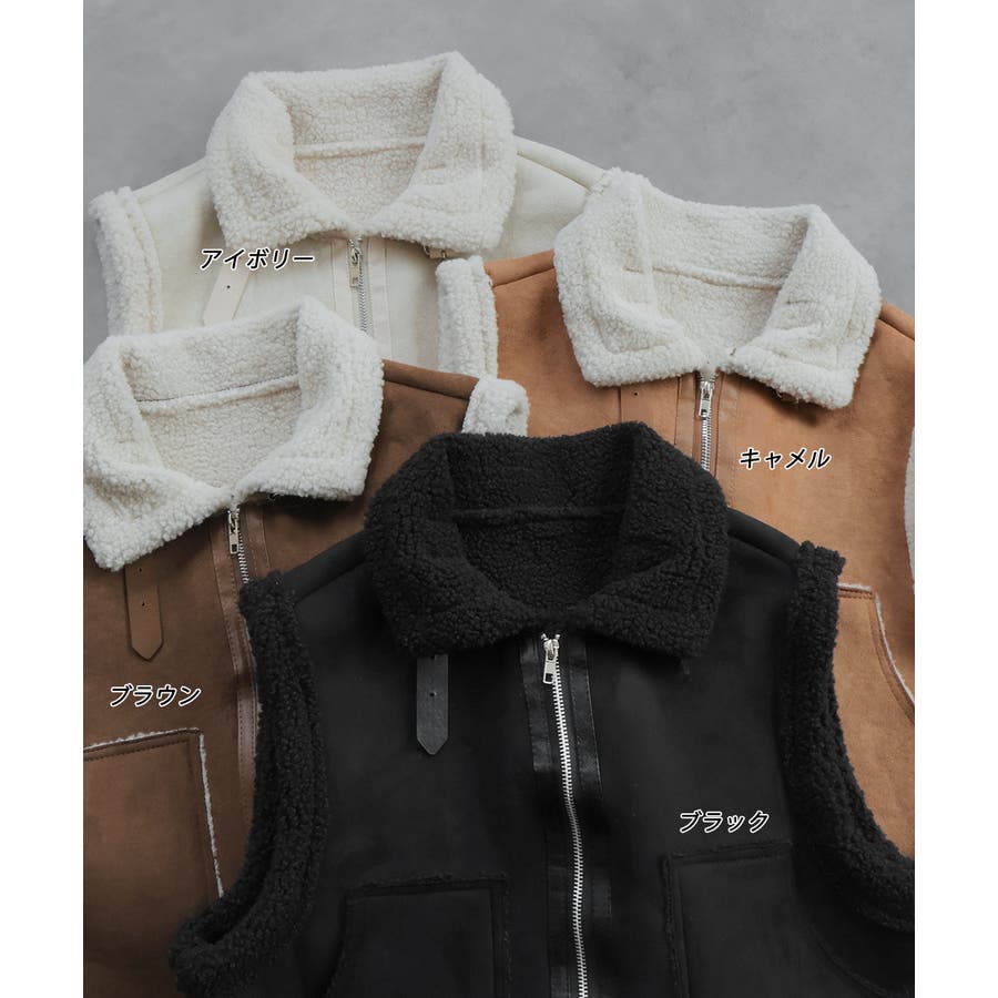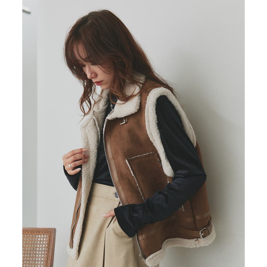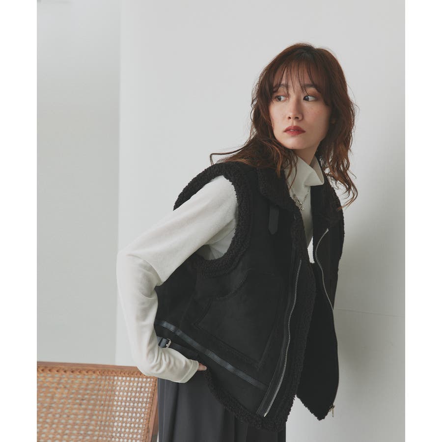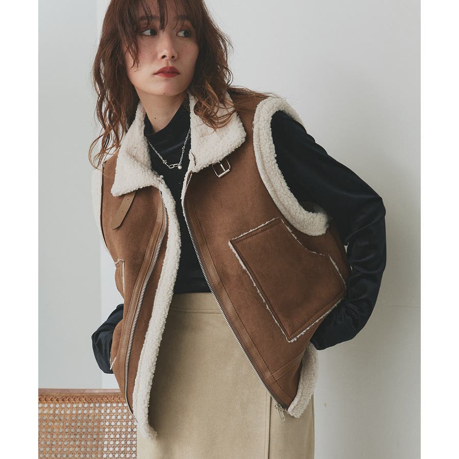 秋冬らしい季節感を演出できるフェイクムートン素材のベスト。