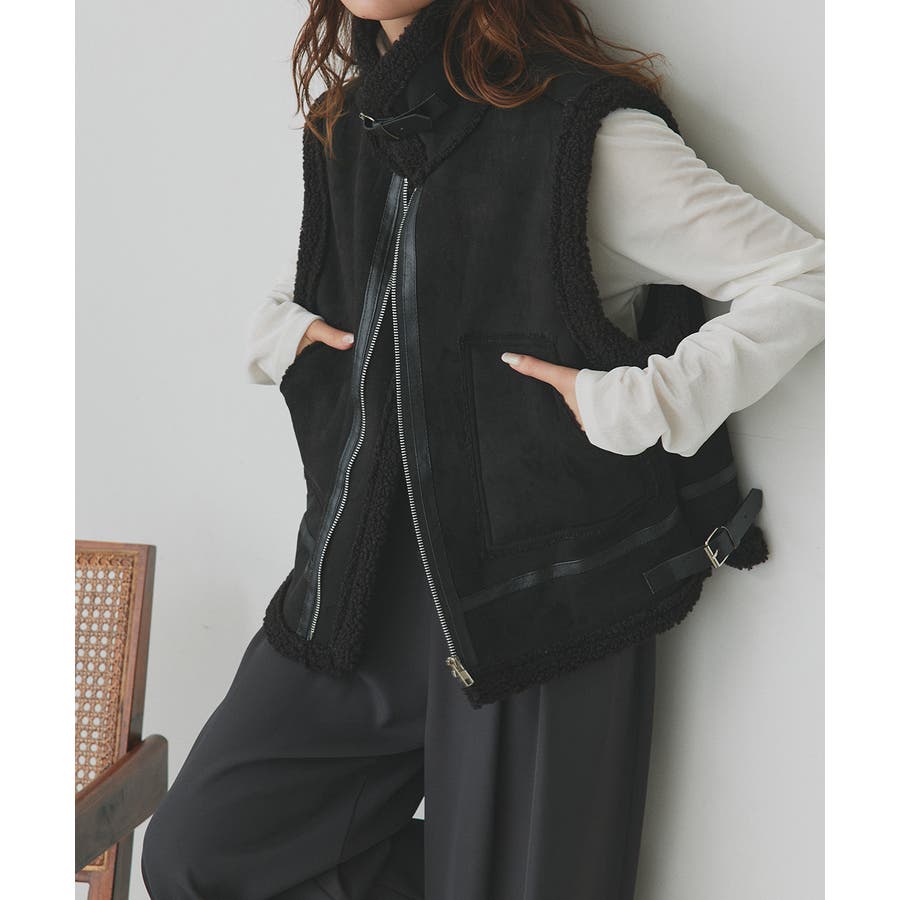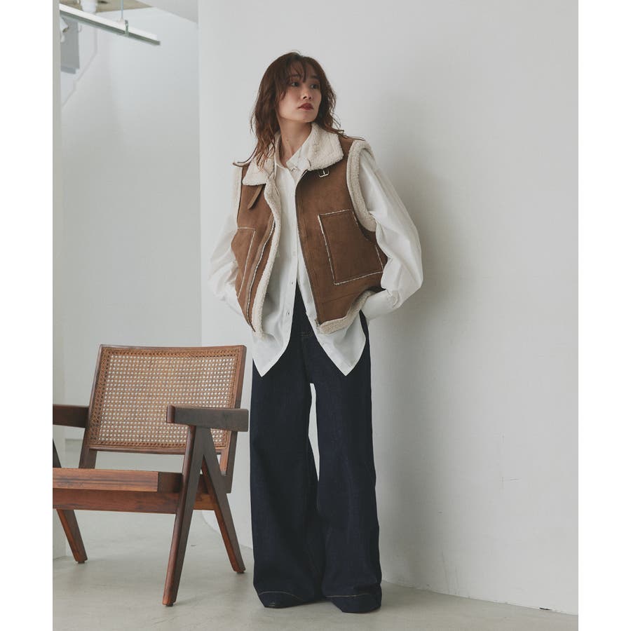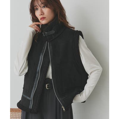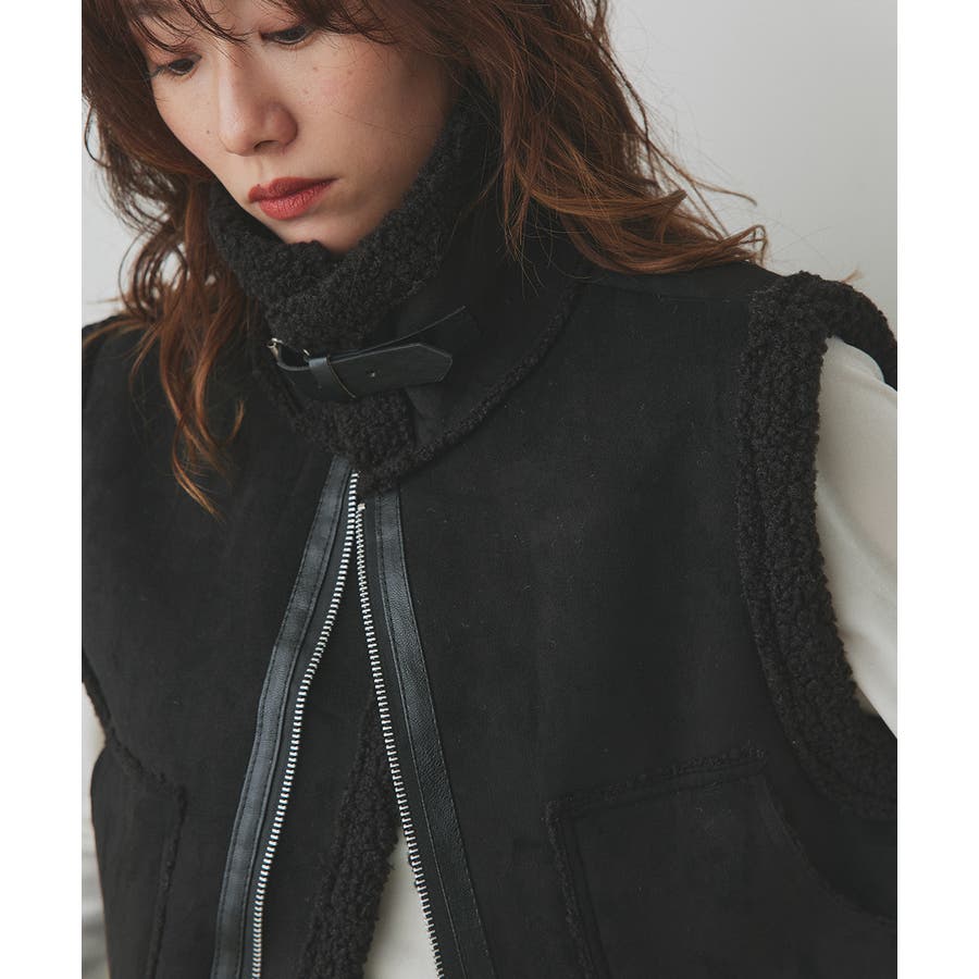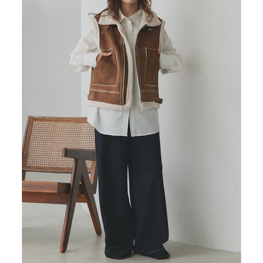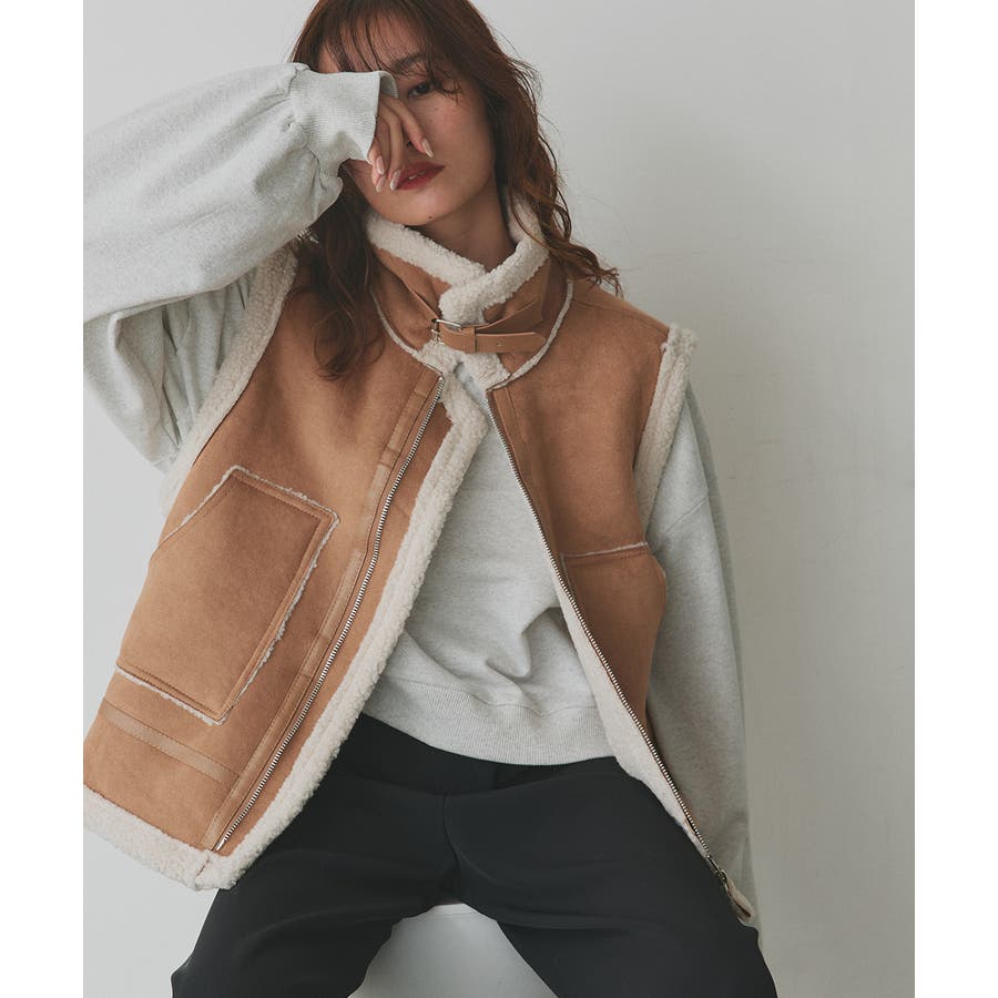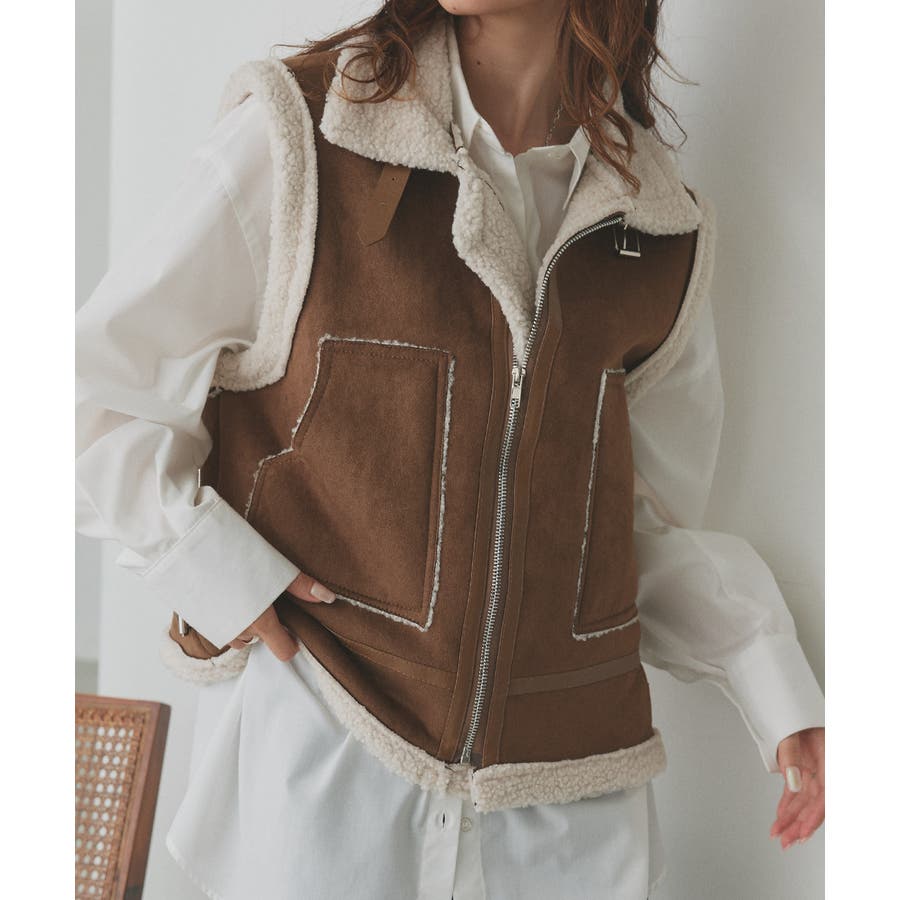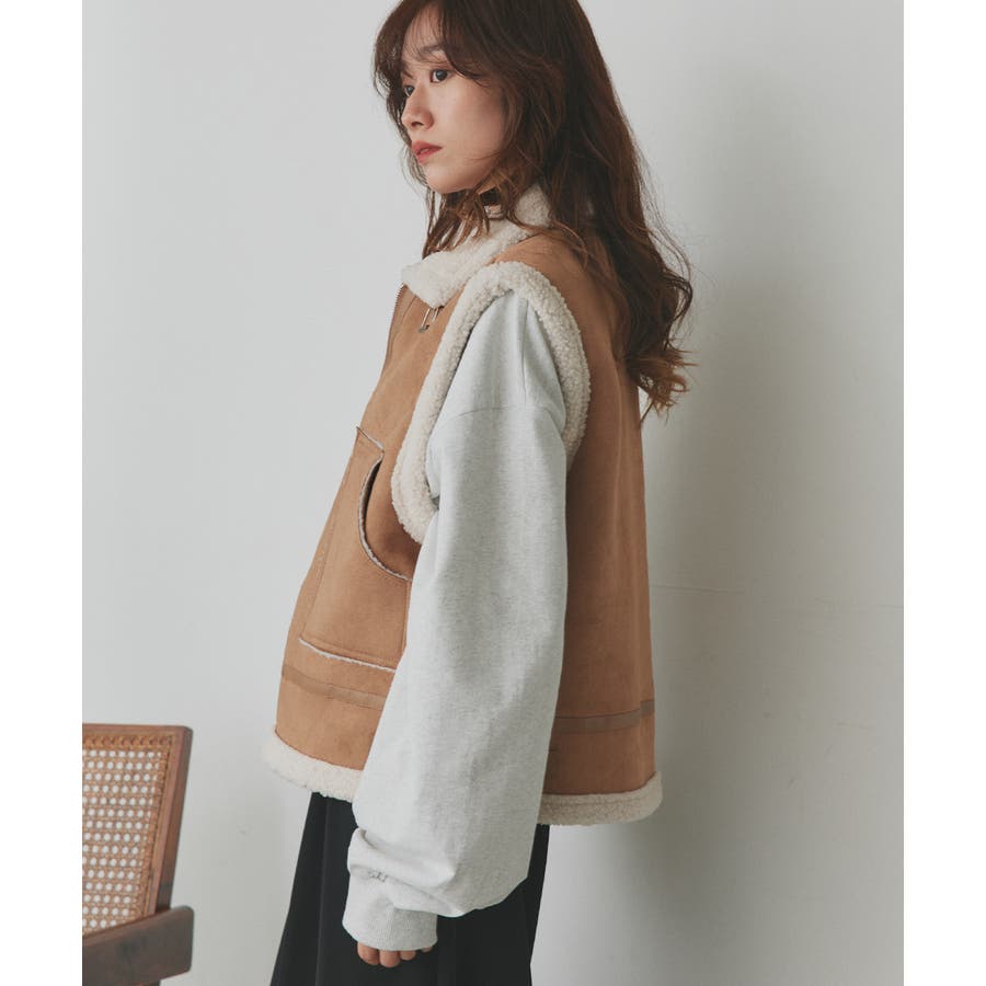 秋冬らしい季節感を演出できるフェイクムートン素材のベスト。
