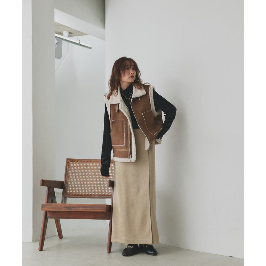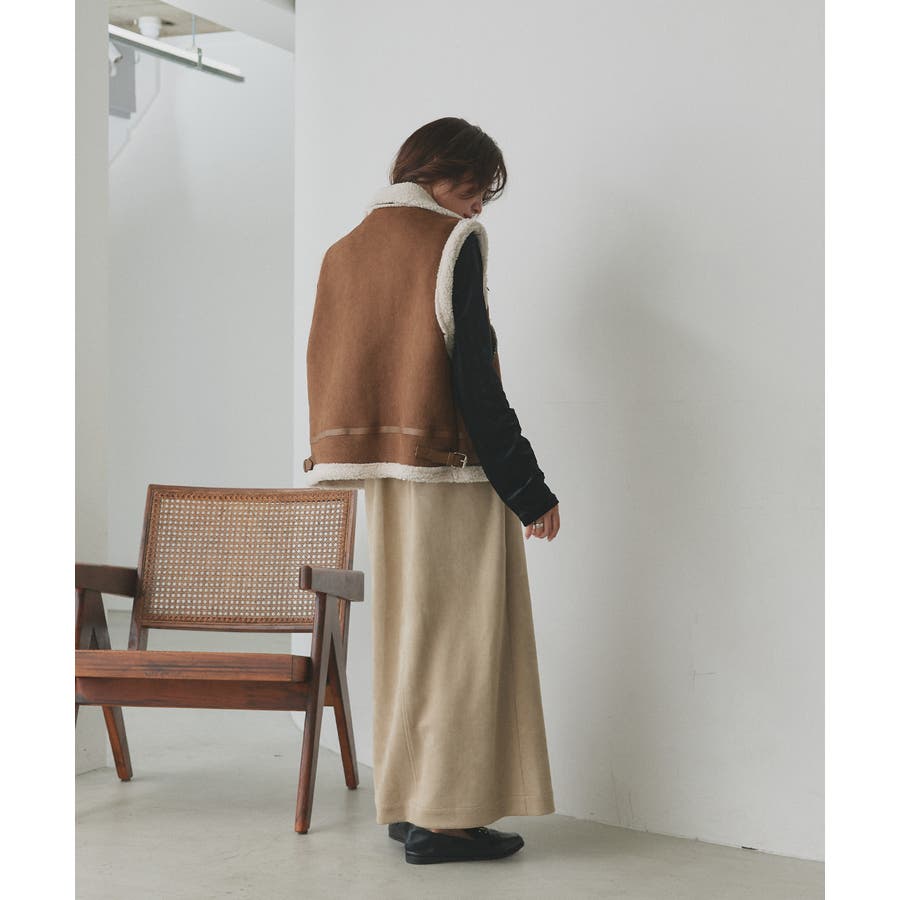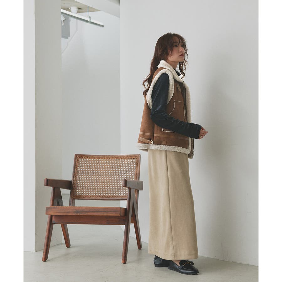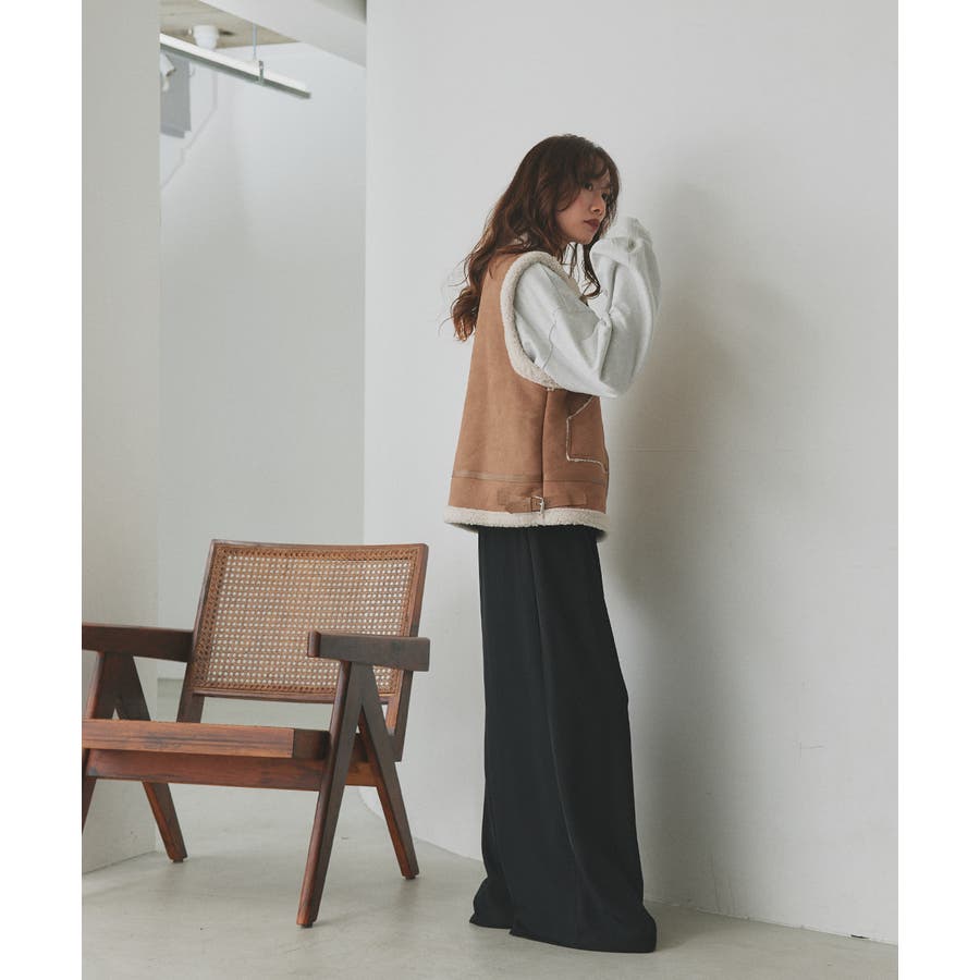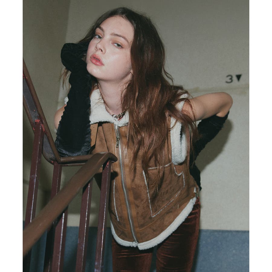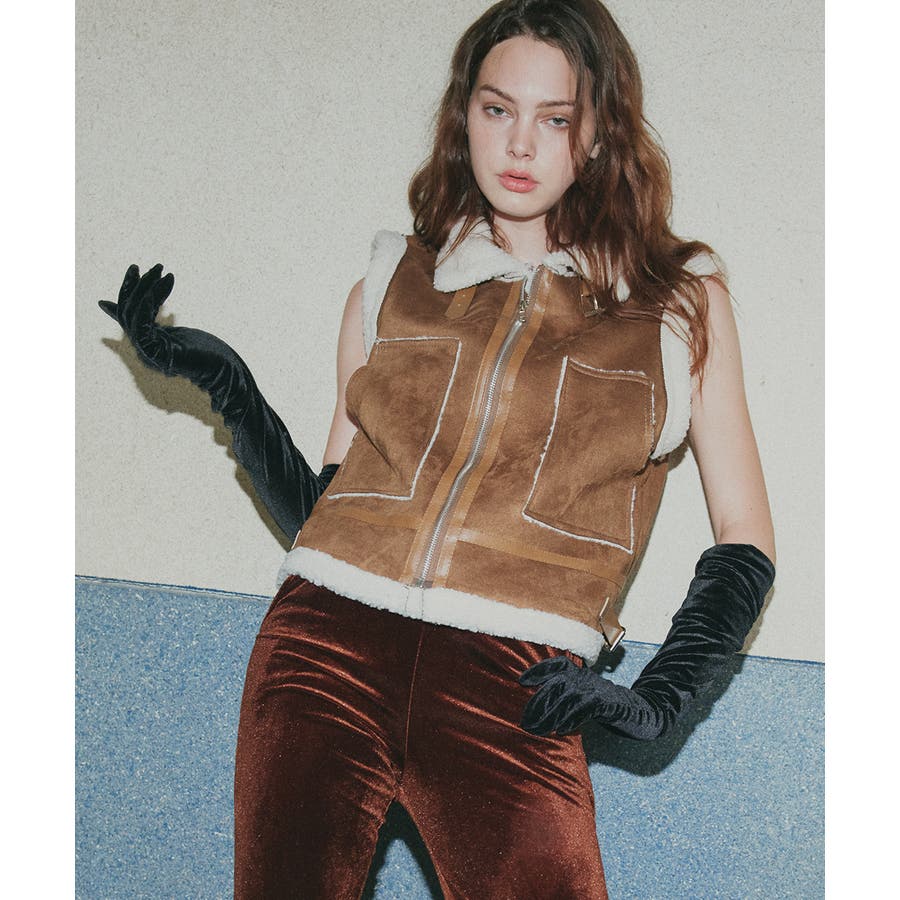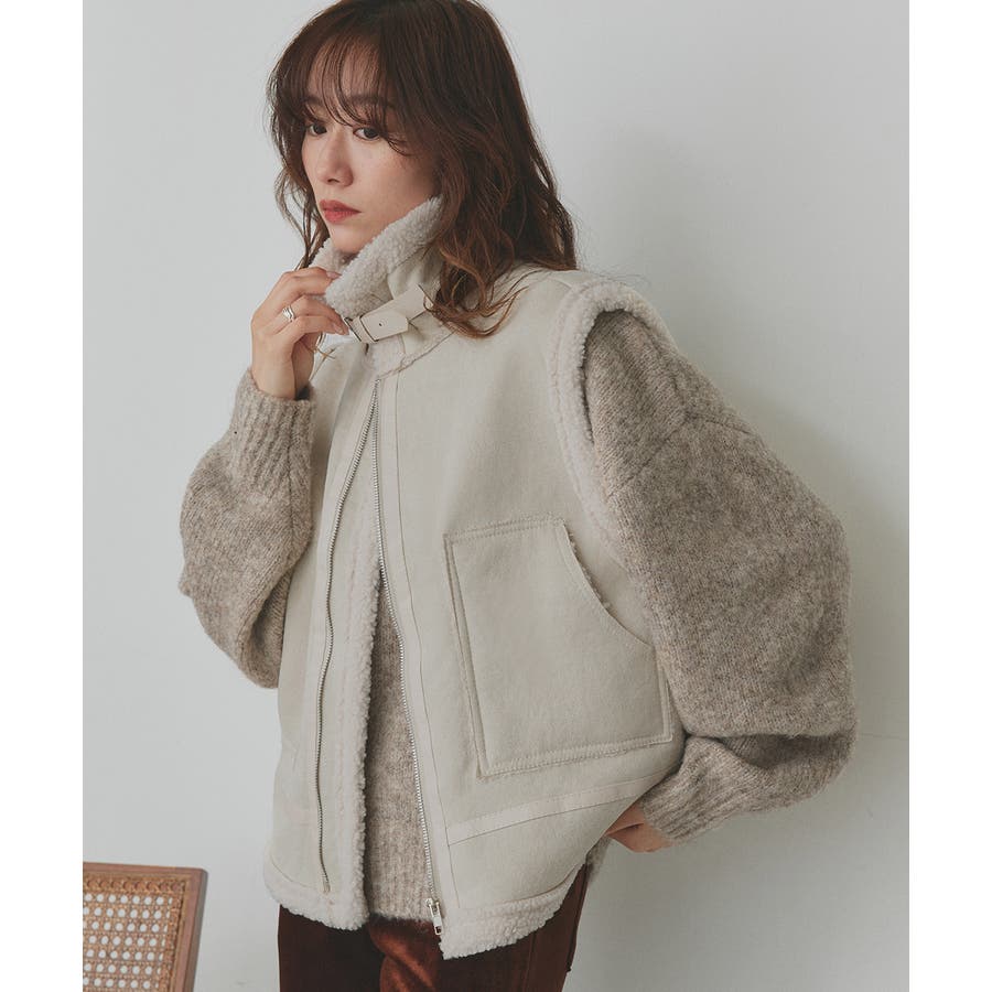 秋冬らしい季節感を演出できるフェイクムートン素材のベスト。