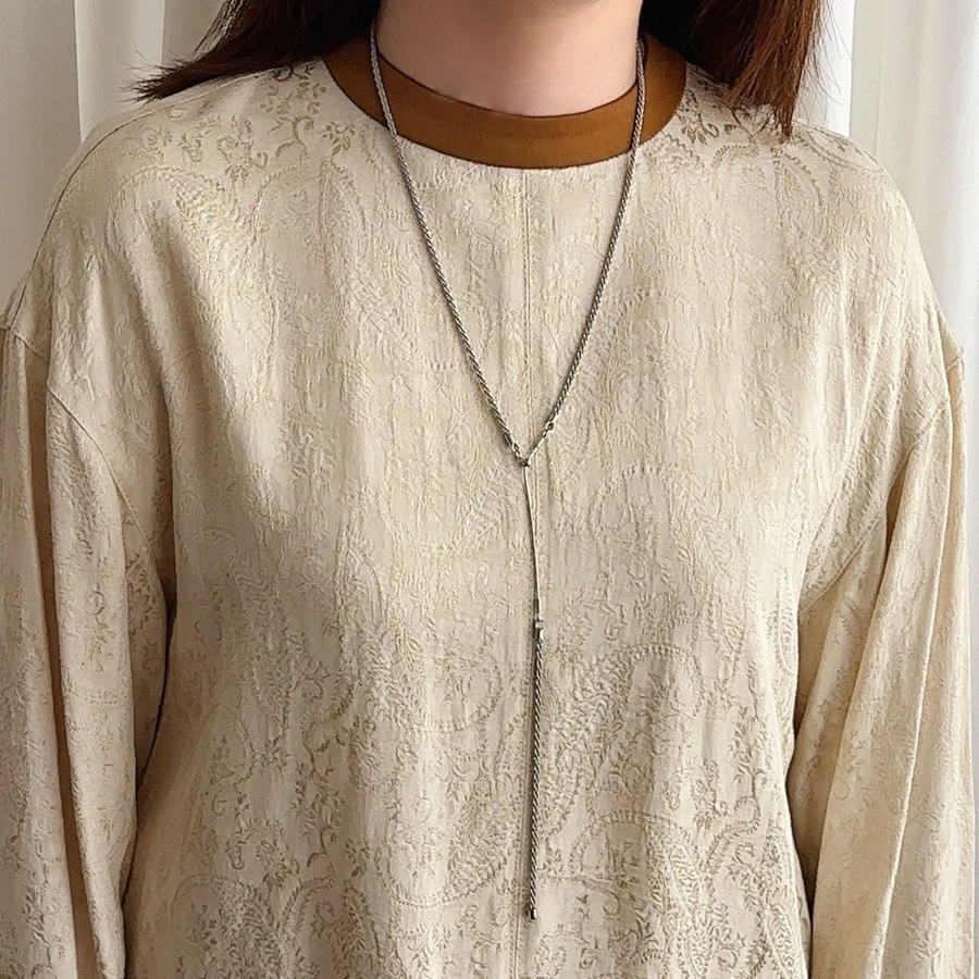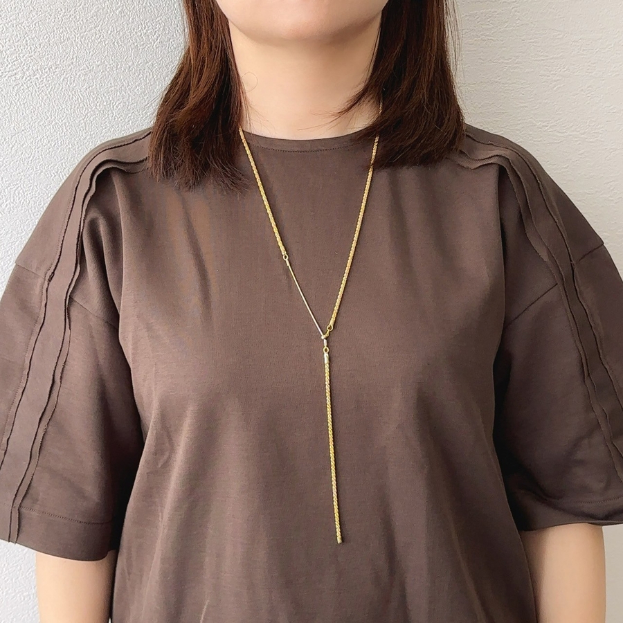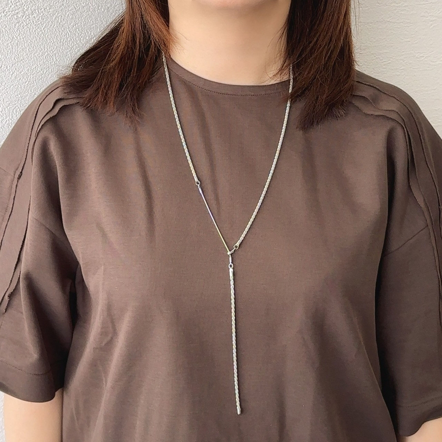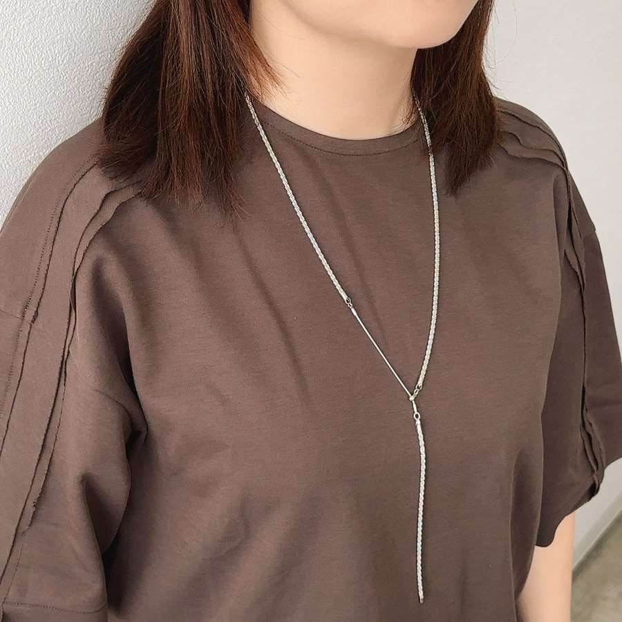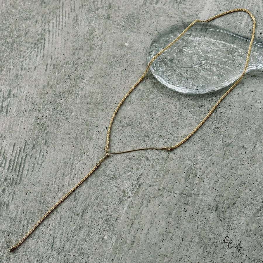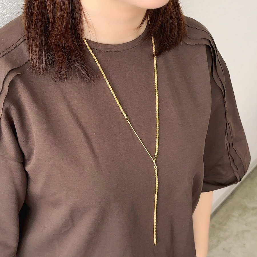 首元をすっきりと美しく見せる、Y字デザインのスクリューチェーンネックレス。