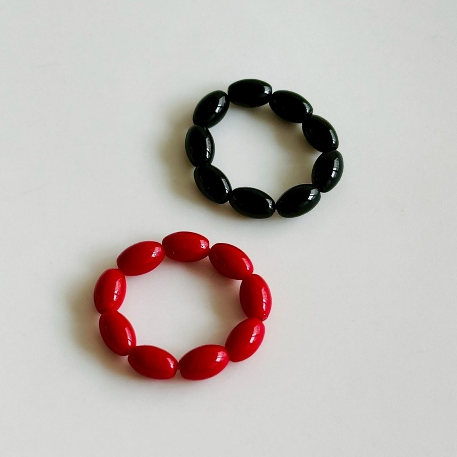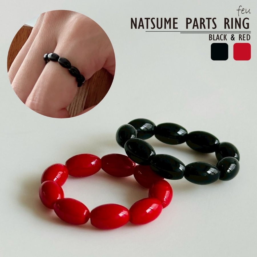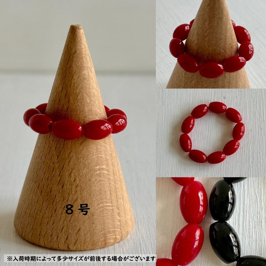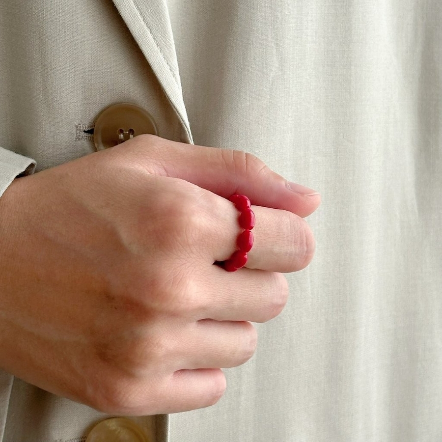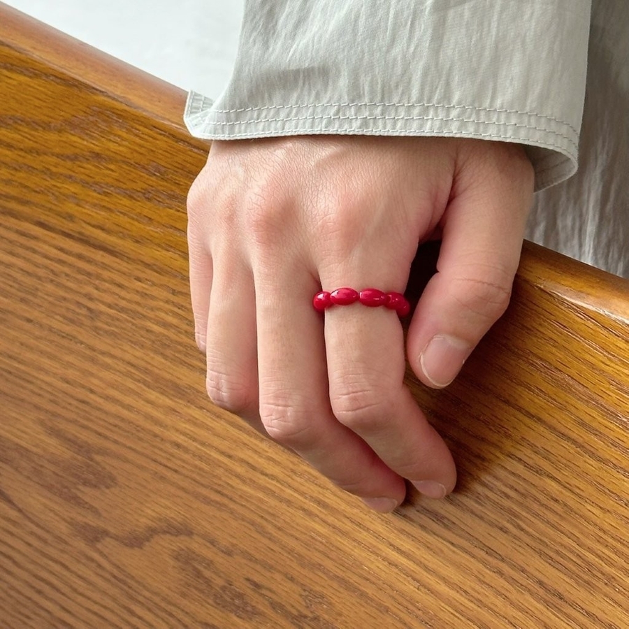 レッドとブラックのオーバルビーズリングが指元にアクセントを与えてくれるデザインリング。