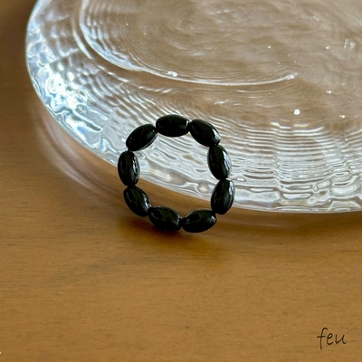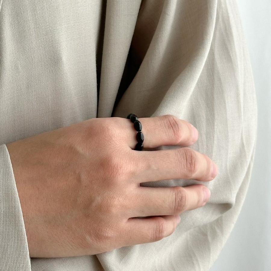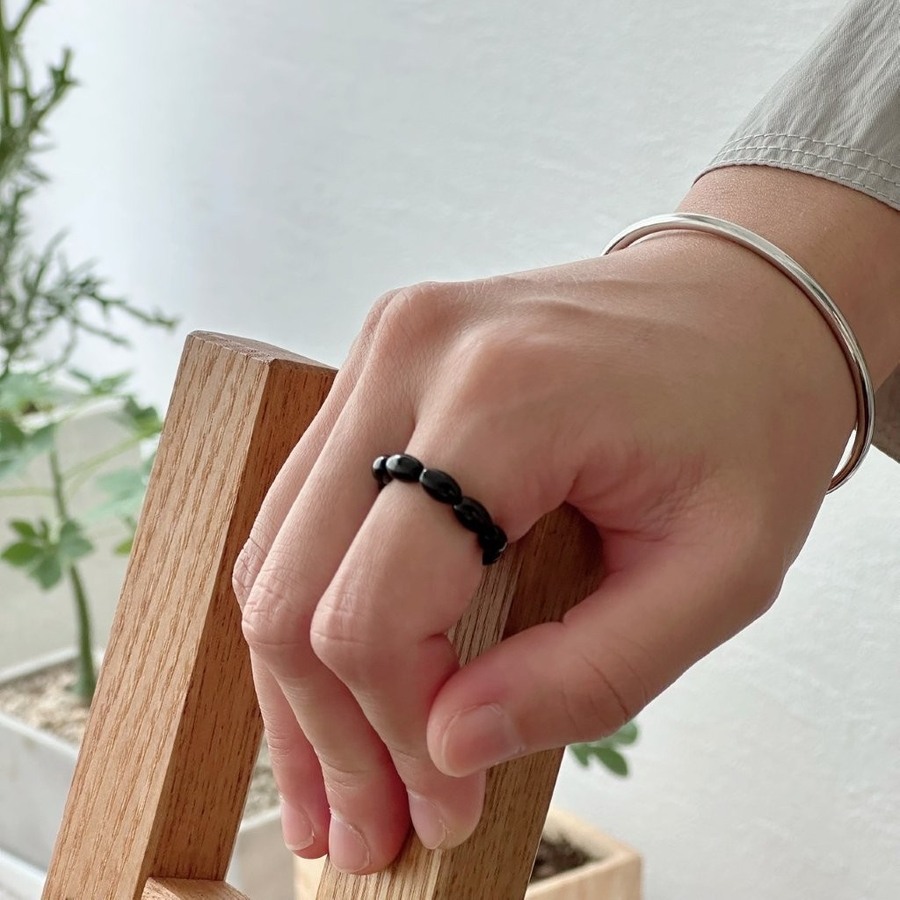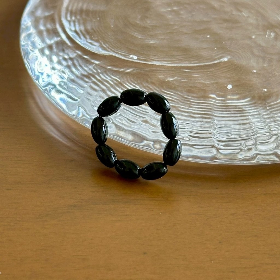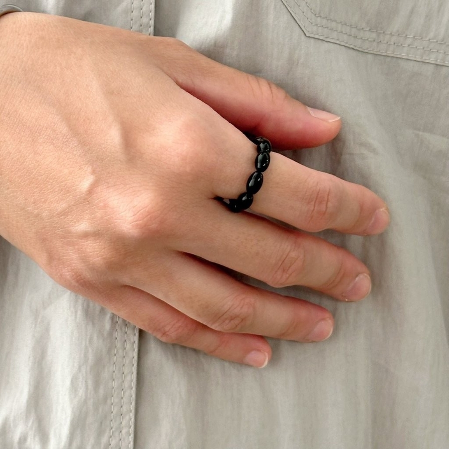 レッドとブラックのオーバルビーズリングが指元にアクセントを与えてくれるデザインリング。