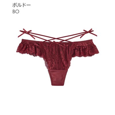 艶のあるサテンとコードがセクシーで華やかなデザインのTバックショーツ。サイドからぐるっと一周フリルが豪華でエレガントなデザインで、前部分で大きくクロスさせたコードでセクシーな印象に。コードテープにはサイド部分に小さなリボンをあしらい、可愛らしさをプラスしました。伸縮性のある生地とレースがお尻とお腹にぴったりフィットします。