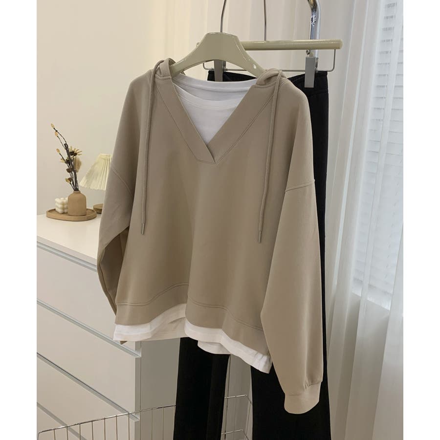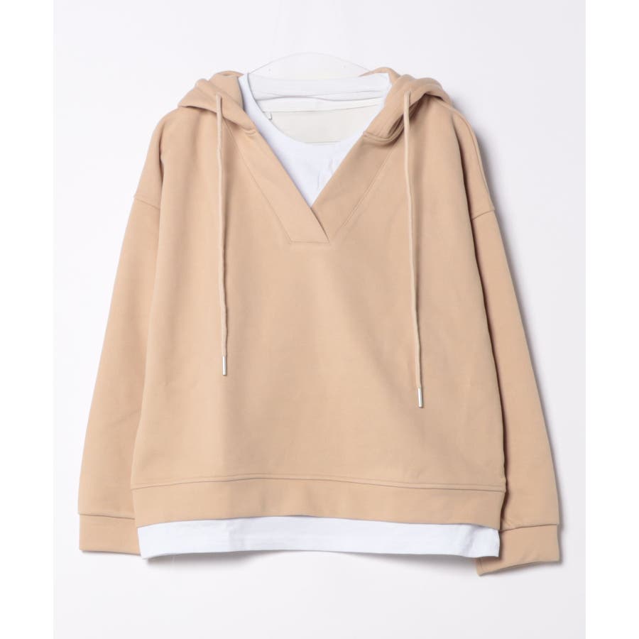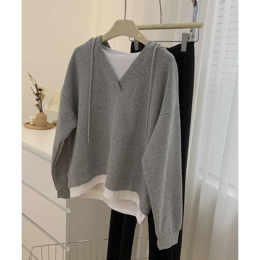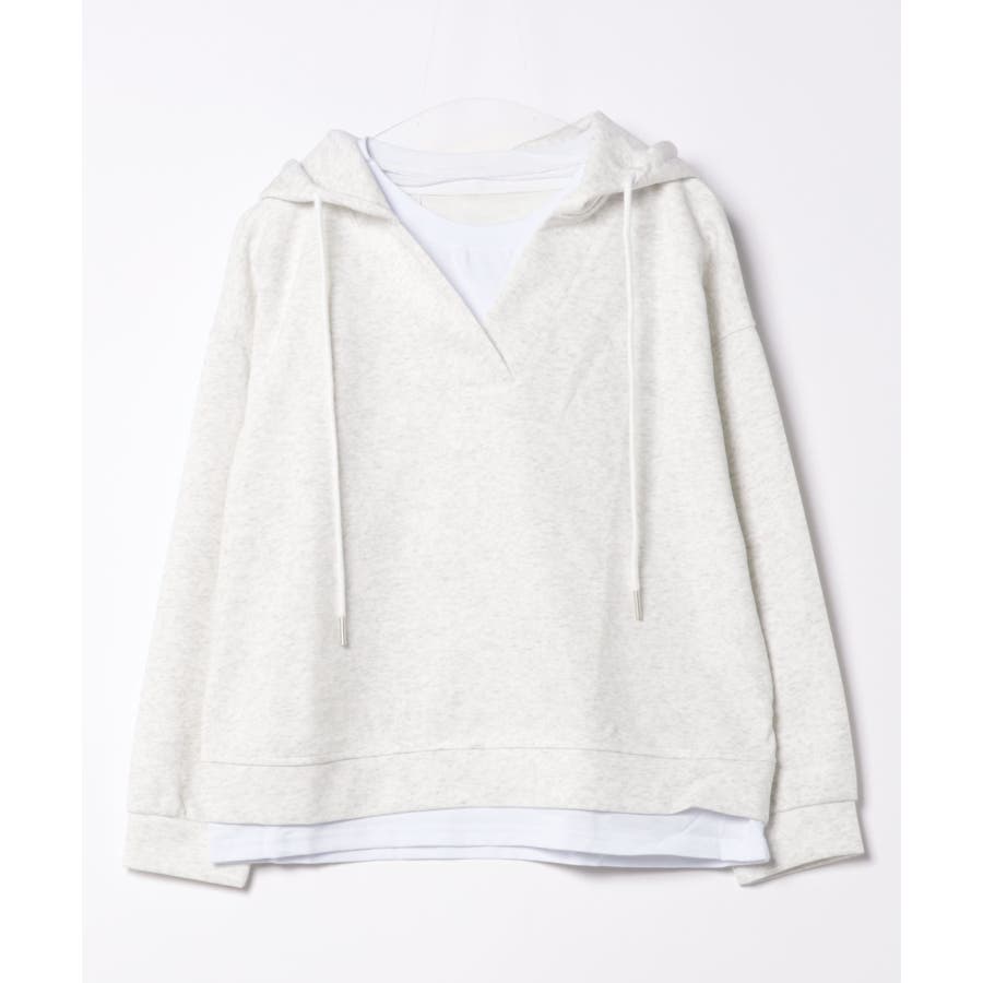 Tシャツとスウェットを重ね着したようなレイヤード風パーカーの登場です!深めのVネックスウェットにTシャツがついたデザインで、わざわざ重ね着しなくても1枚でサラッと着れるデザインです。また中でTシャツがズレてしまう心配もなく、裾から見えるレイヤー感がさりげなくておしゃれです。ベーシックカラーなのでボトムスはなんでも合わせやすく、着回しができるので1枚あるとコーディネートに困りません!洗濯の手間も省け、急なお出かけにもサッと着替えられるので1枚あると便利です!