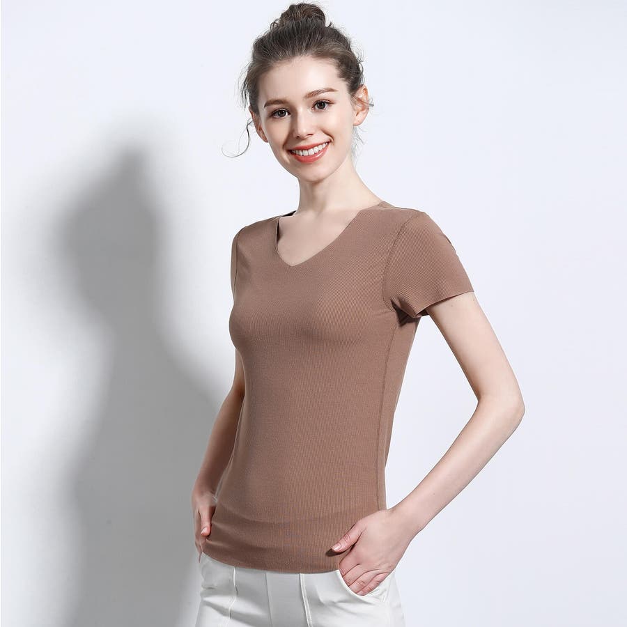 切りっぱなしのリブ生地を使用したTeeシャツ。通気性がよく蒸れず、シンプルながらもデコルテを綺麗に強調してくれる女性らしい一枚。