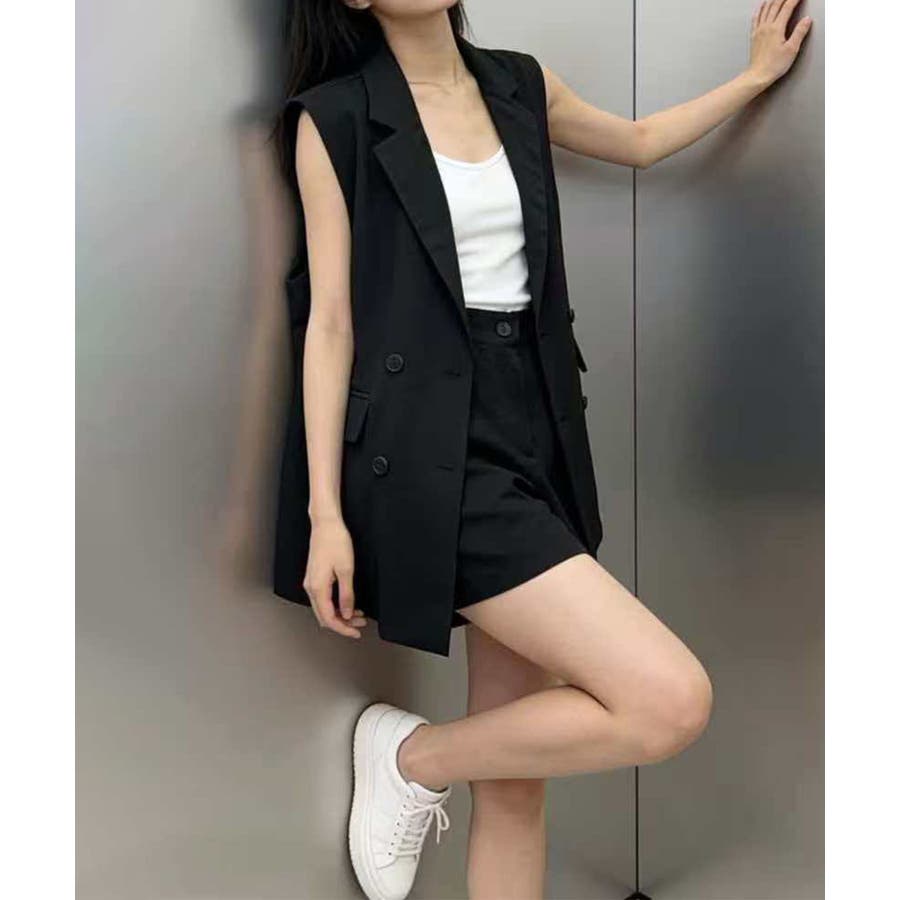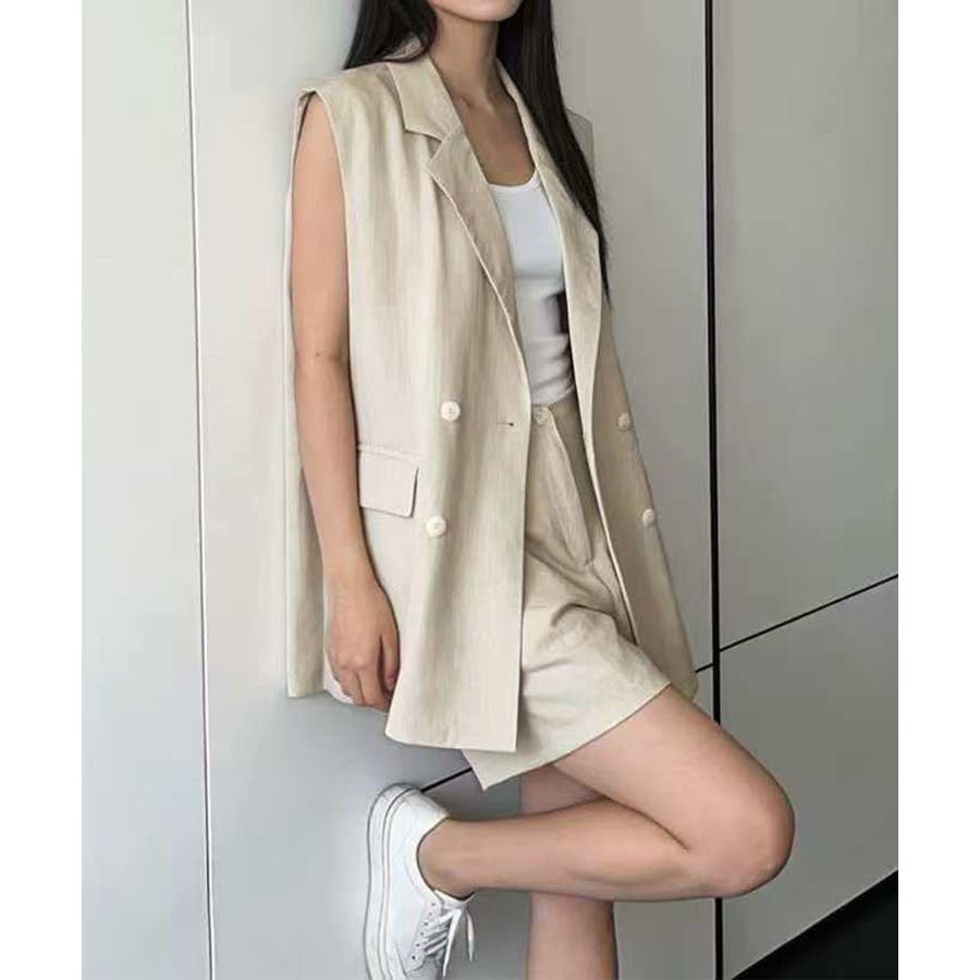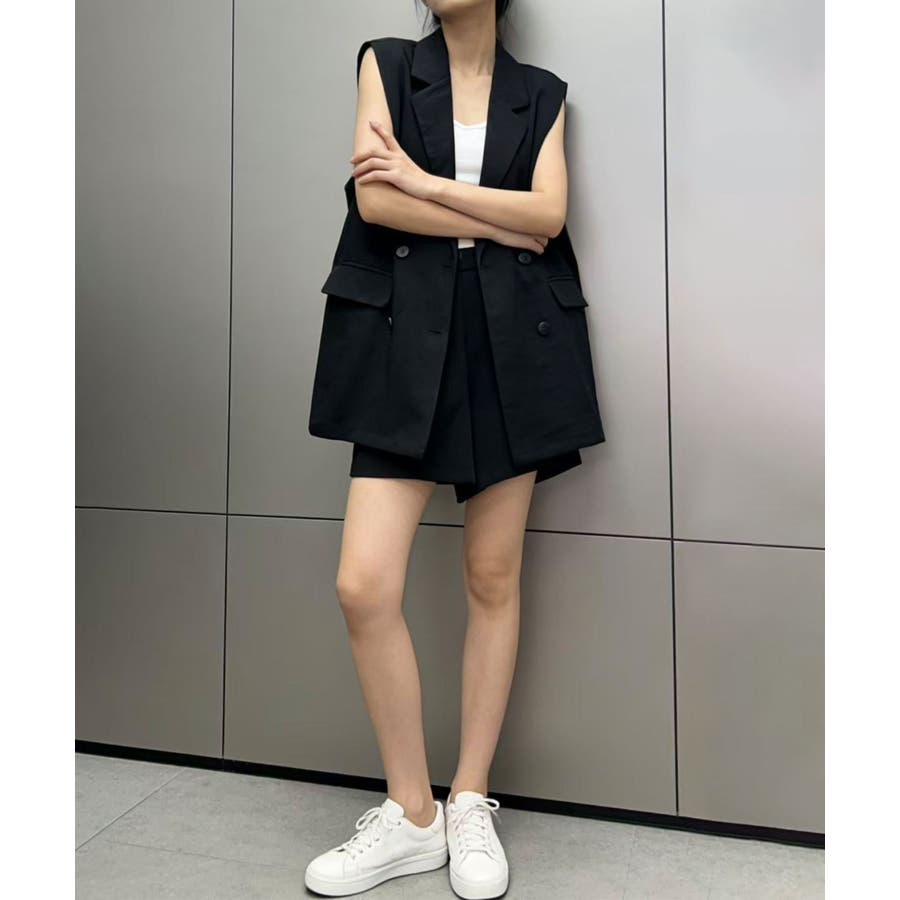 ノースリーブジャケットとショートパンツがセットになった、大人のハンサムセットアップ
