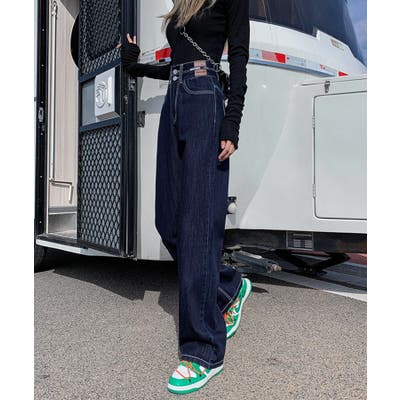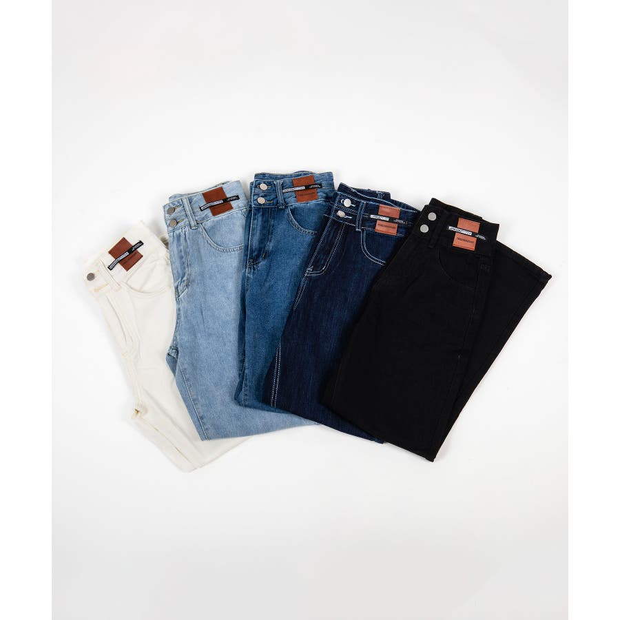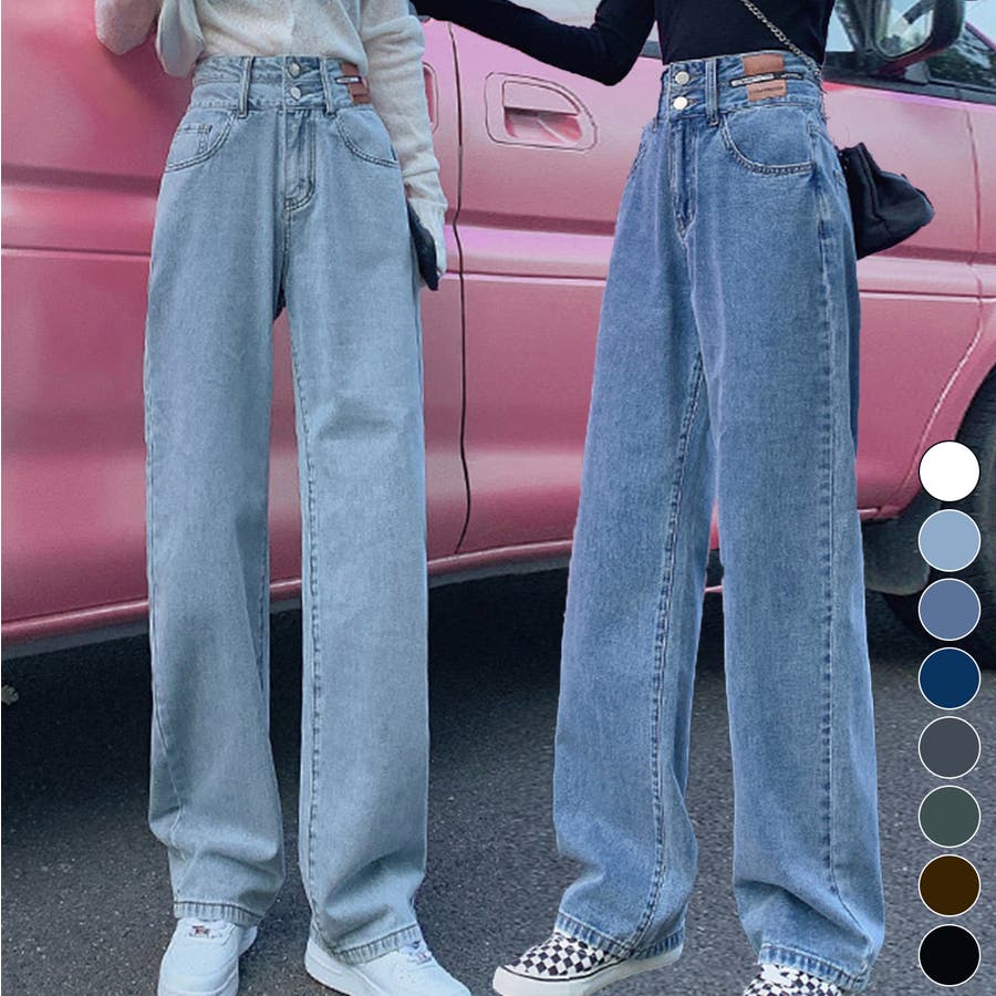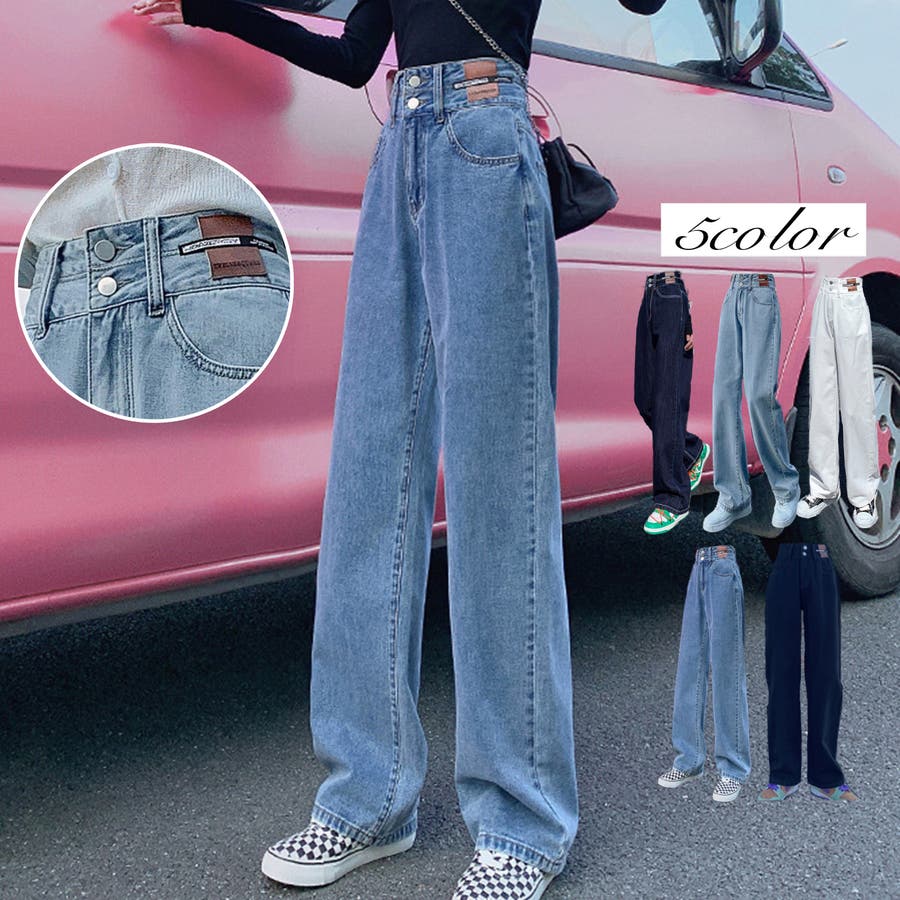【ブルー】2ボタンハイウエストストレートワイドデニムパンツ 全5色 韓国ファッション