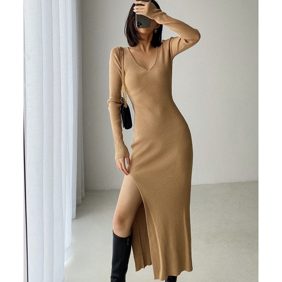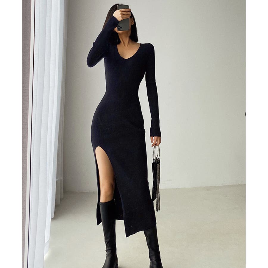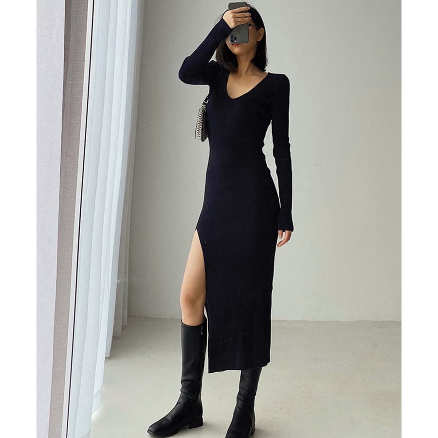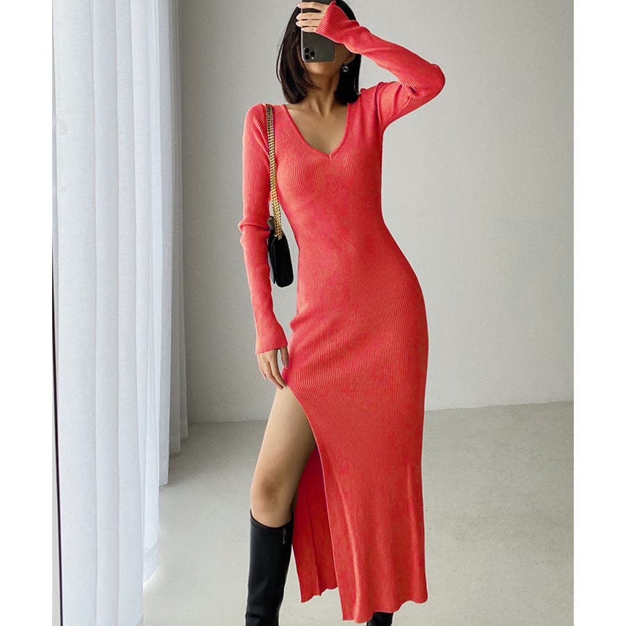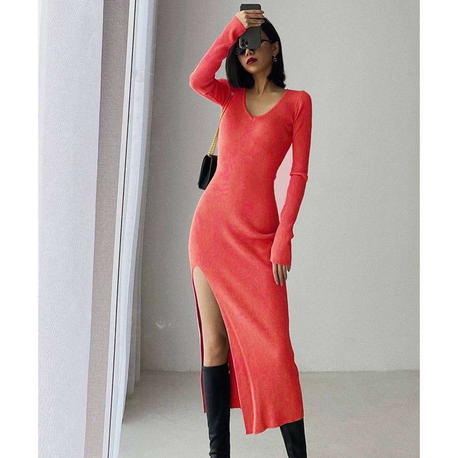 【レッド】ニットワンピース ニットスリットVネックロングニットワンピース 韓国ファッション