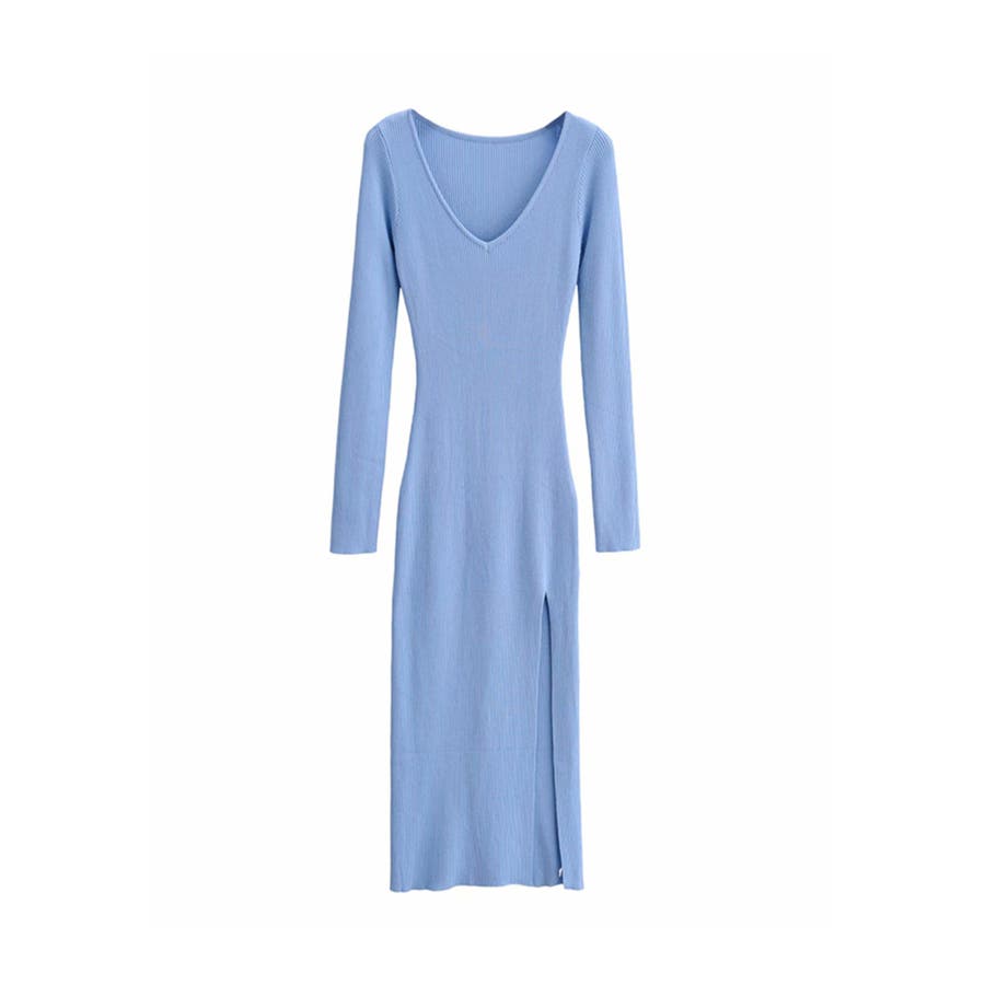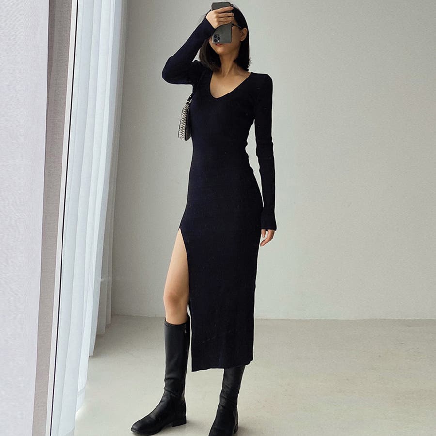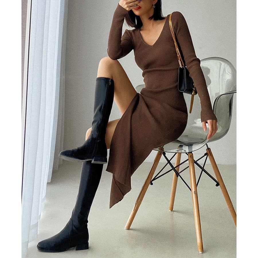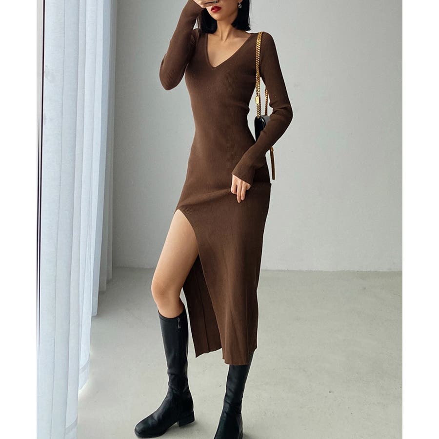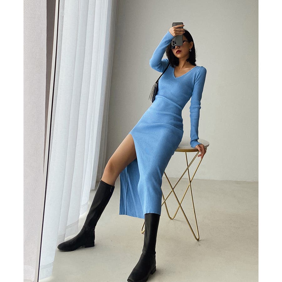 【レッド】ニットワンピース ニットスリットVネックロングニットワンピース 韓国ファッション