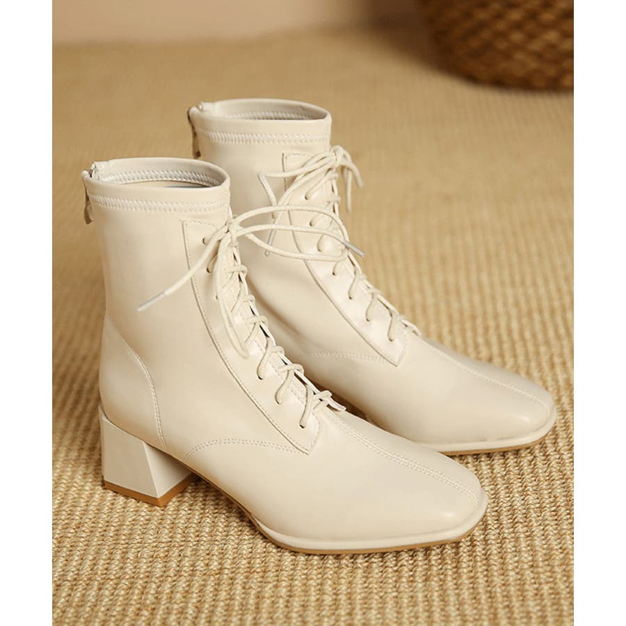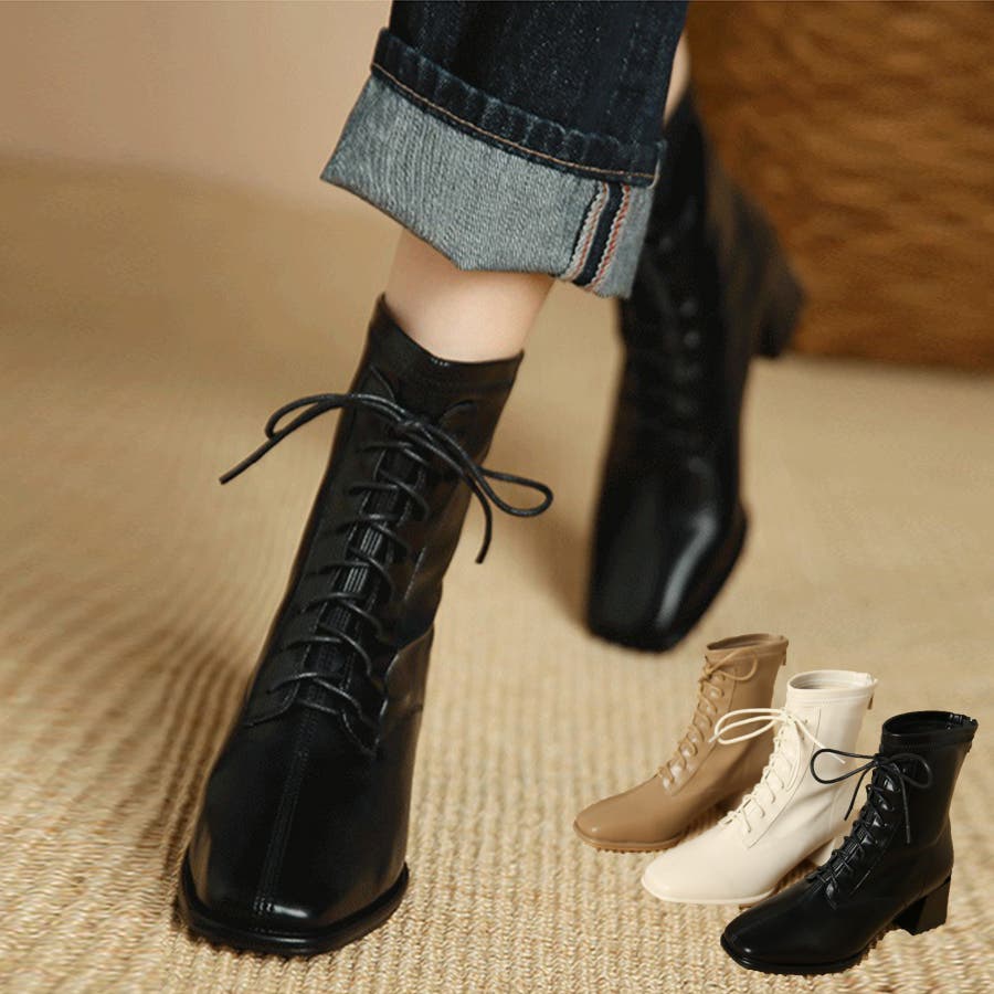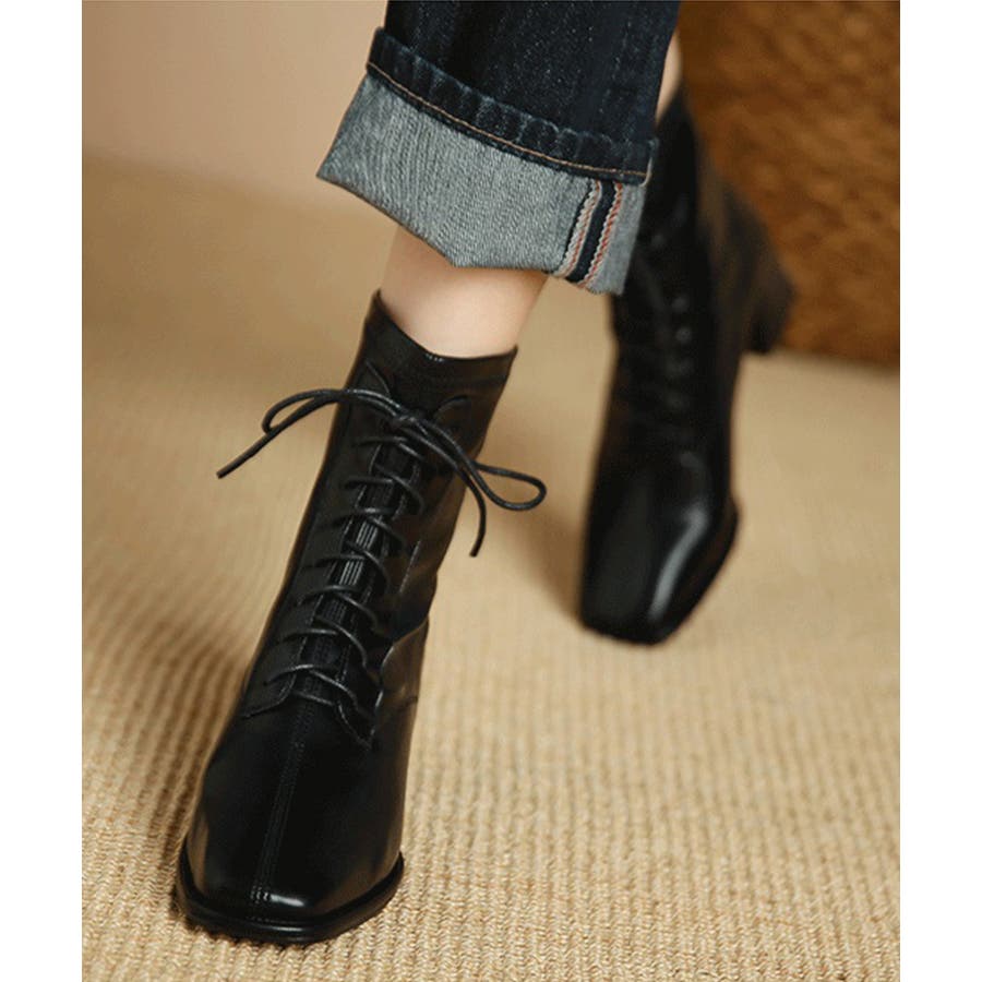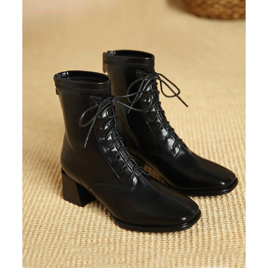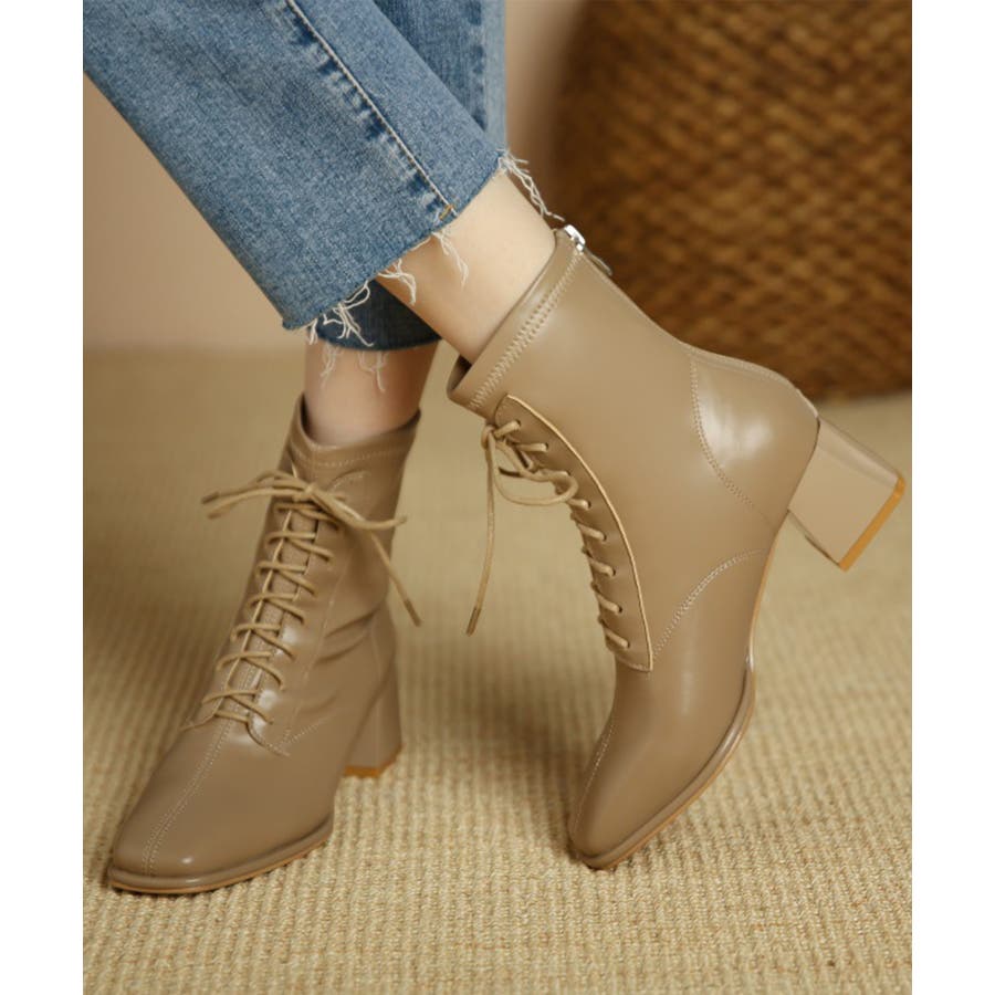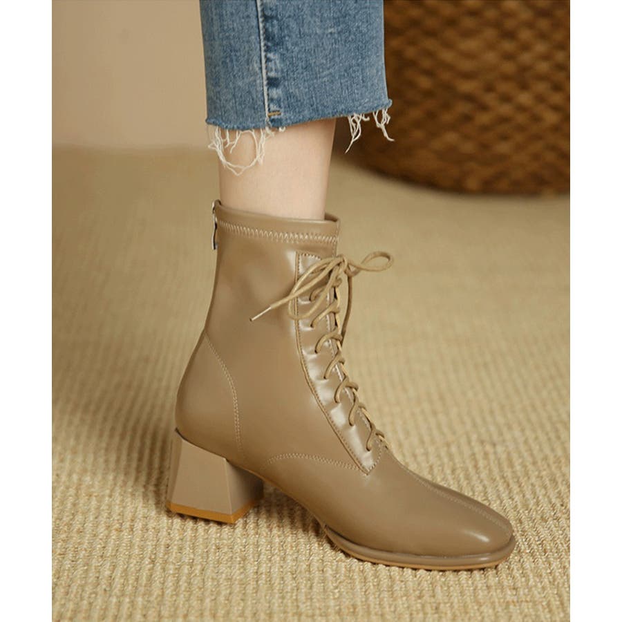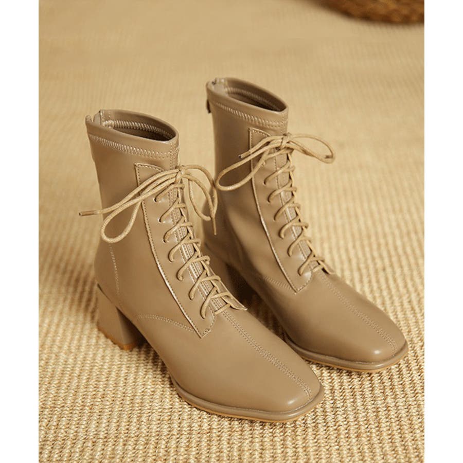 クラシカルなスクエアトゥのローヒールショートブーツ。レースアップのデザインがおしゃれ感UP,後側ジッパーで脱ぎ履きが楽ちんです。高すぎない太ヒールなので、安定感も抜群。タイトシルエットで、足首も細く見せてくれます!これからの季節にデニムパンツ、スカートなどのコーデを楽しめます。
