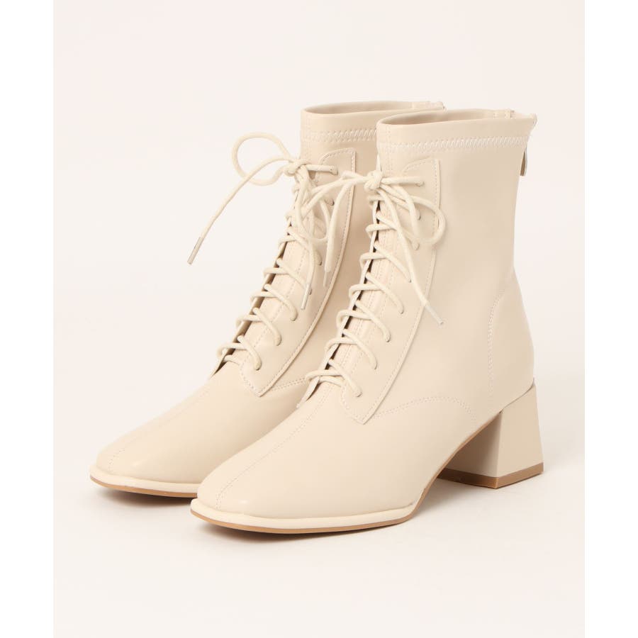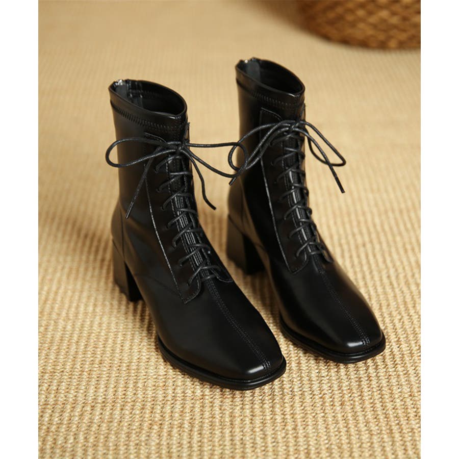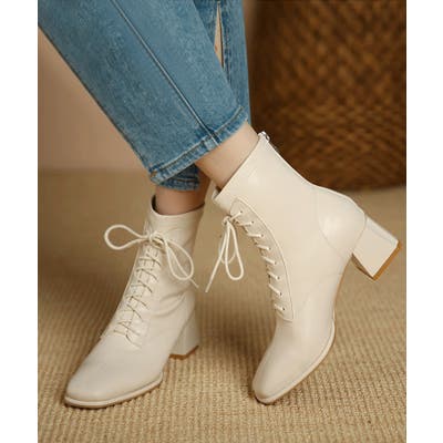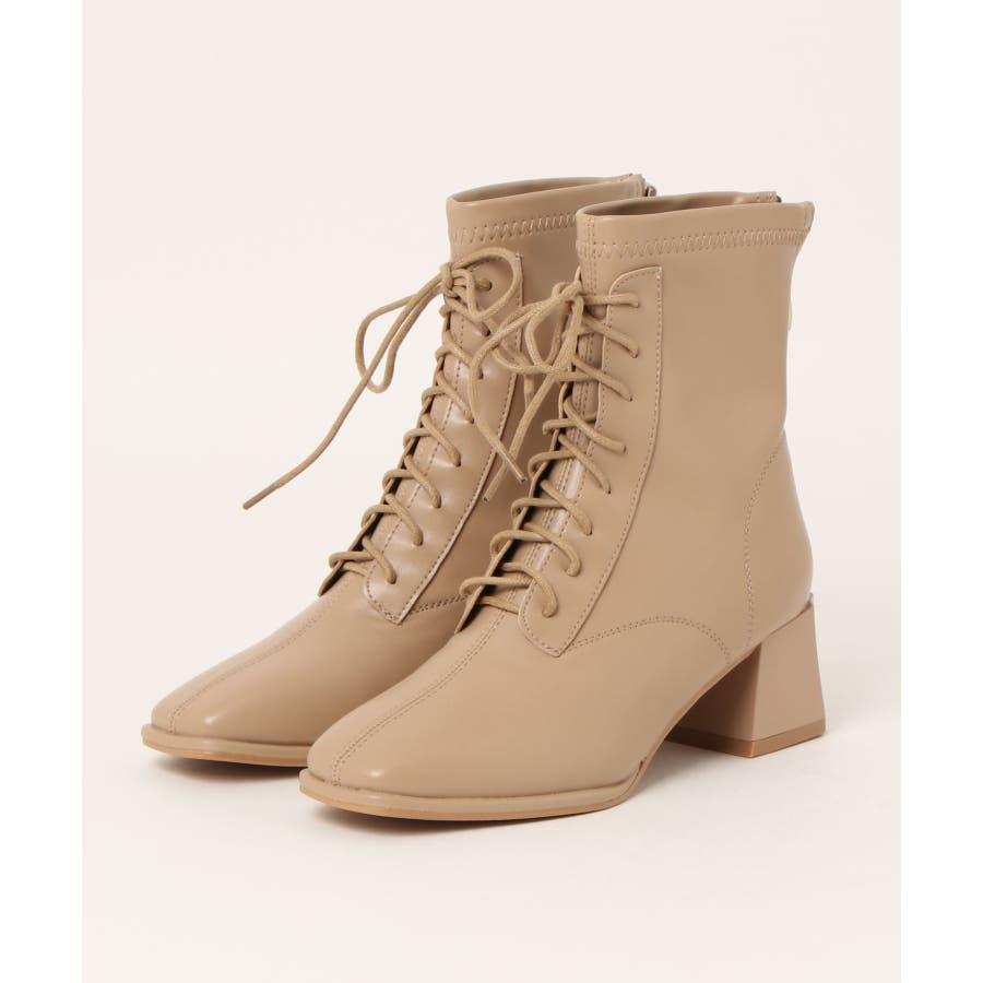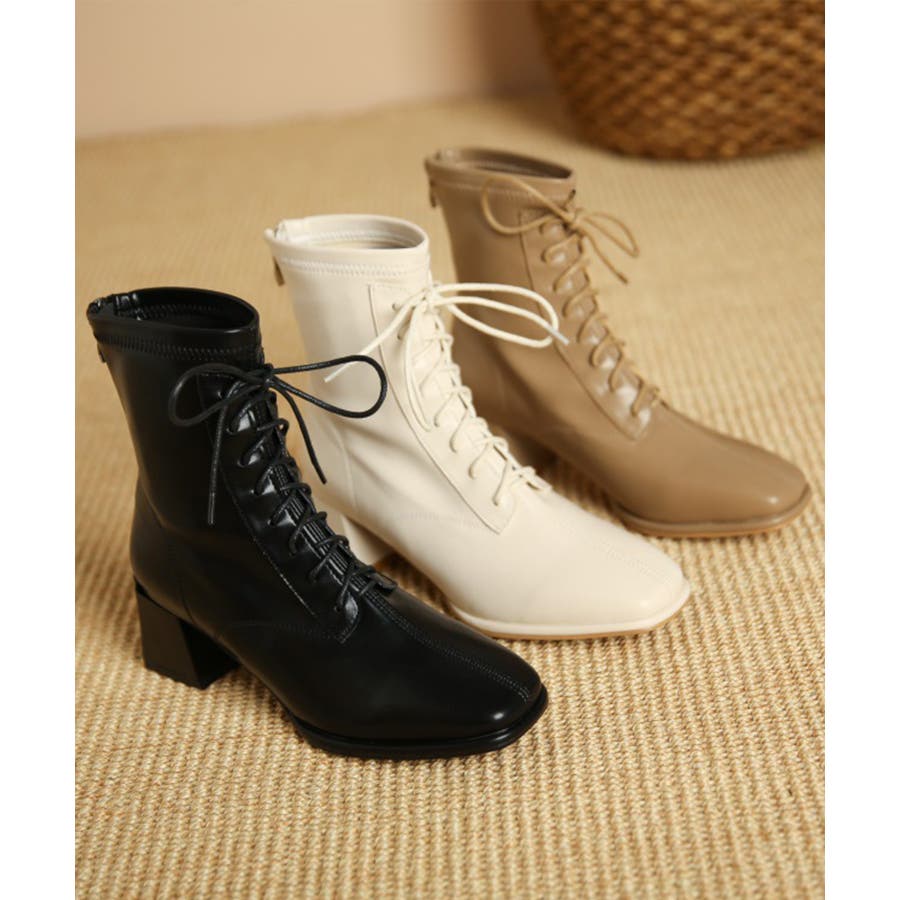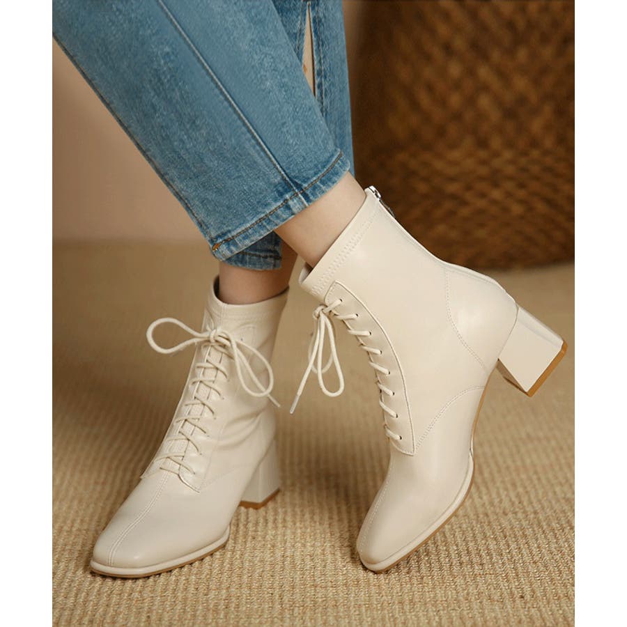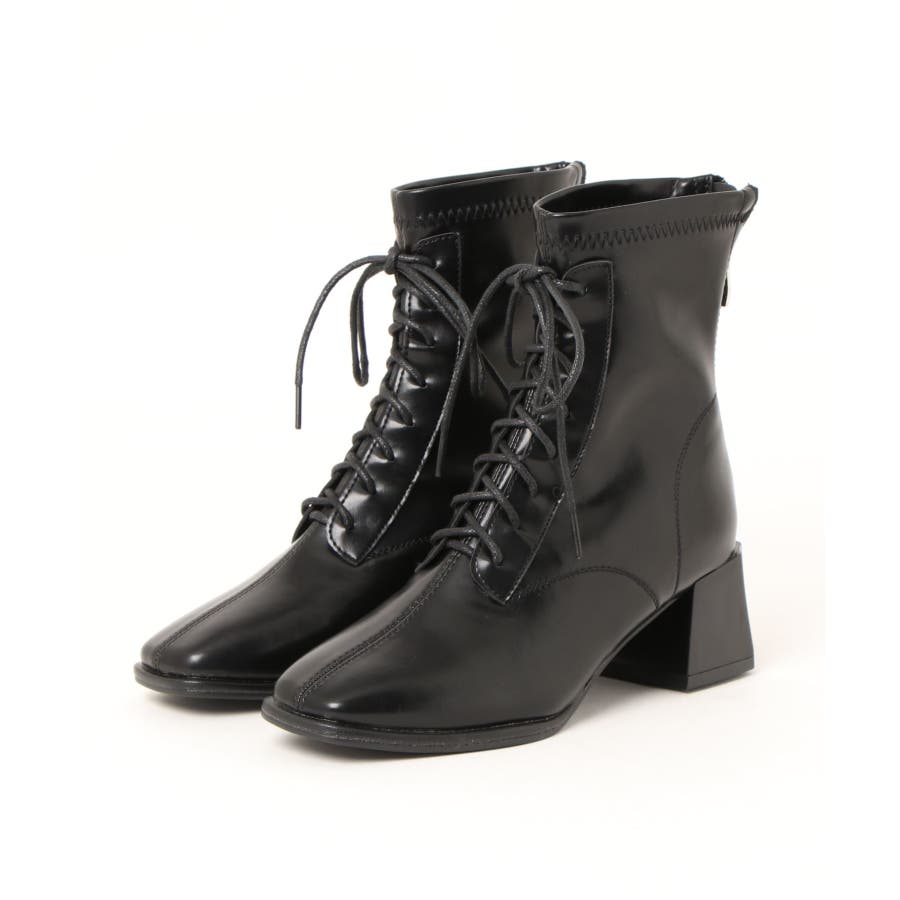 クラシカルなスクエアトゥのローヒールショートブーツ。レースアップのデザインがおしゃれ感UP,後側ジッパーで脱ぎ履きが楽ちんです。高すぎない太ヒールなので、安定感も抜群。タイトシルエットで、足首も細く見せてくれます!これからの季節にデニムパンツ、スカートなどのコーデを楽しめます。
