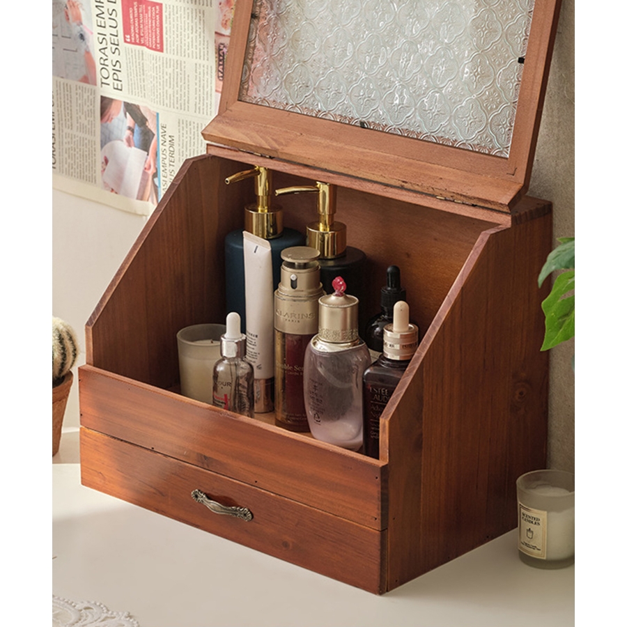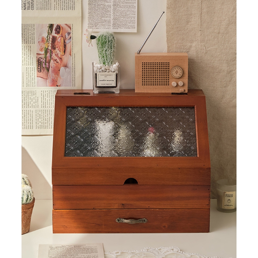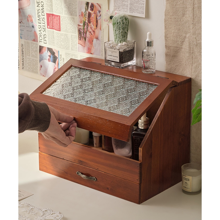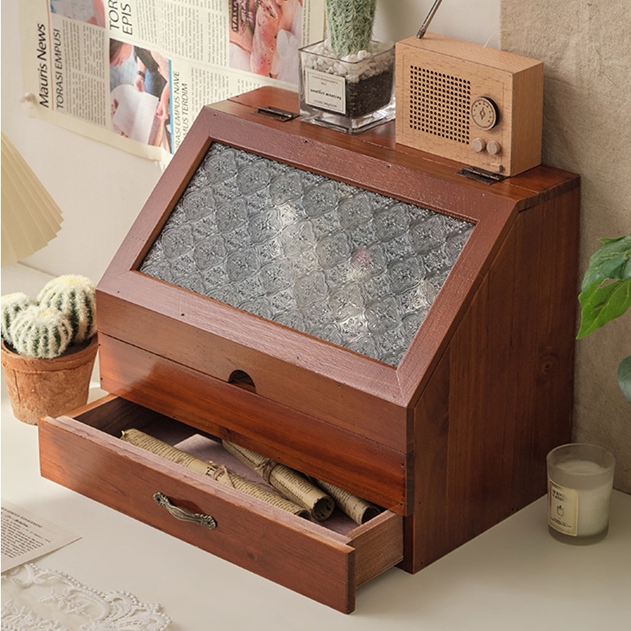ビンテージスタイルのアクセサリーやメイク道具、キッチン収納にも最適な収納ボックス。アンティークな美しさと温かみを感じさせるデザインで、どんなインテリアにもマッチします。コンパクトながら、小物類を整理整頓するのに十分な大きさ。アクセサリーや化粧品、文房具など、さまざまな小物を収納できます。ボックス本体は、木製で作られており、表面にはヴィンテージの風合いが施されています。内側には、細かいものを収納するのに便利な仕切りがあり、小物同士がぶつかって傷つくことを防ぎます。ボックスの取っ手は、古い時代のアンティーク家具のような趣きがあります。引き出し式で、収納物を簡単に取り出すことができます。