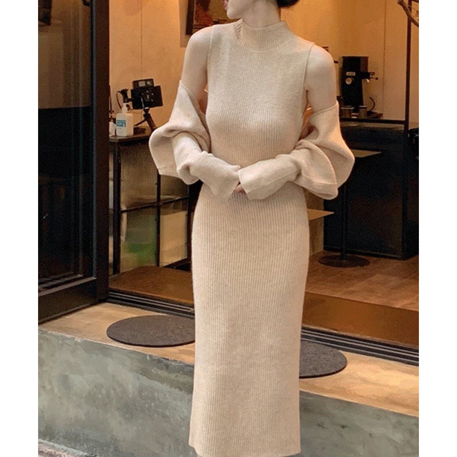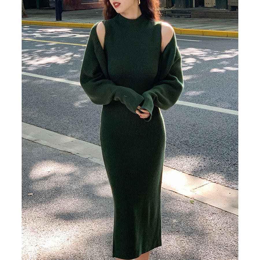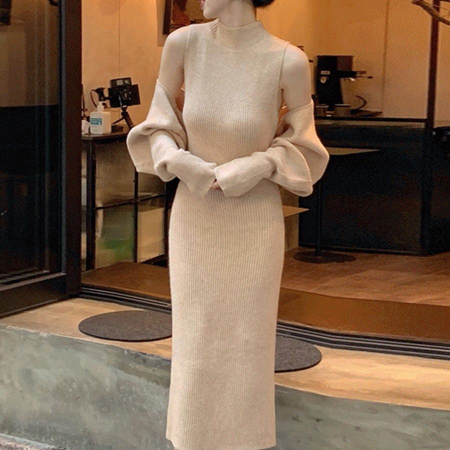 2点セット タートルネックニットワンピース&ニットカーディガン 韓国ファッション