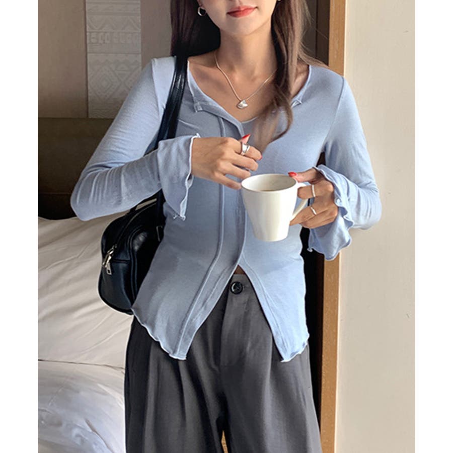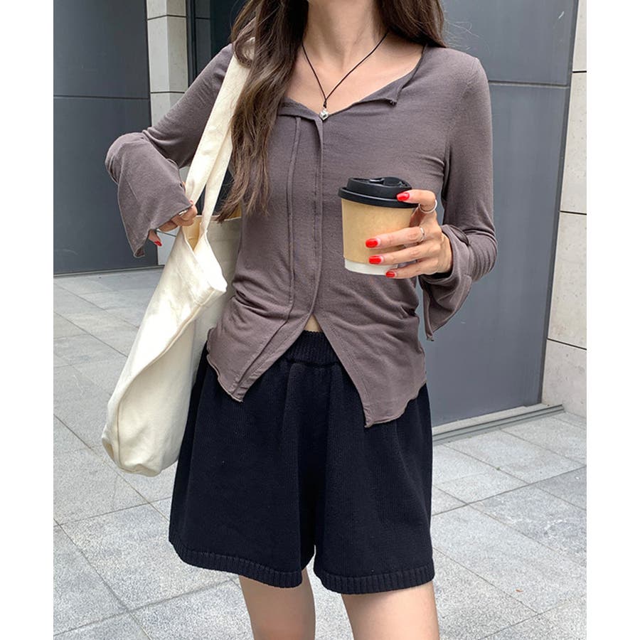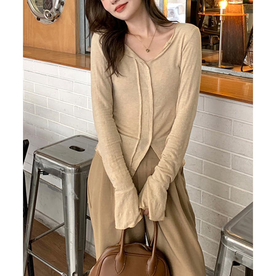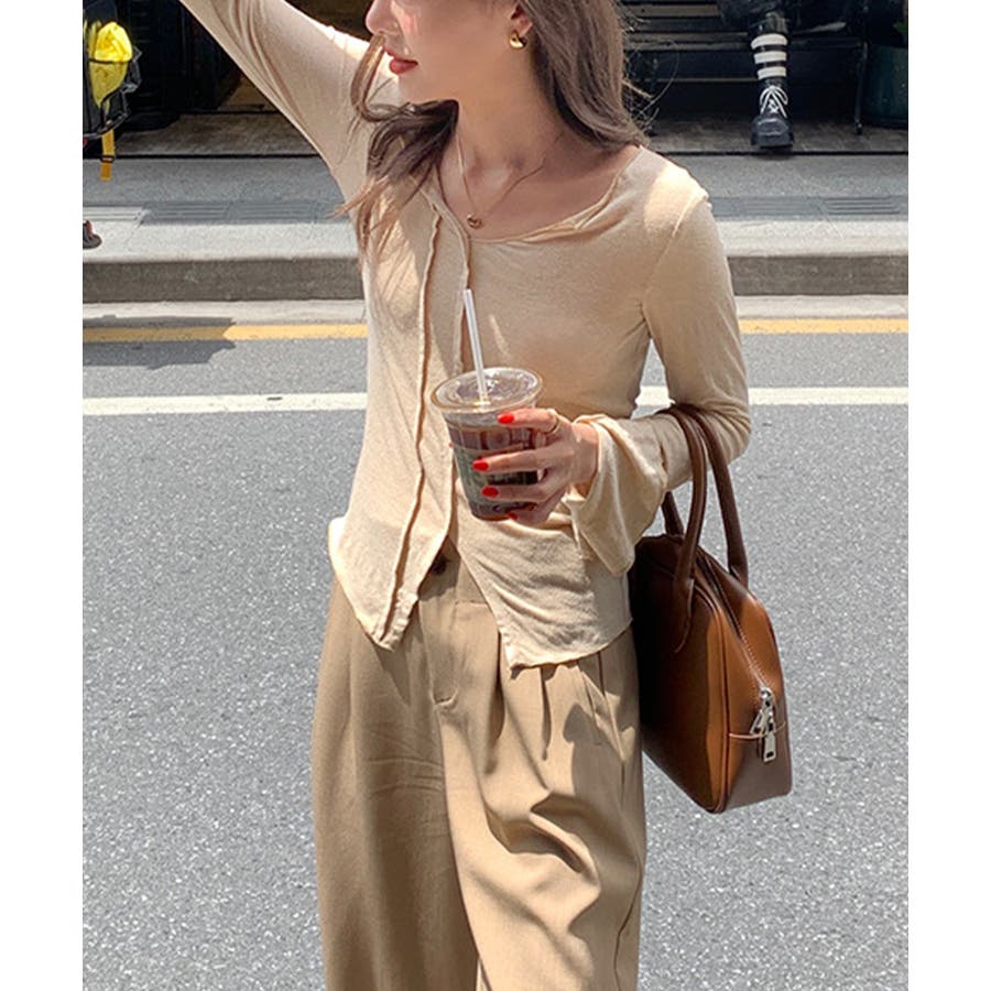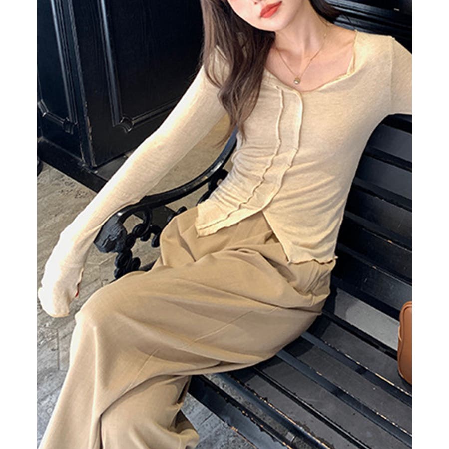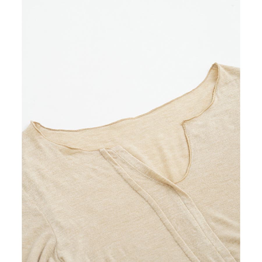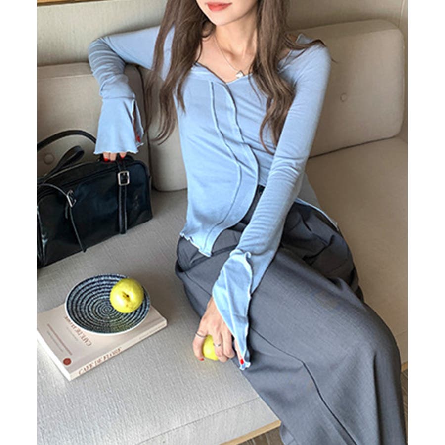 衿ぐりと裾が開いたデザインのカットソートップスです!体にフィットする細身のデザインで、薄手なのでインナーと合わせてお使いいただけます。衿まわりが開いてるのでデコルテラインがキレイに見え、アクセサリーとの相性も抜群!裾はウエスト辺りまで開いているので脚長効果も期待できます。シンプルなアイテムなので合わせやすく、ボトムスにはスカートやタックドパンツなどボリュームのあるものを持ってくるとバランスがいいです!