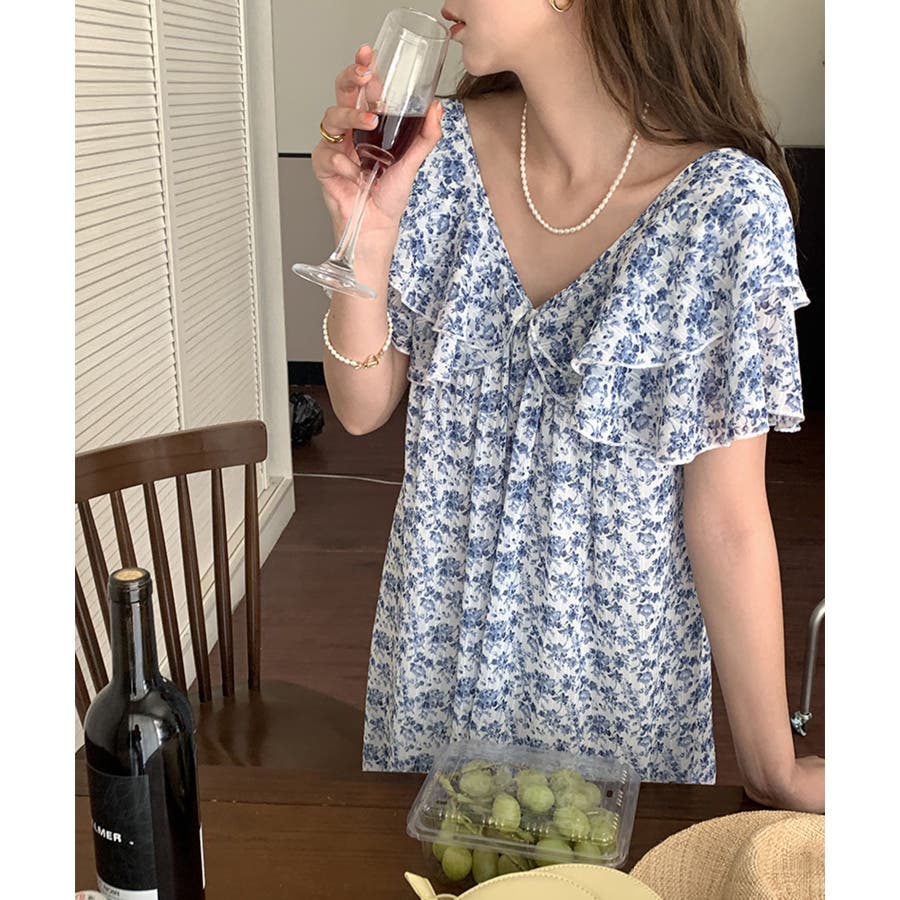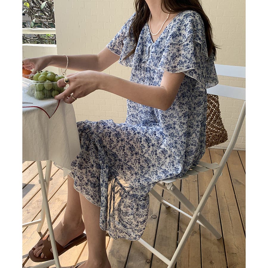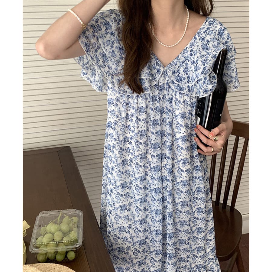 韓国風小花柄ビッグ襟裏地付きワンピース 韓国ファッション ハイウエスト