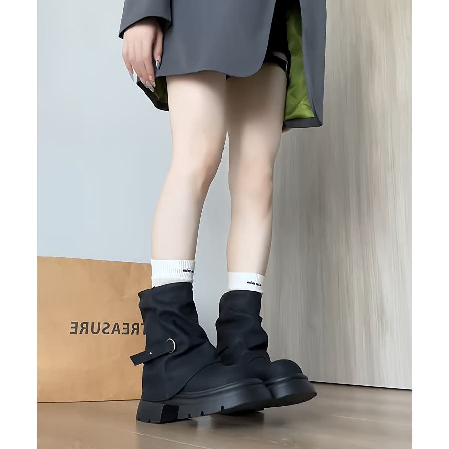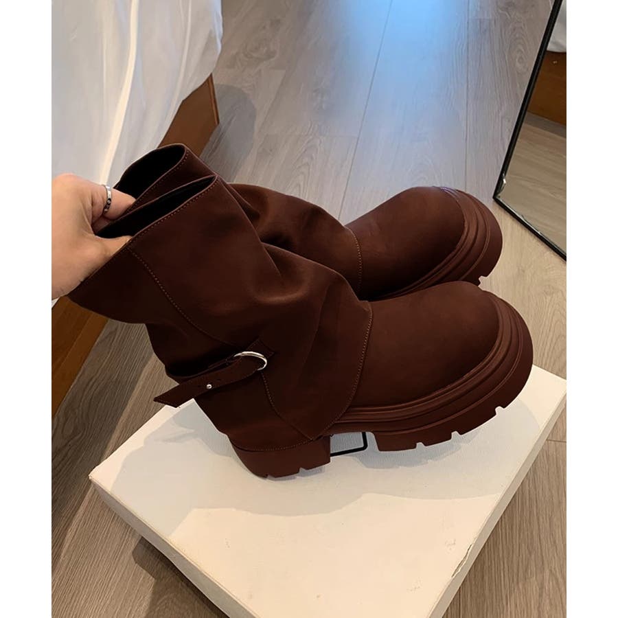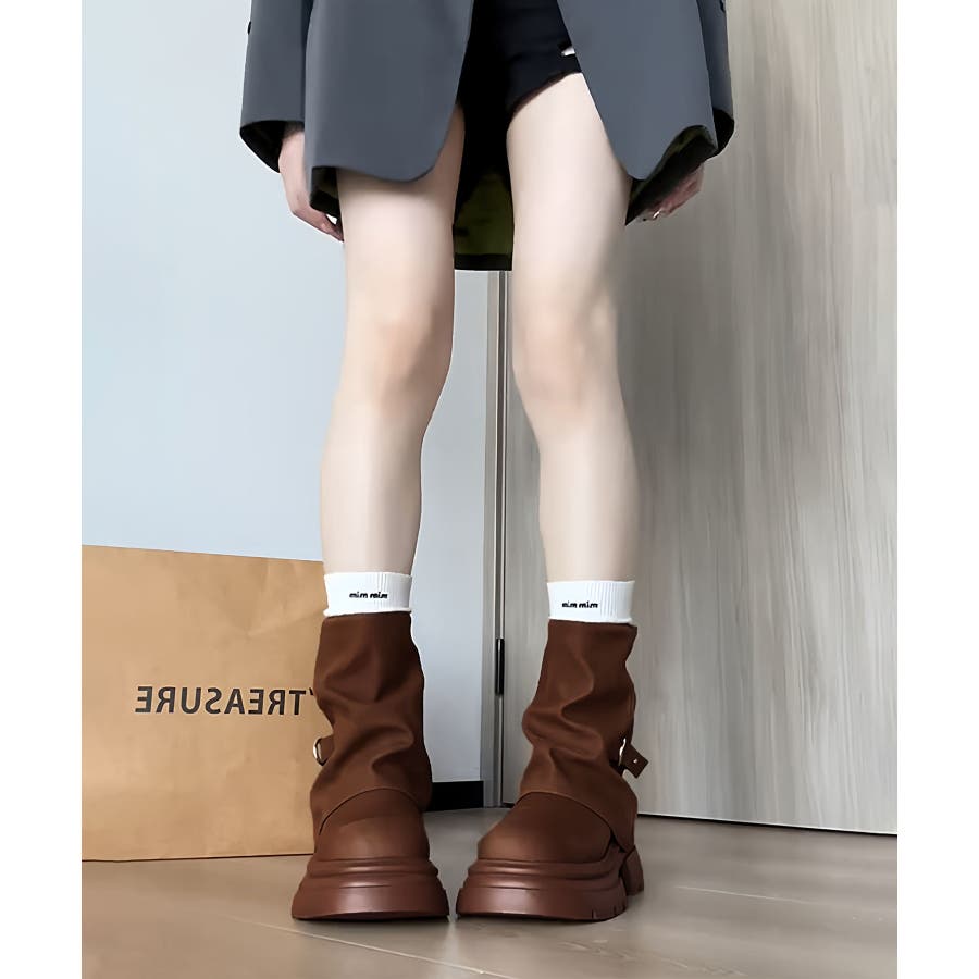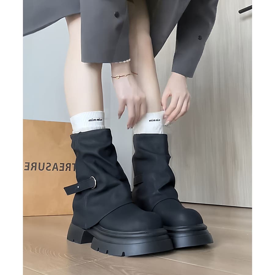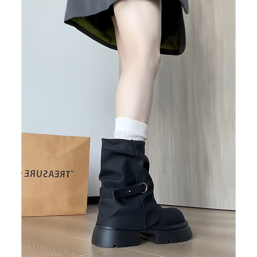 自然に広がる裾と、程よく下のボリュームが出る溜まり具合が脚を綺麗に見せてくれる1本です。履くだけで足元が映える厚底ブーツになります。