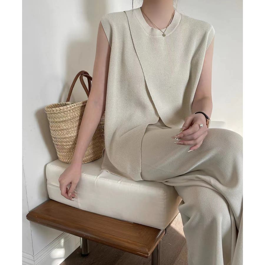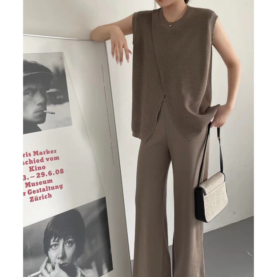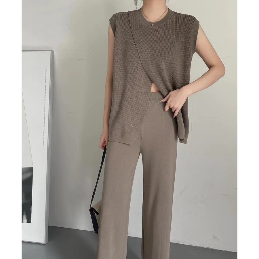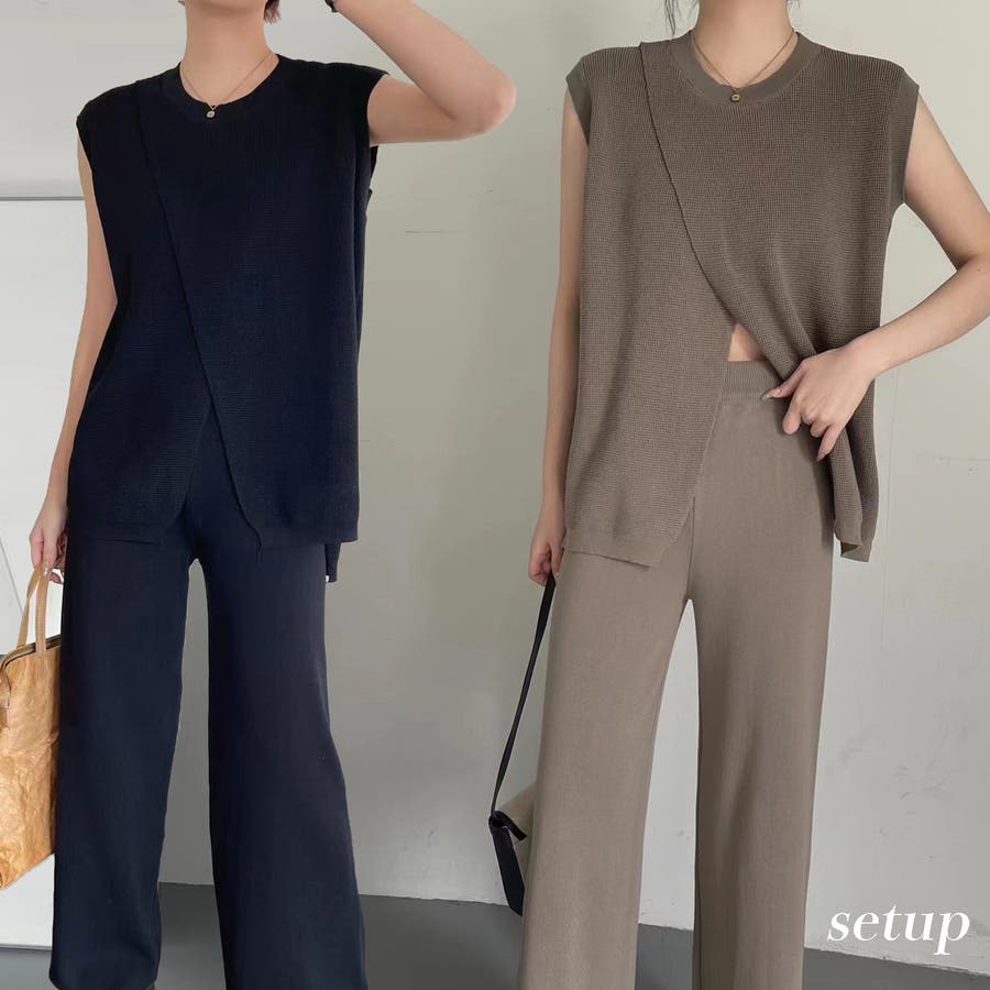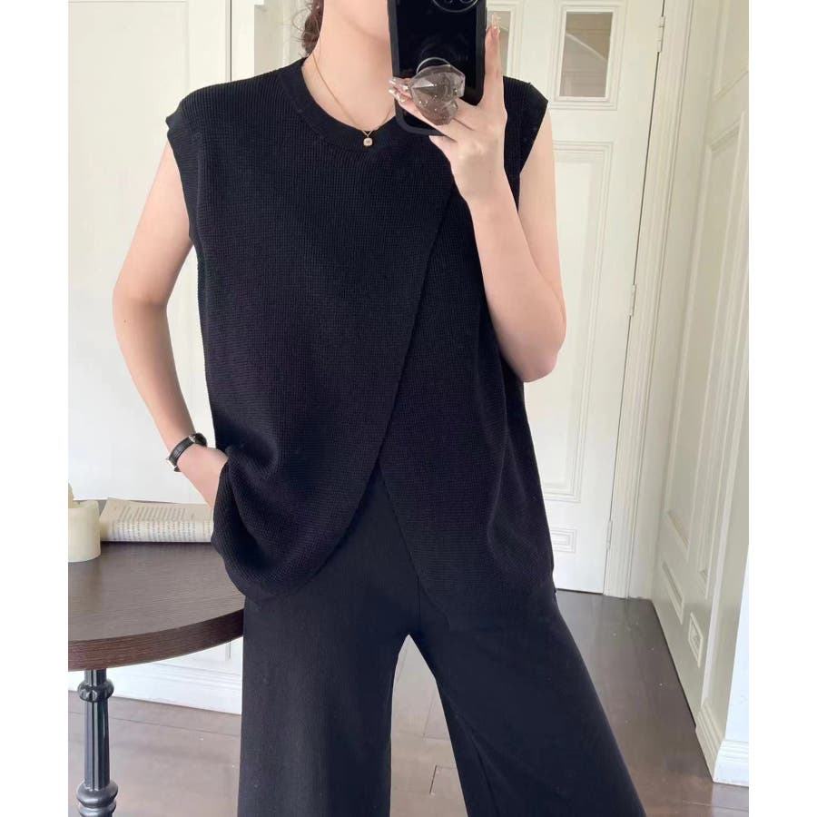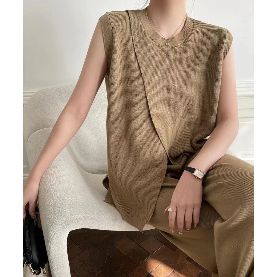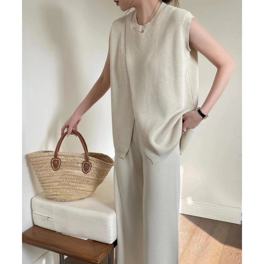 【Banico】ラウンドネックで、ボディが斜めに分かれたオーバーレイデザインのニット・ノースリーブ無地ベスト。生地はレーヨン100%で、柔らかく快適な着心地です。同色のボトムスと合わせるとよりスタイリッシュに。