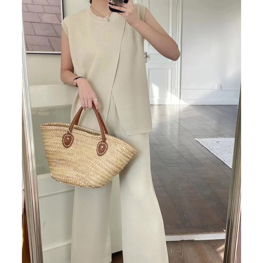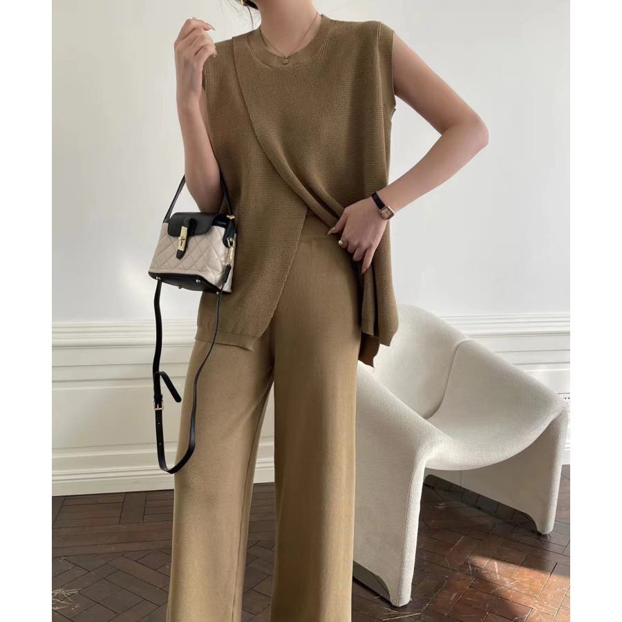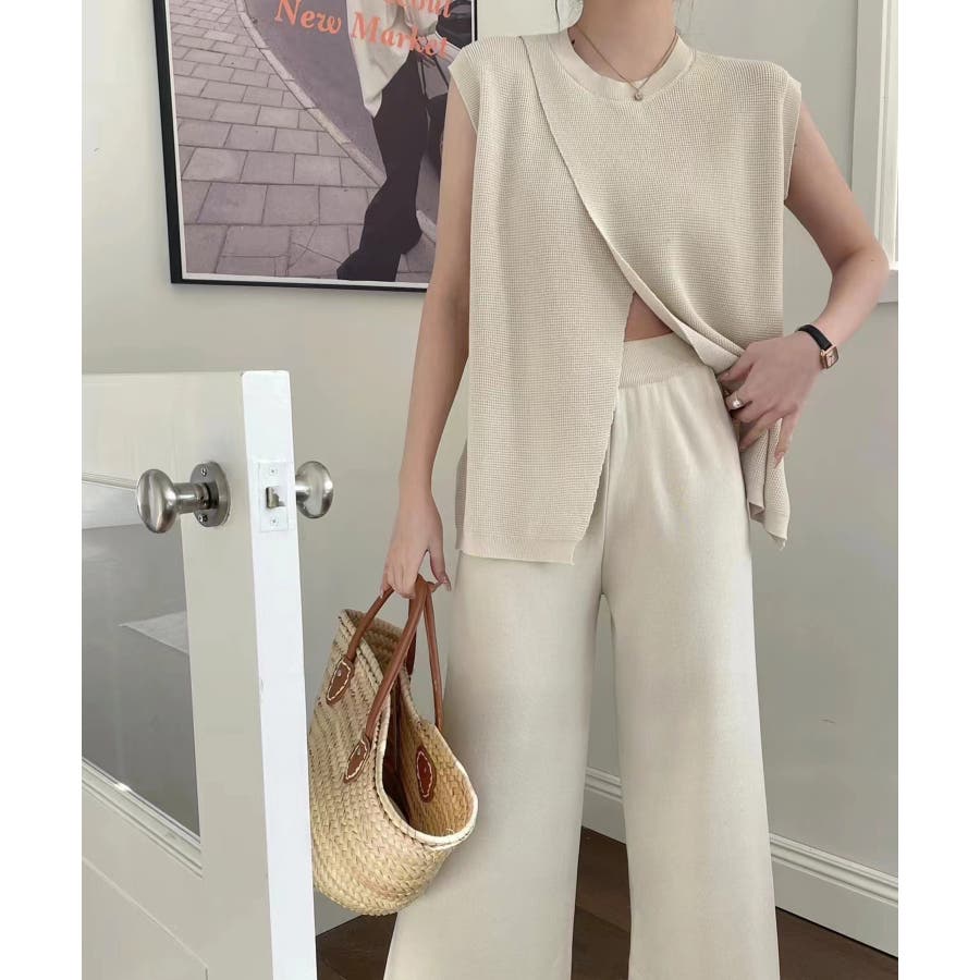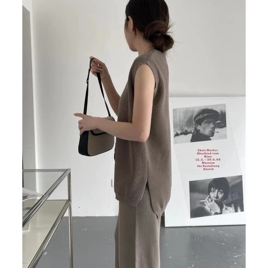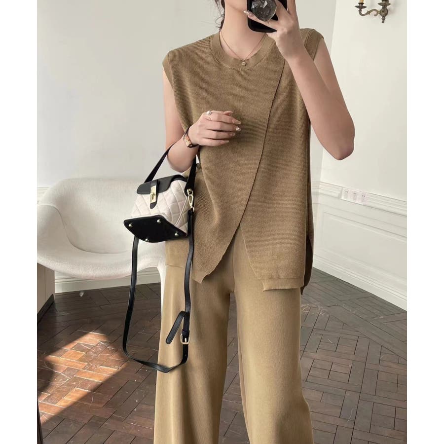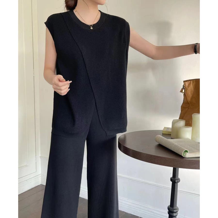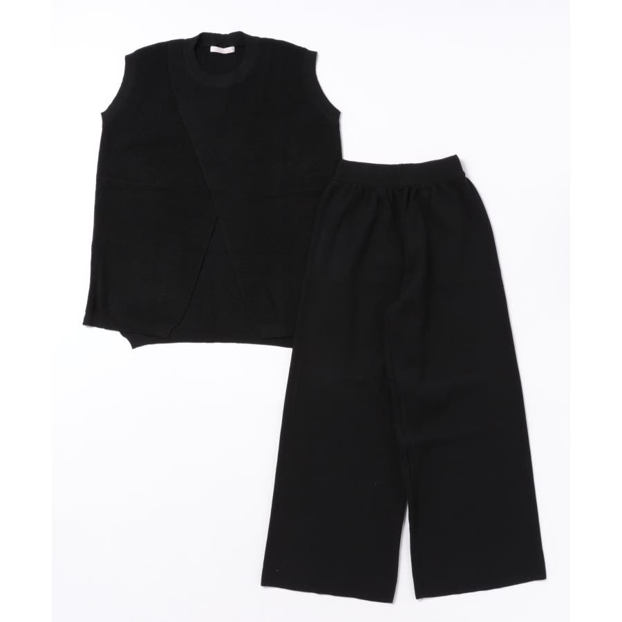 【Banico】ラウンドネックで、ボディが斜めに分かれたオーバーレイデザインのニット・ノースリーブ無地ベスト。生地はレーヨン100%で、柔らかく快適な着心地です。同色のボトムスと合わせるとよりスタイリッシュに。