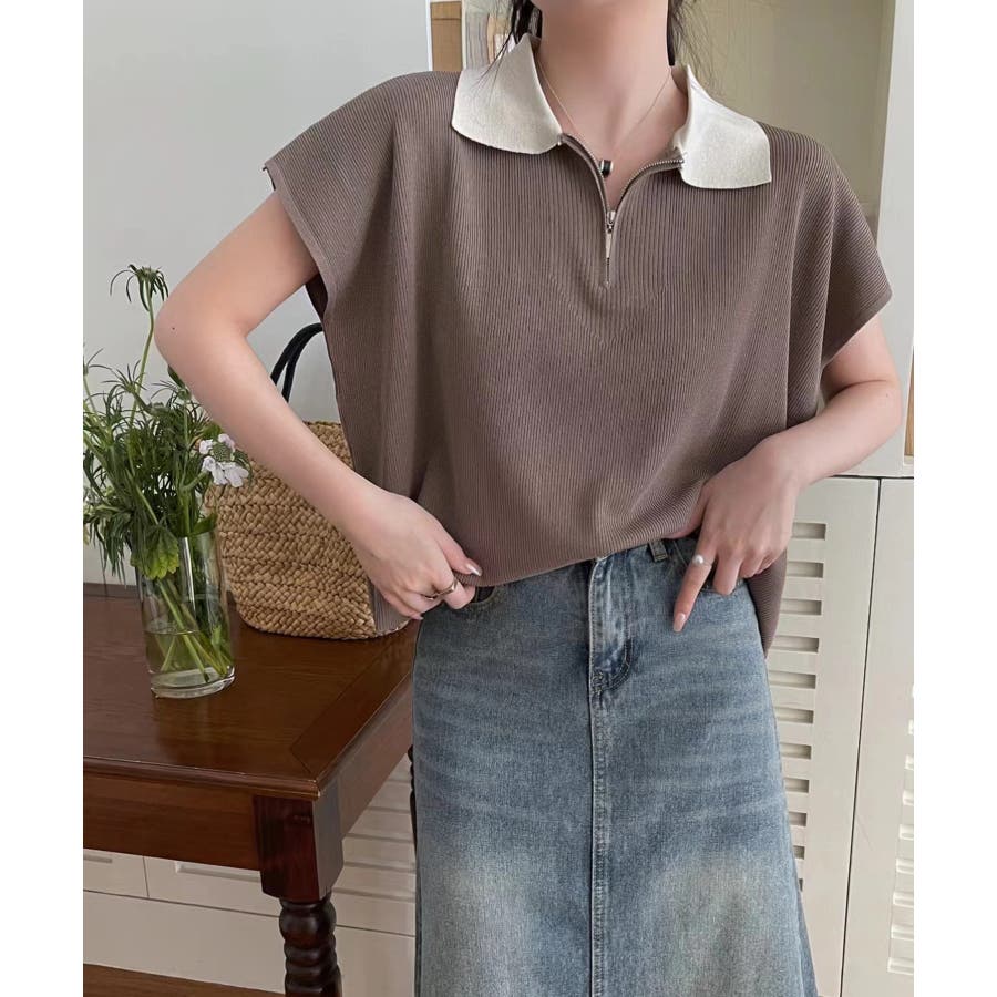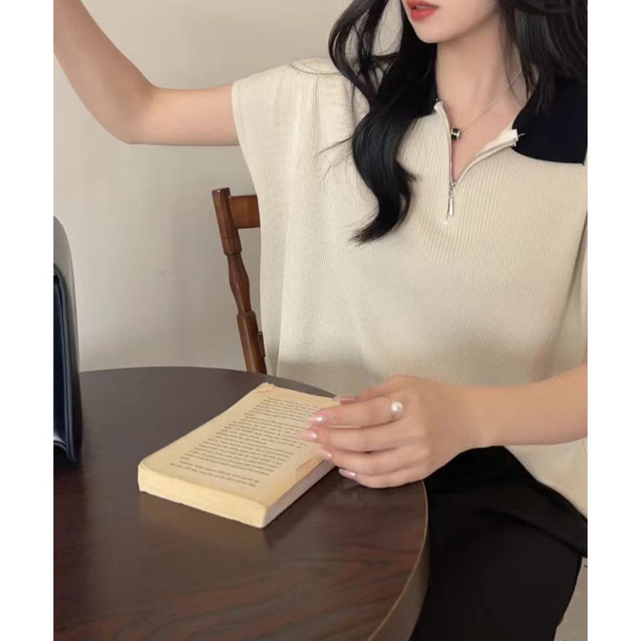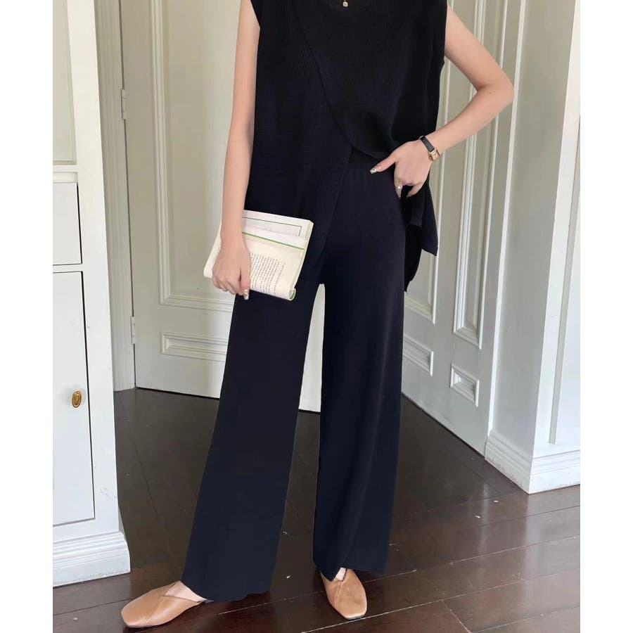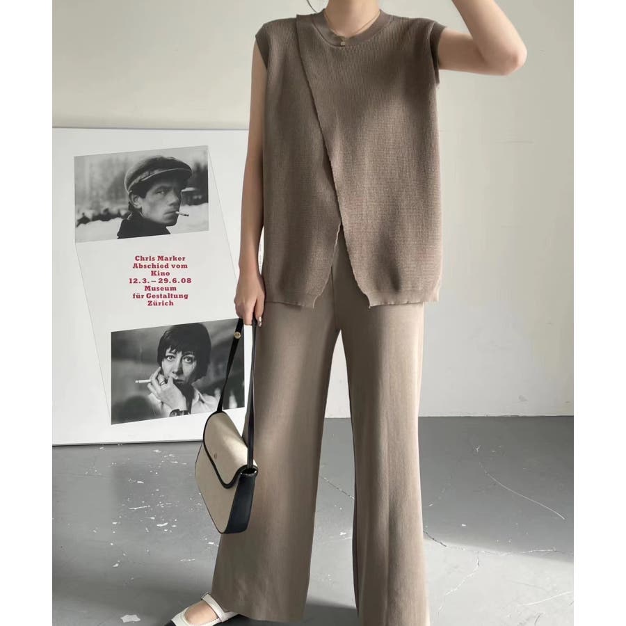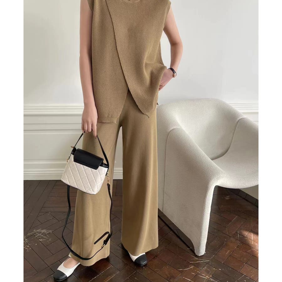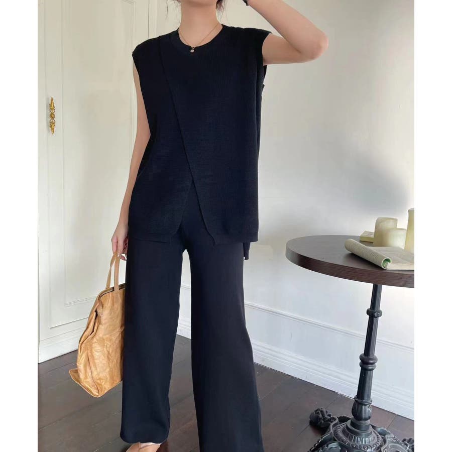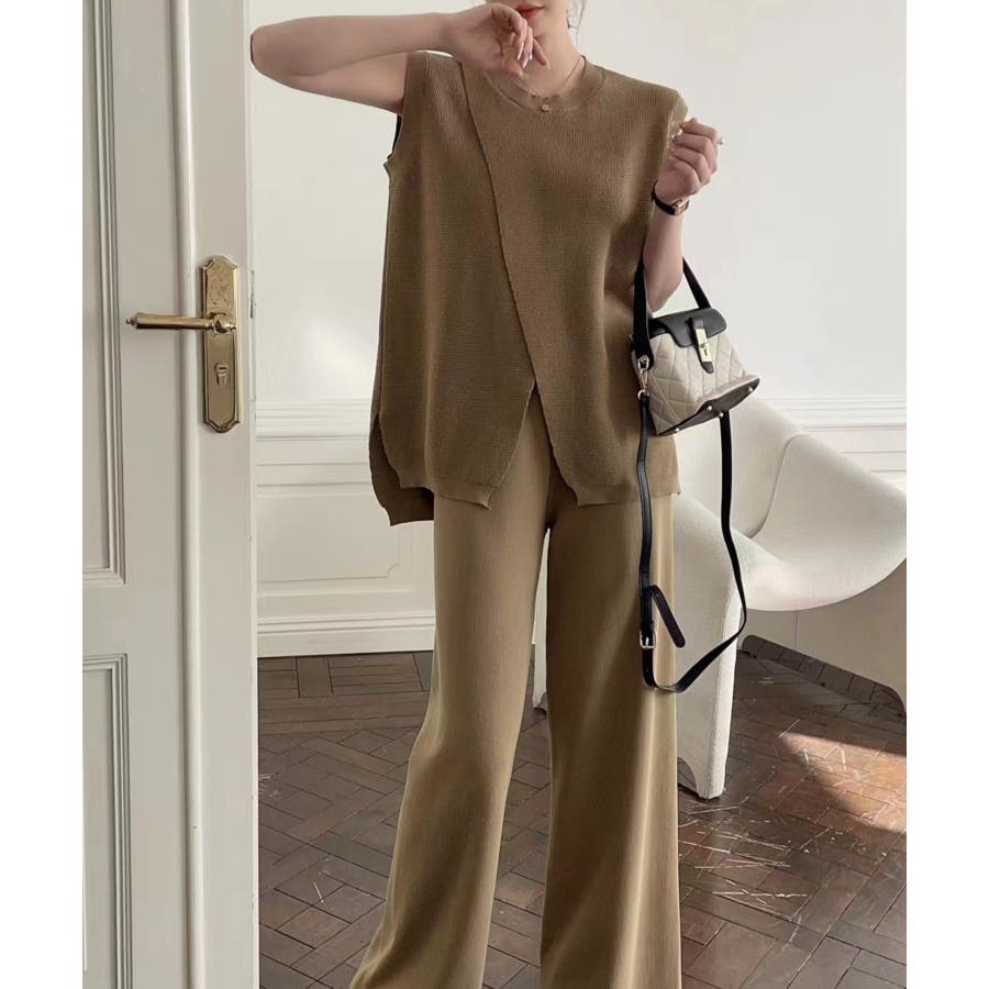 【Banico】ラウンドネックで、ボディが斜めに分かれたオーバーレイデザインのニット・ノースリーブ無地ベスト。生地はレーヨン100%で、柔らかく快適な着心地です。同色のボトムスと合わせるとよりスタイリッシュに。