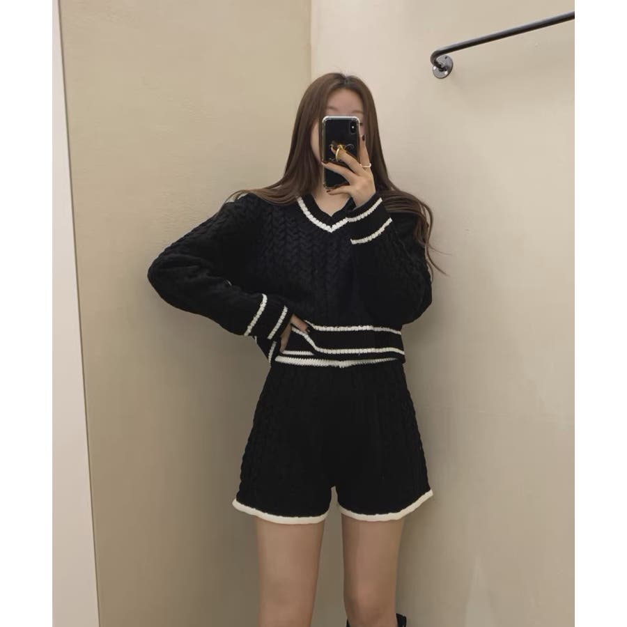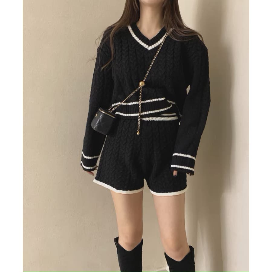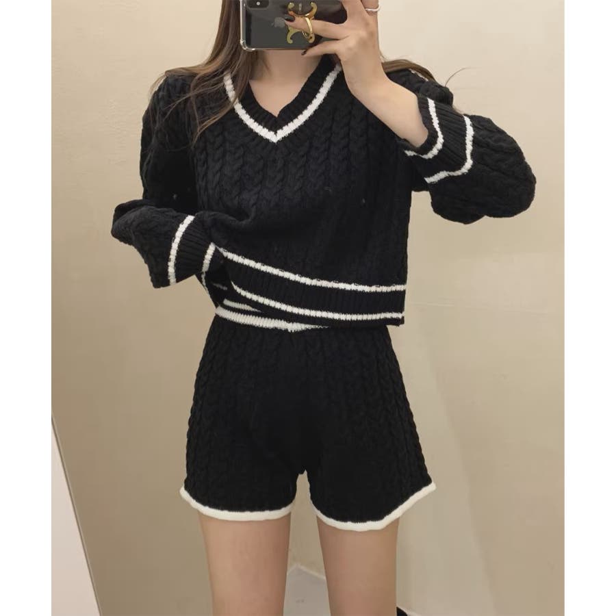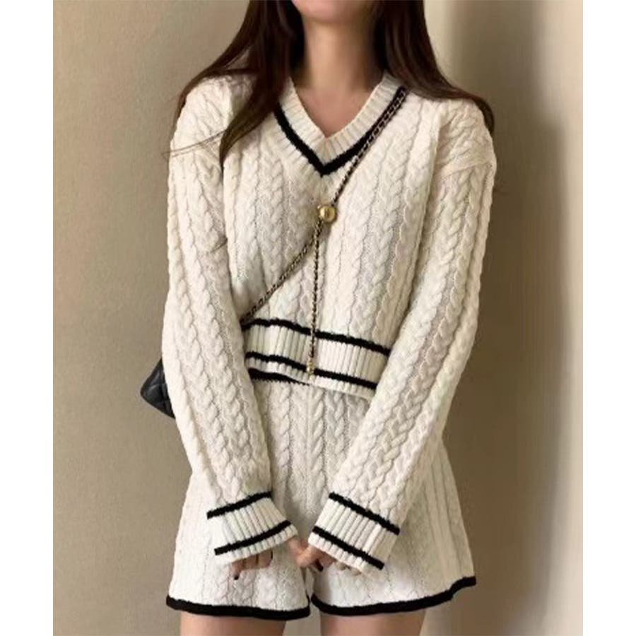 【Jasmine】セットアップ Vネックニットプルオーバー+ニットショートパンツ…