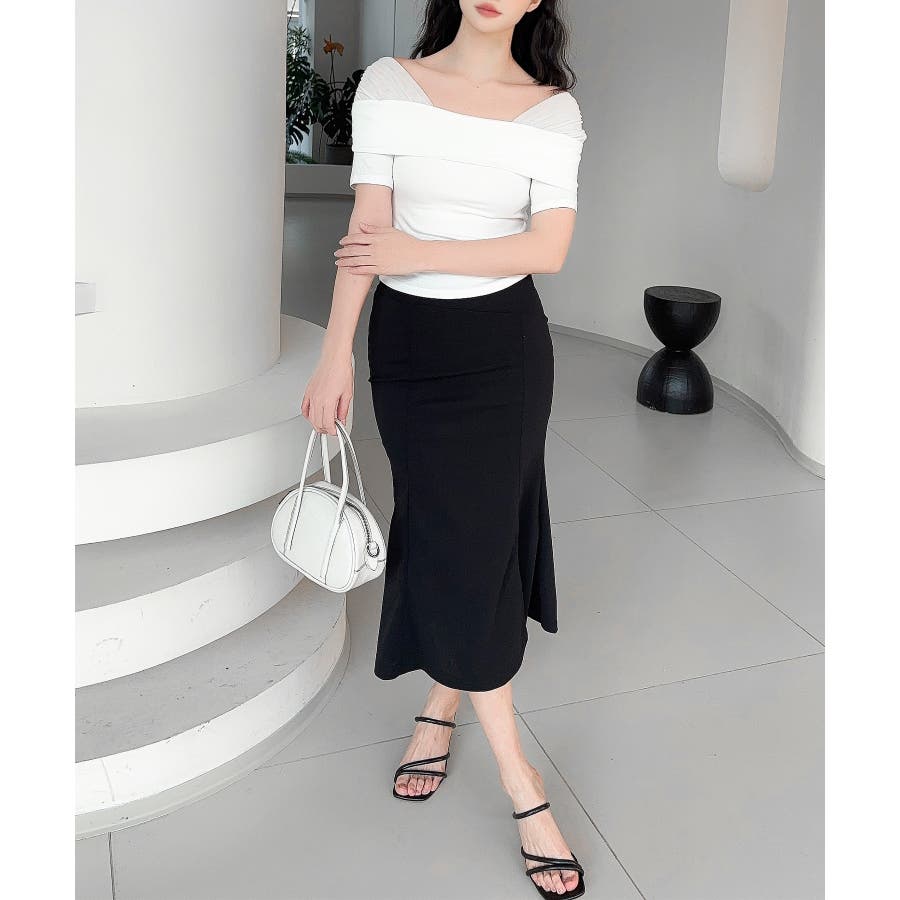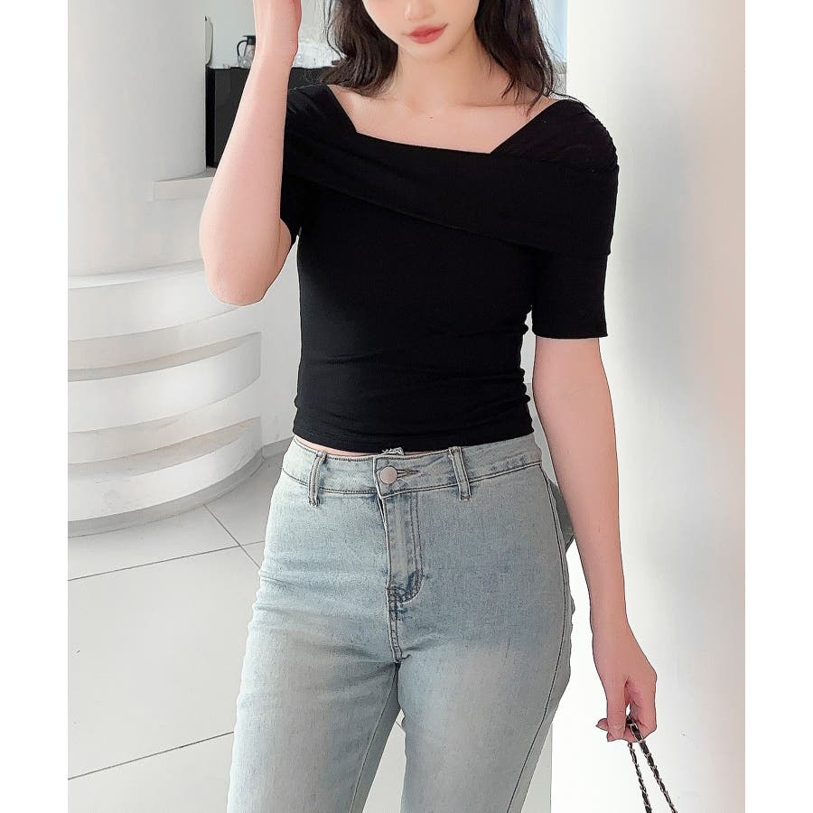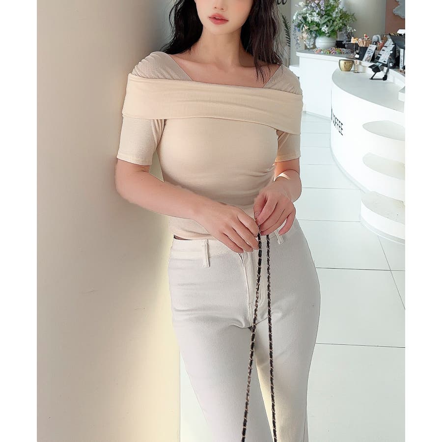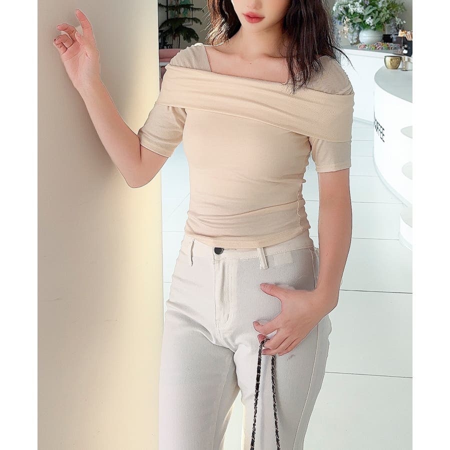 デコルテラインをきれいに見せるオフショルデザインのTシャツ。