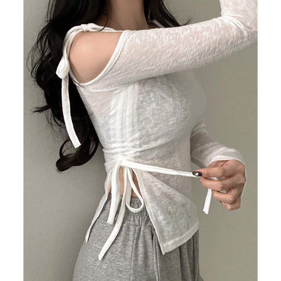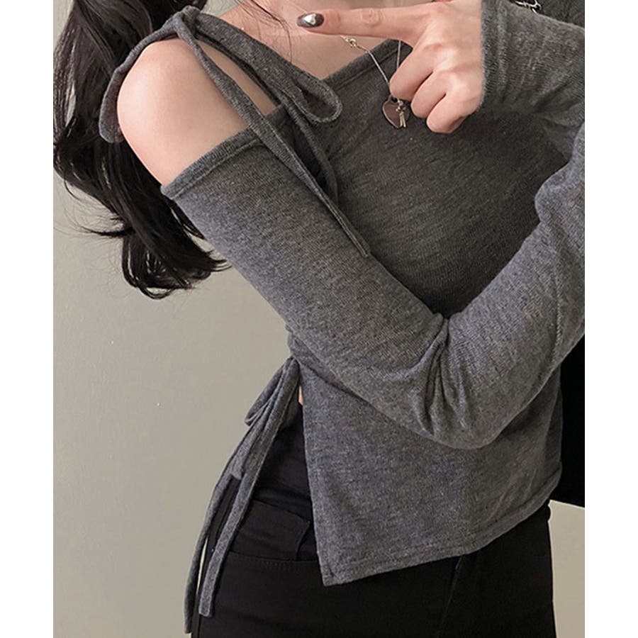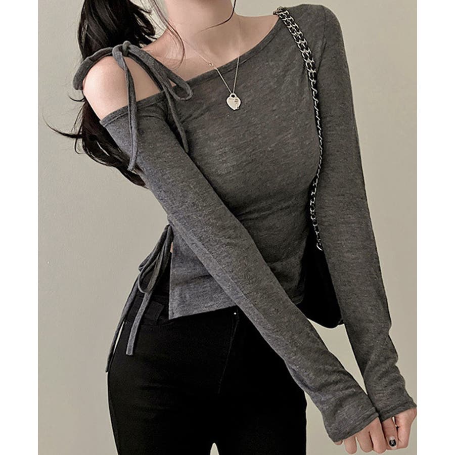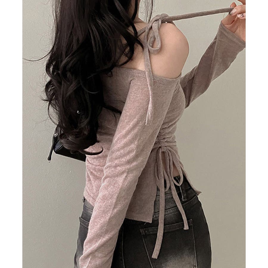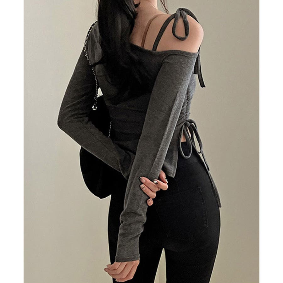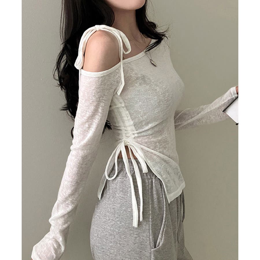 ■POINT ―――――――・肩見せデザイン:ヘルシーな肌見せが、程よい抜け感を演出。 ・シャーリング仕様:ボディラインにフィットするシャーリングで、美しいシルエットを強調。 ・リボンディテール:肩のリボンがアクセントになり、甘さと可愛らしさをプラス。 ・ショート丈デザイン:ハイウエストのボトムスやスカートと相性抜群で、スタイルアップ効果も◎・軽やかな素材感:柔らかく動きやすい素材で、春夏シーズンにぴったり。